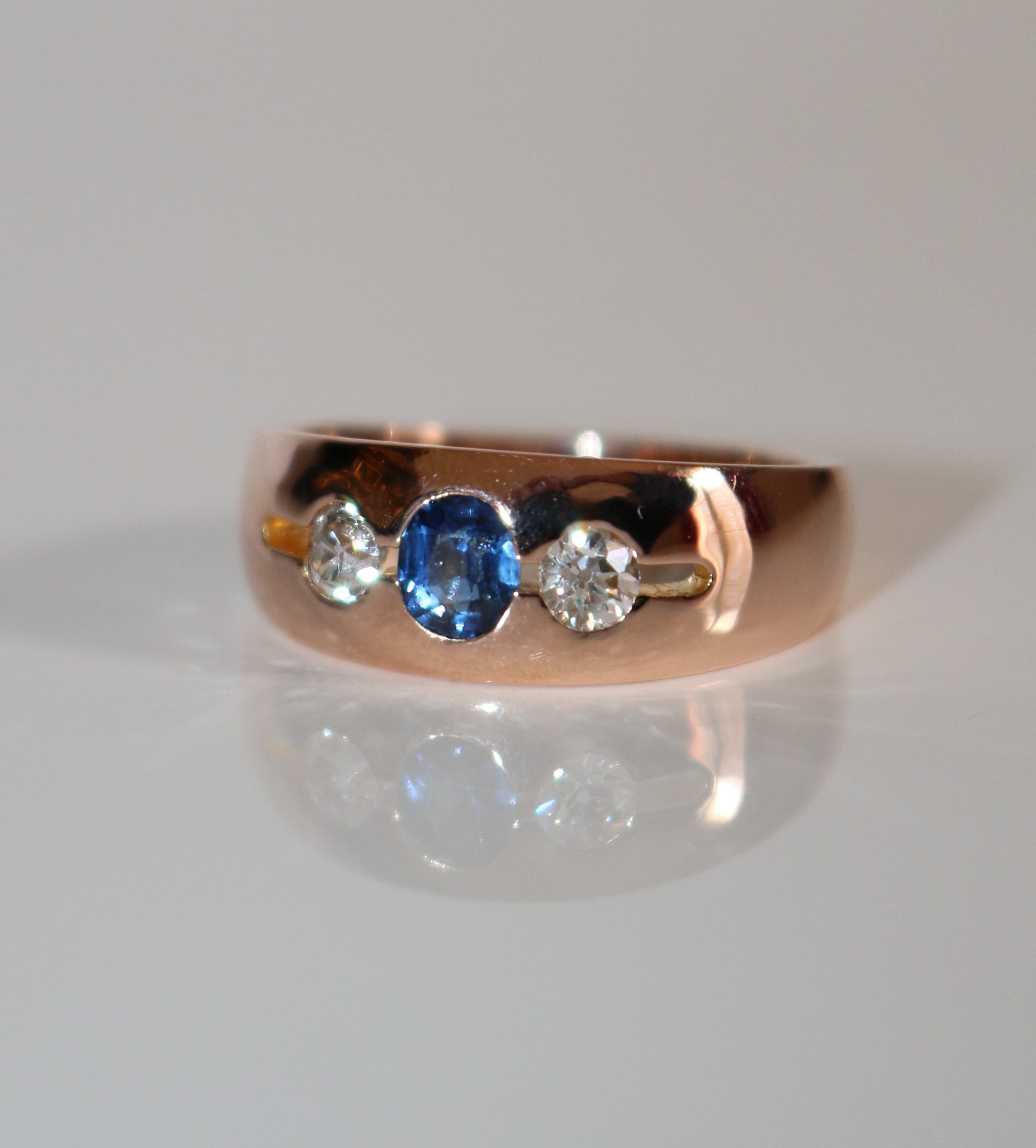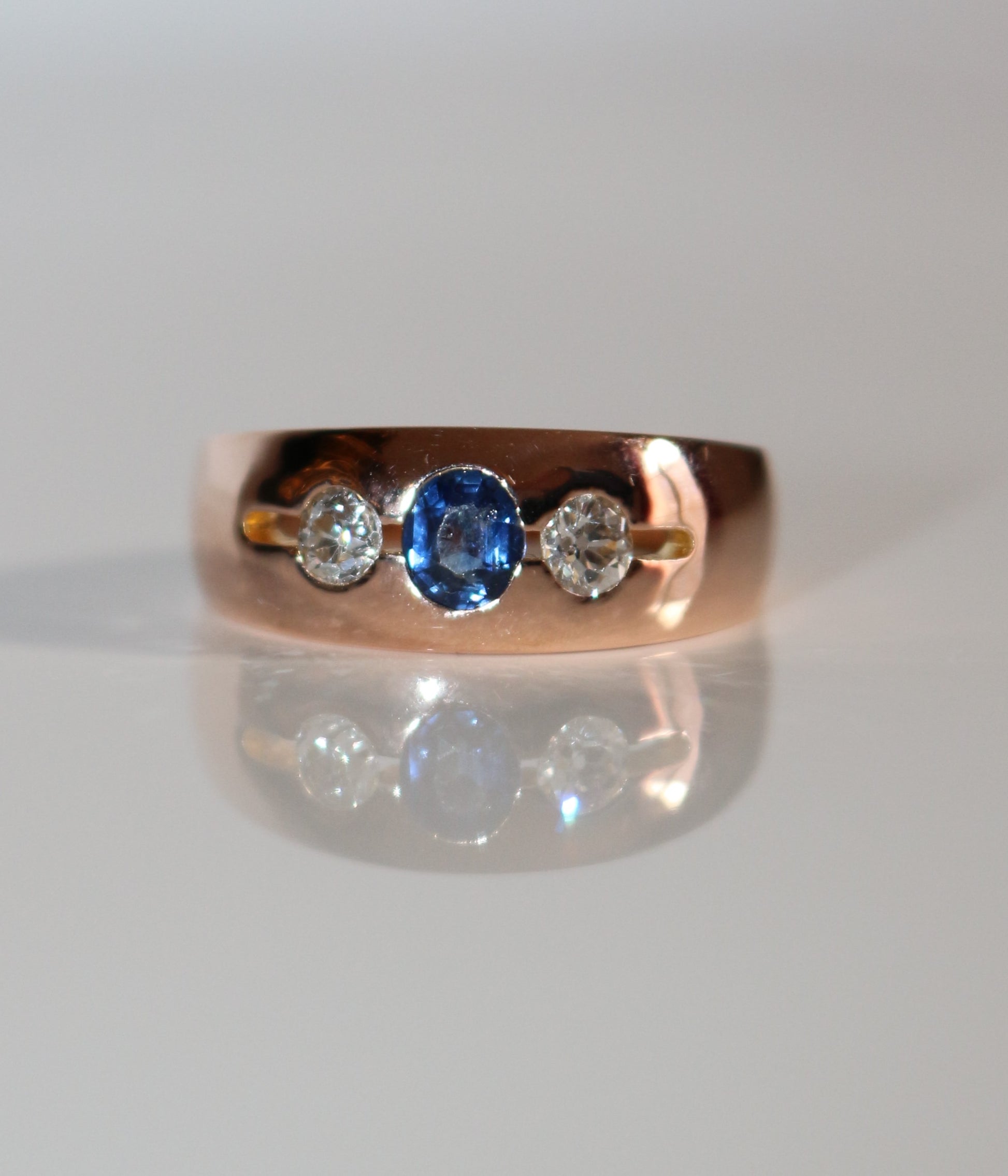 Bague bandeau ornée de deux diamants taille ancienne, entourant un saphir central, taille ovale, en or rose 18 carats 750/1000e, en serti masse.