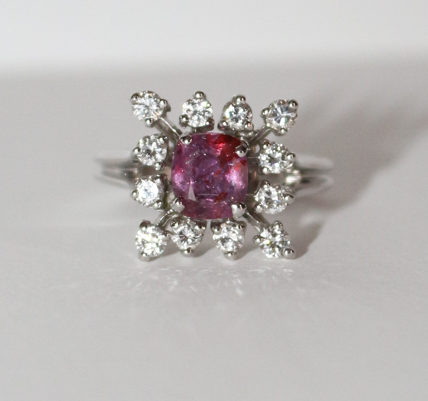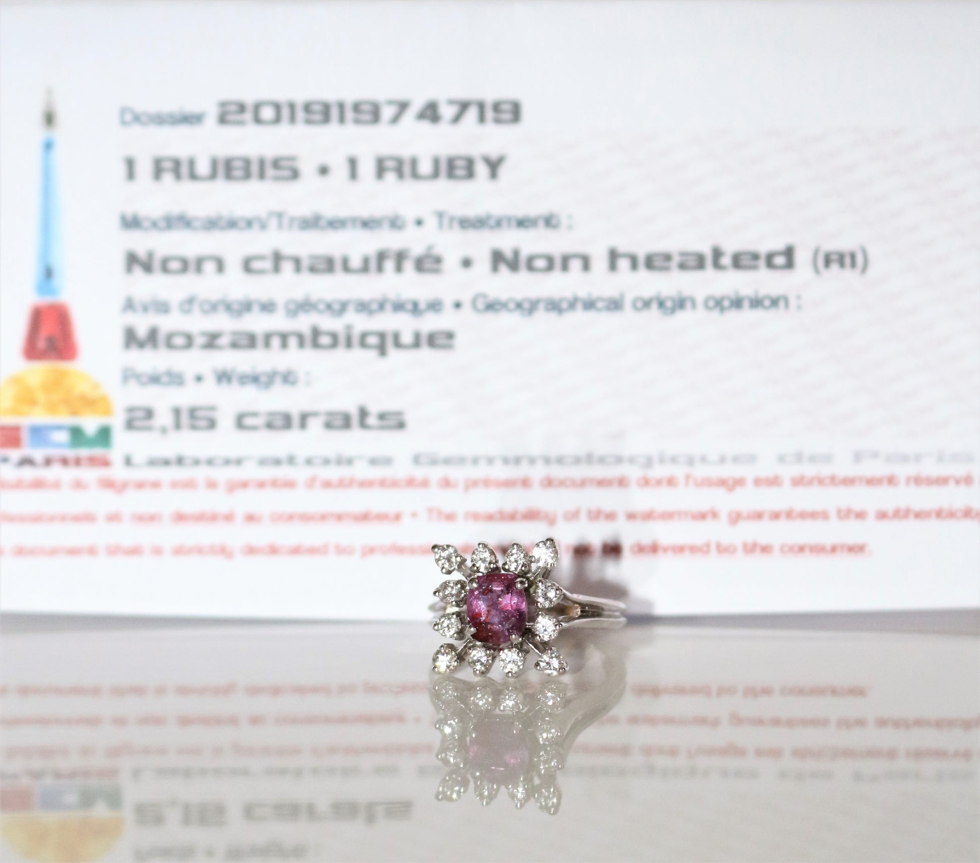 Rubis : 2,15 cts, quelques micro égrisures (visibles à la loupe x 10), présence de cristaux, couleur rose-rouge, provenance Mozambique