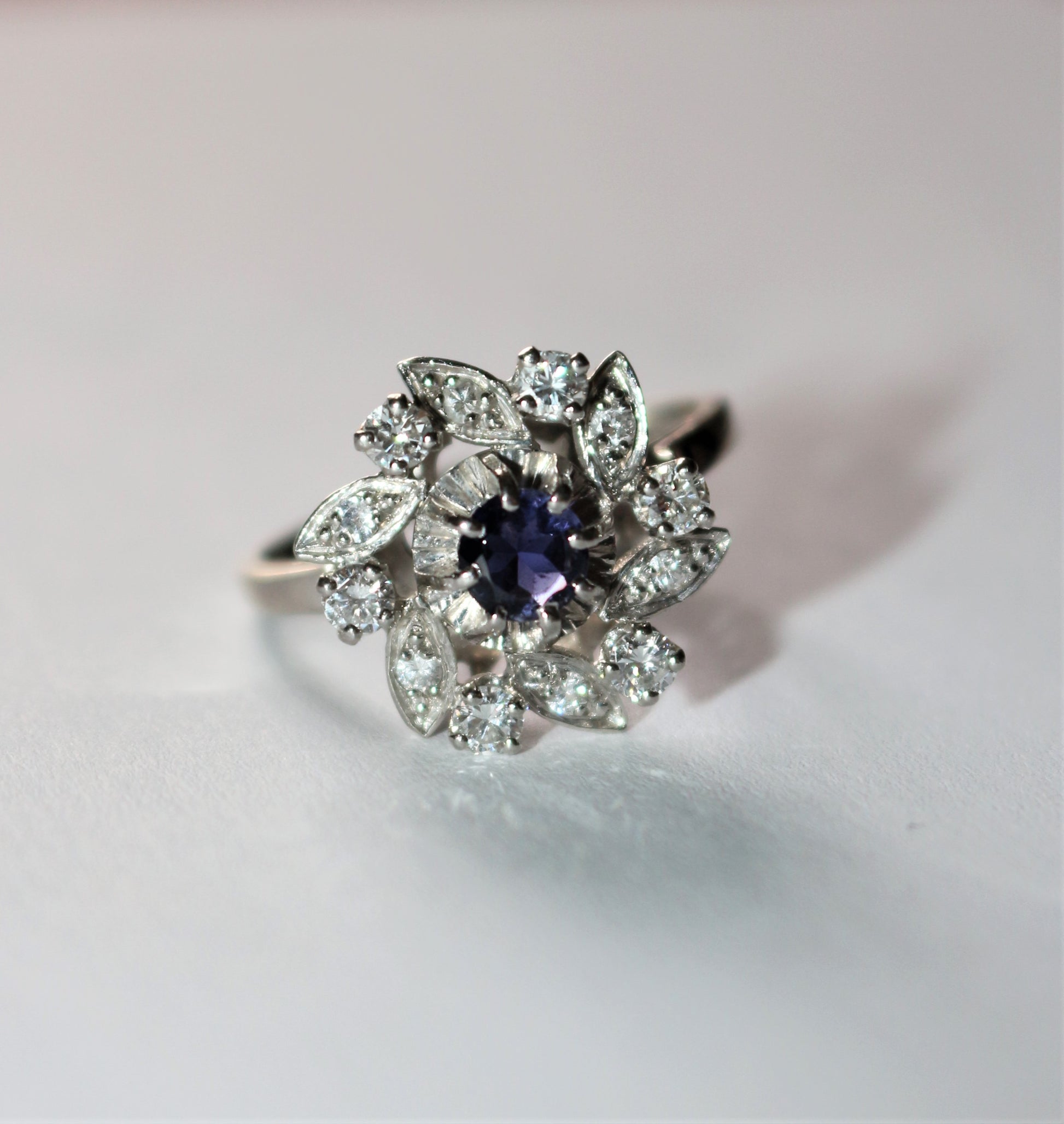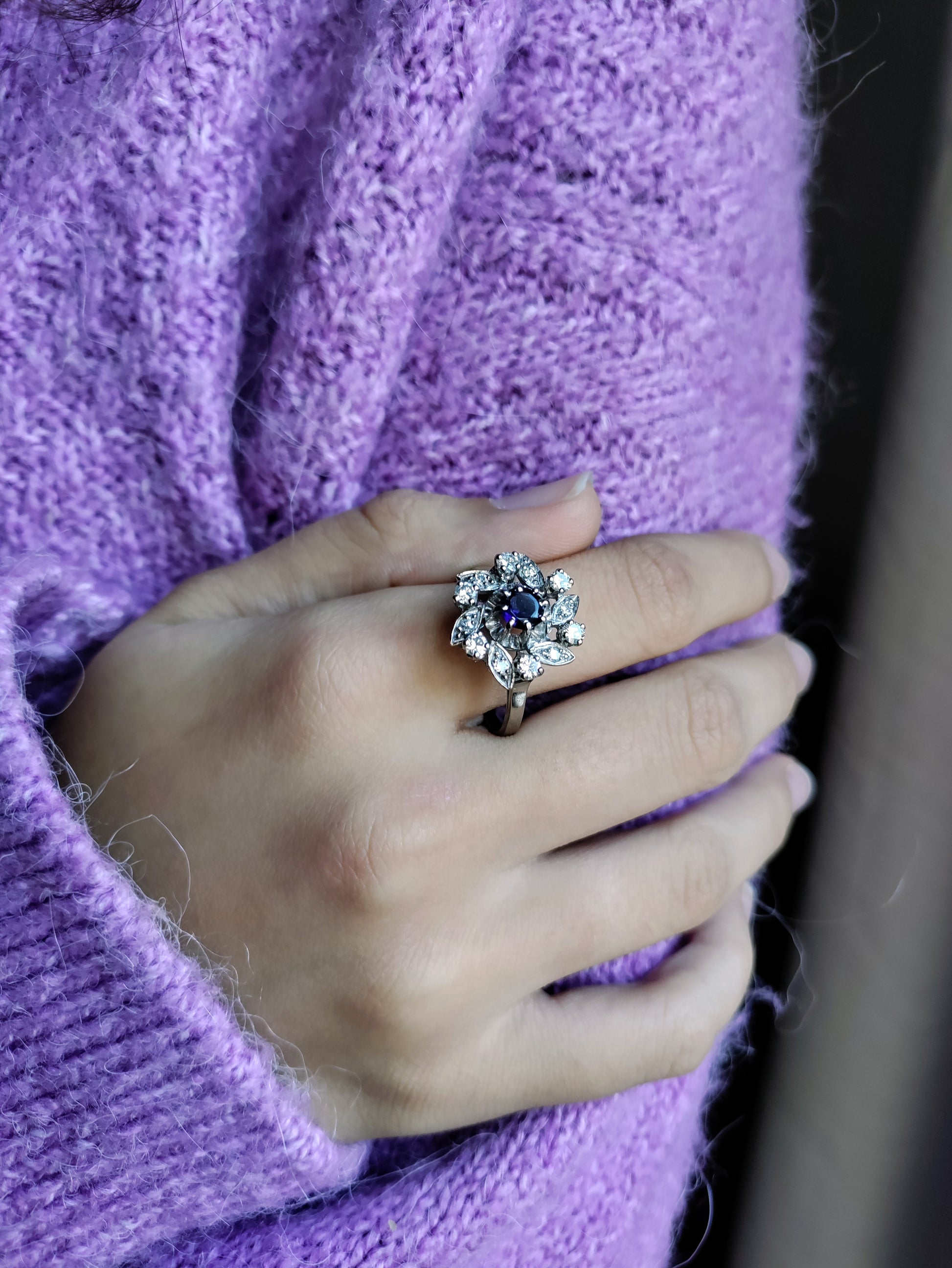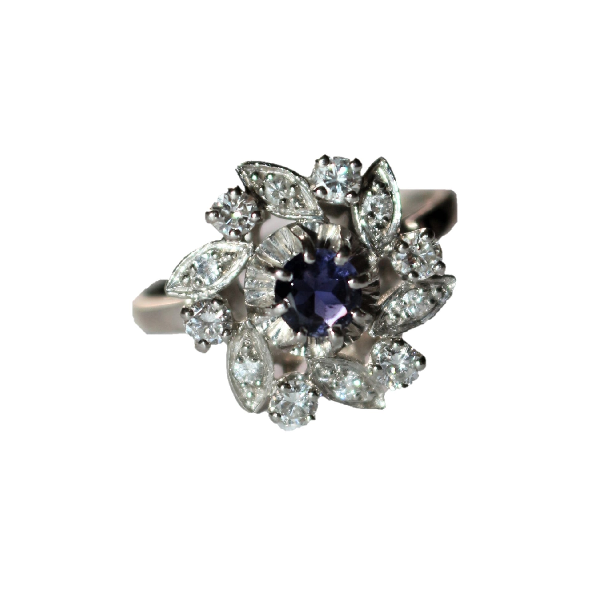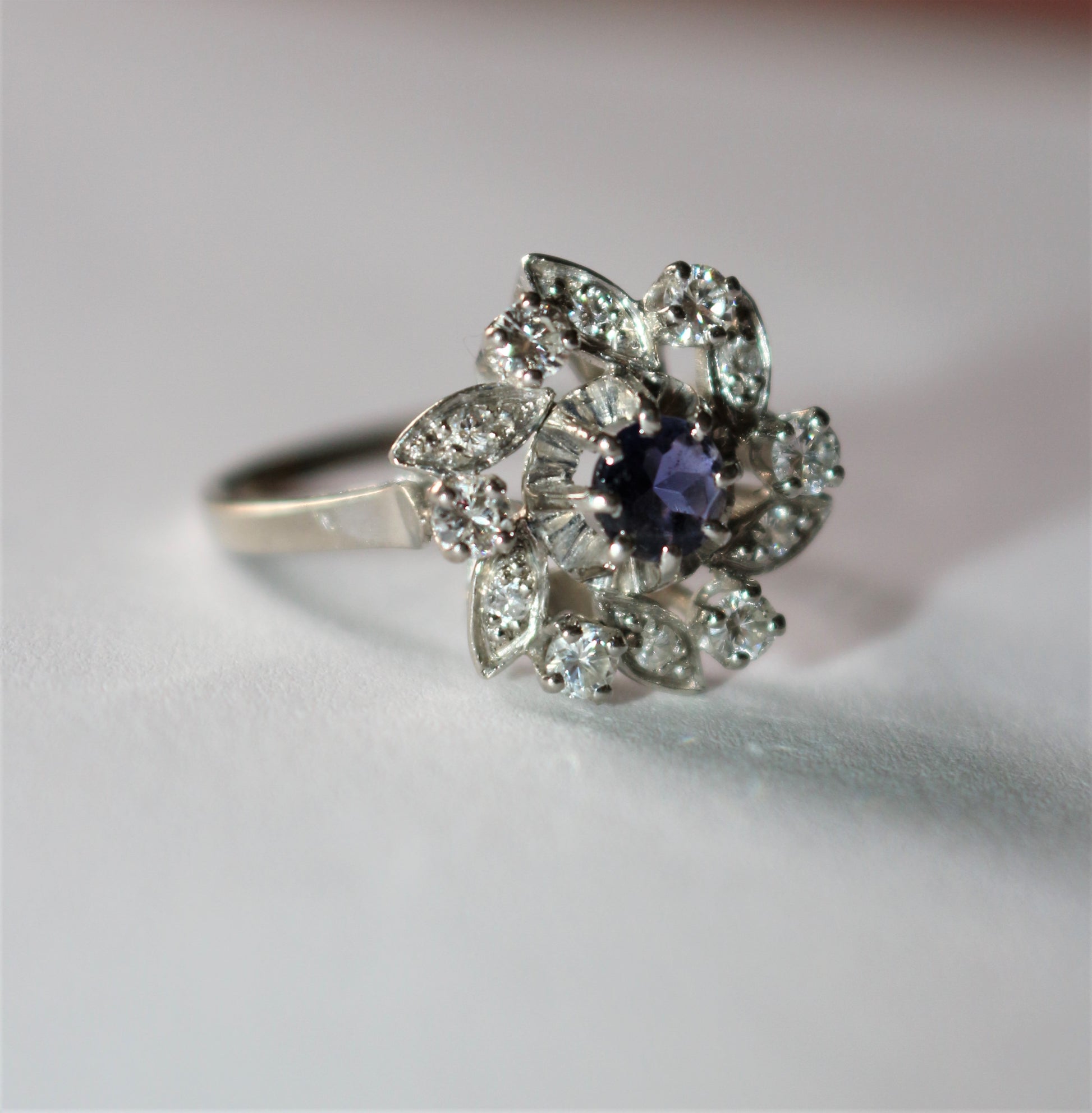 Bague Fleur tourbillon en platine, ornée d'une cordiérite ronde de 4 mm, dans un entourage de diamants taillés brillant : 6 diamants de 3 mm de diamètre (0,60 ct) + 6 diamants de 1,5 mm de diamètre (0,12 ct) pour un total de 0,72 ct environ. Vintage.
