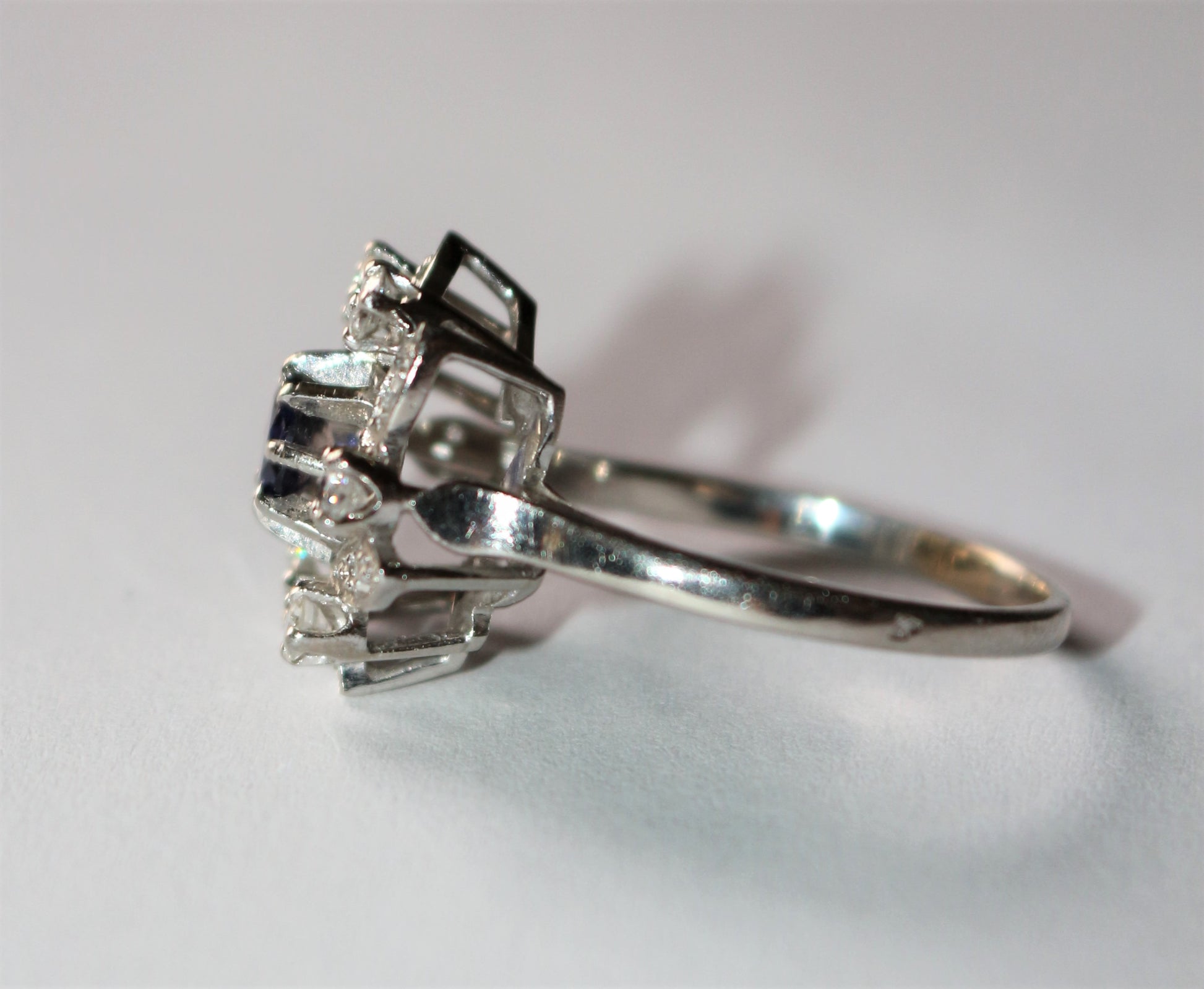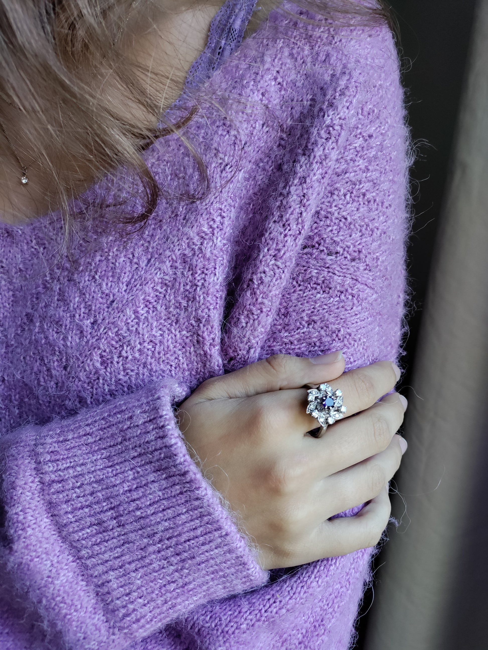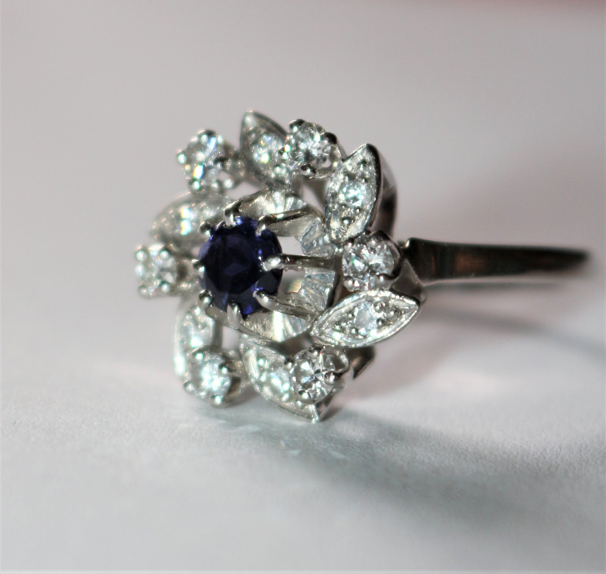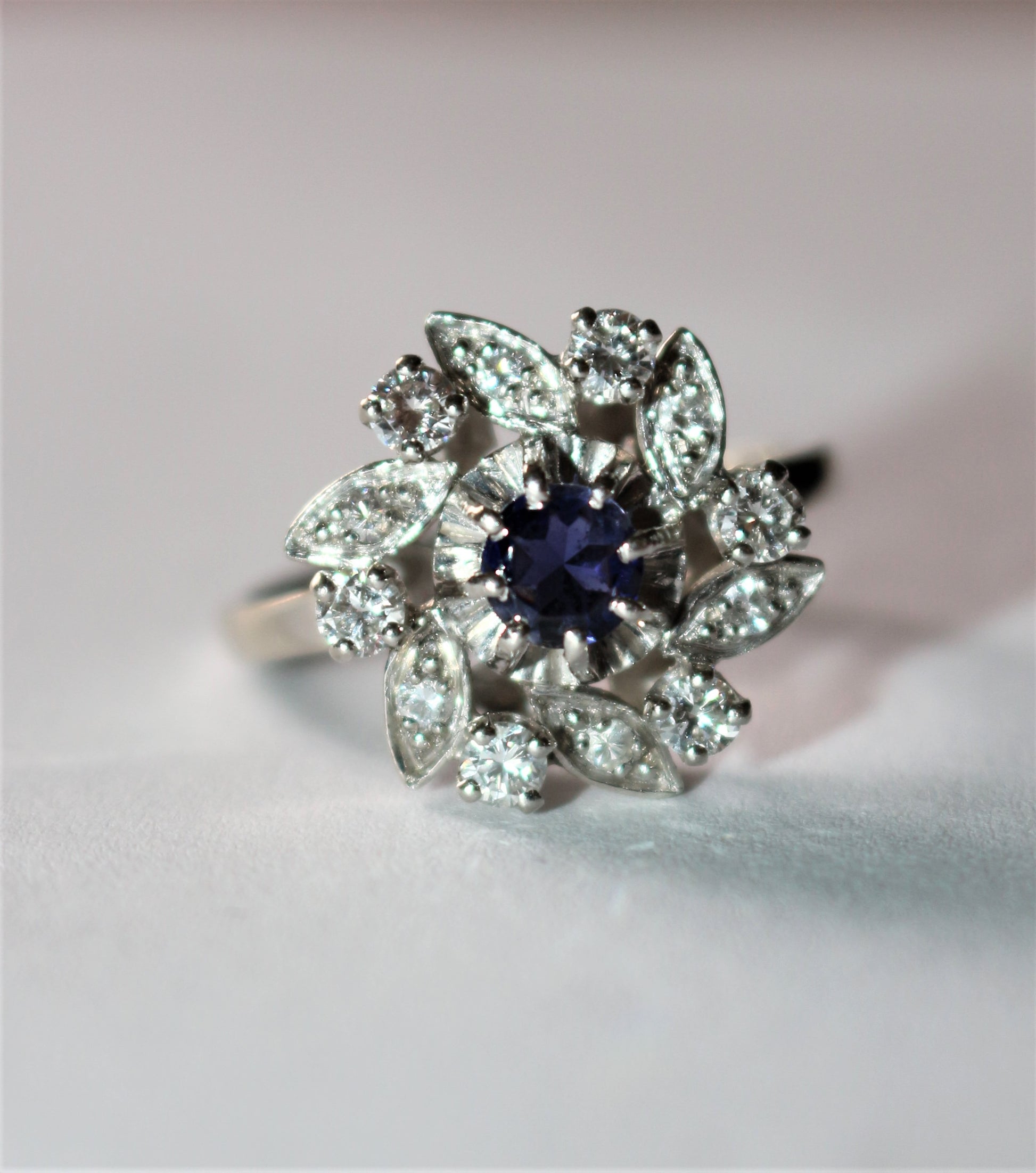 Bague Fleur tourbillon en platine, ornée d'une cordiérite ronde de 4 mm, dans un entourage de diamants taillés brillant : 6 diamants de 3 mm de diamètre (0,60 ct) + 6 diamants de 1,5 mm de diamètre (0,12 ct) pour un total de 0,72 ct environ. Vintage.