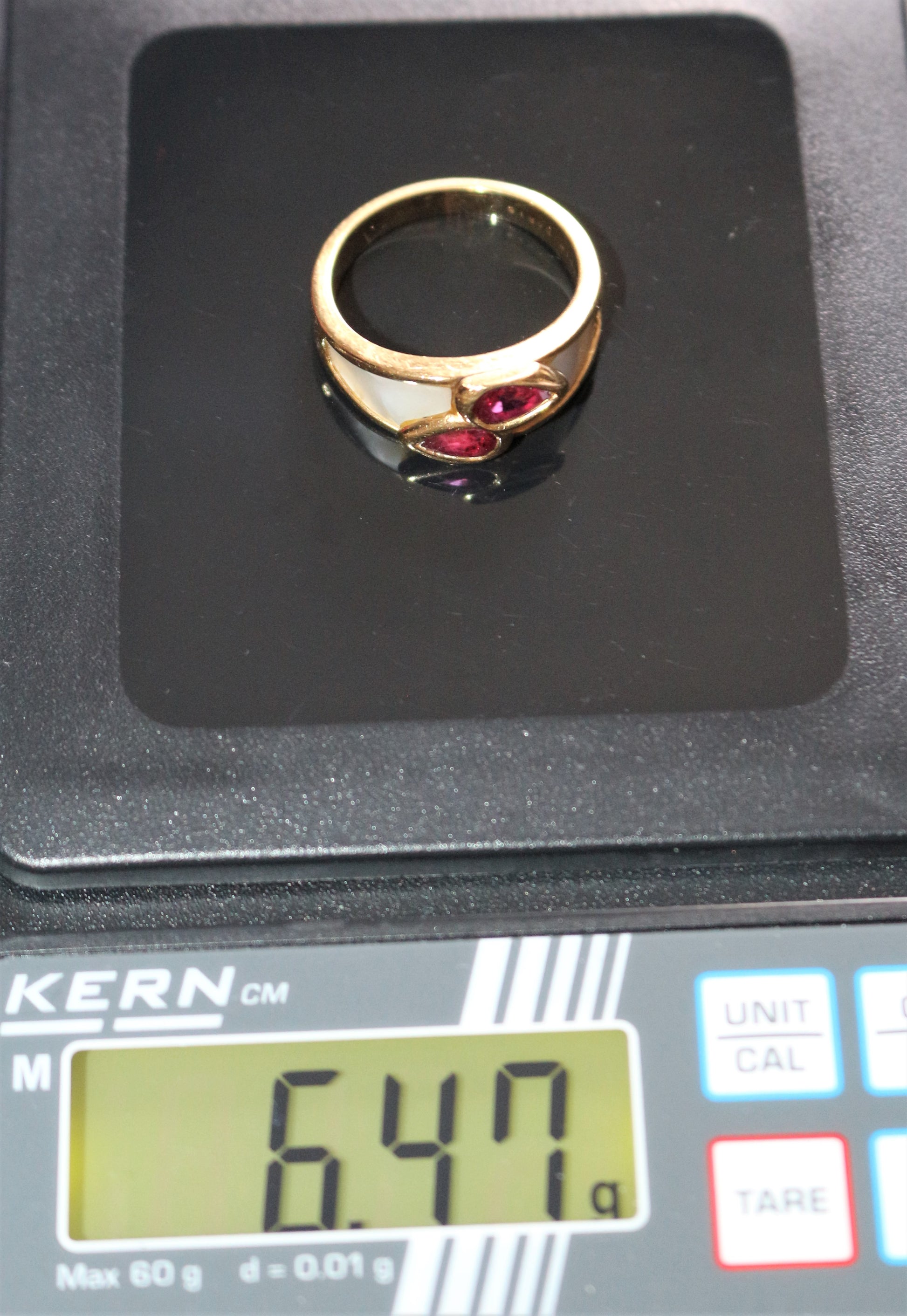 Bague MAUBOUSSIN "Nadia" années 90 en or jaune 750/1000e (18 carats) ornée de plaques de nacre, sertie de 2 rubis taille poire en serti clos, mesurant 6 / 4 mm et 5,5 / 3,5 mm