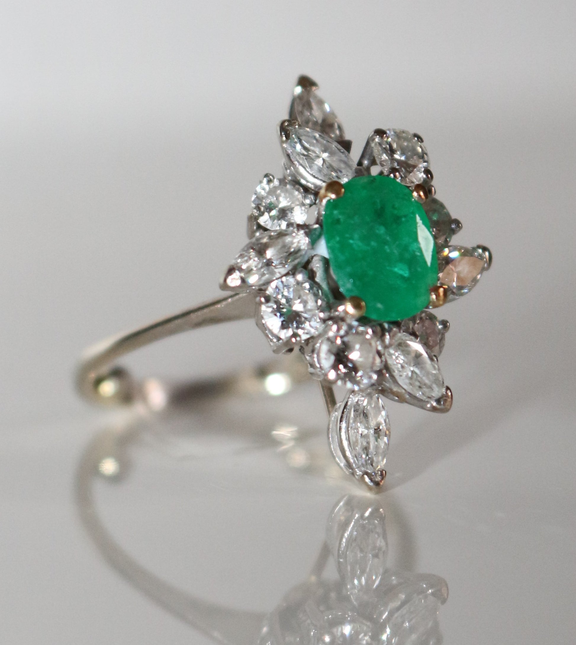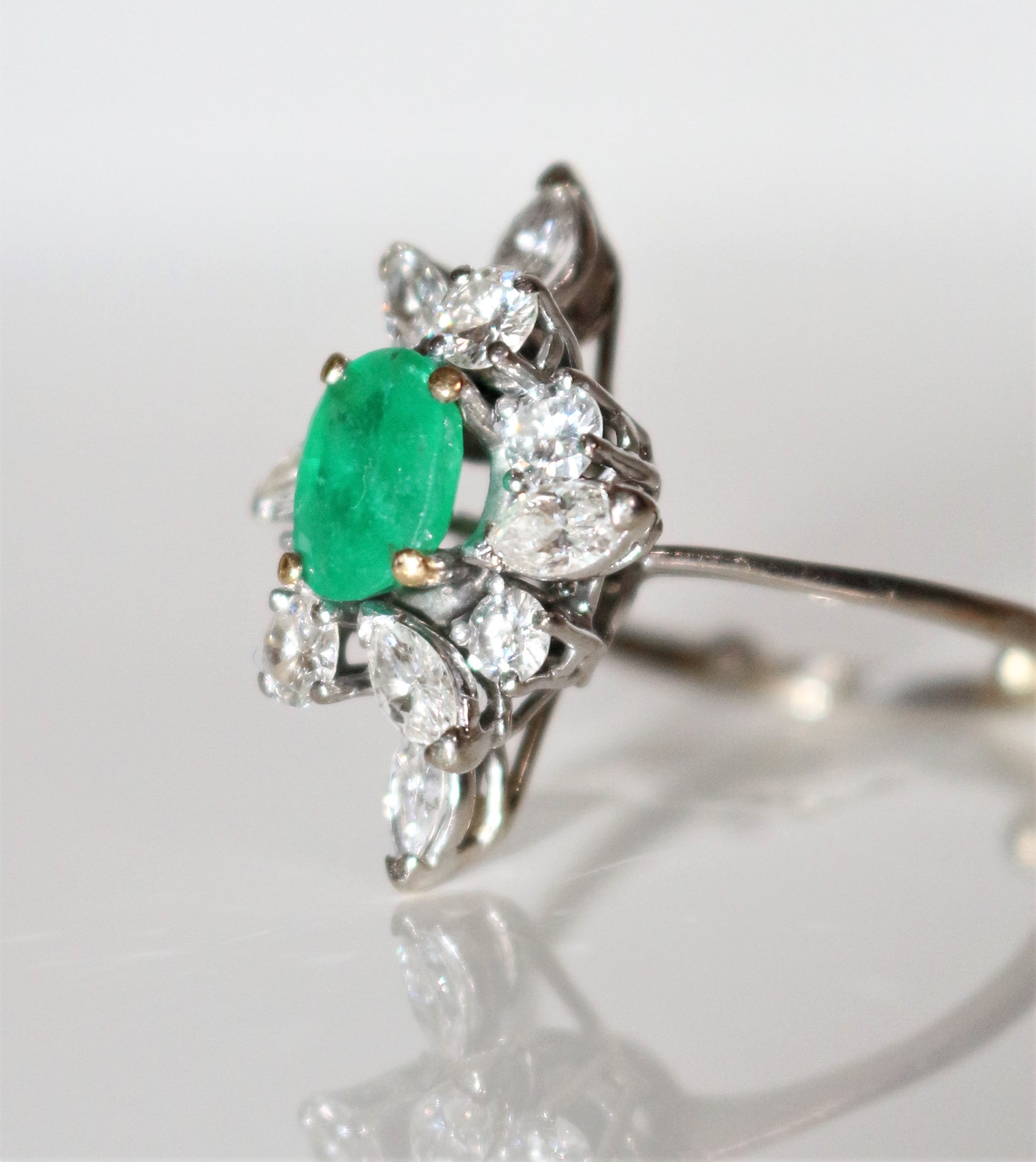 Bague de forme navette sertie d'une émeraude ovale (1 carat) entourée de 12 diamants ronds taille brillant et taille navette (2 carats), sur or gris 750/1000e (18k).
