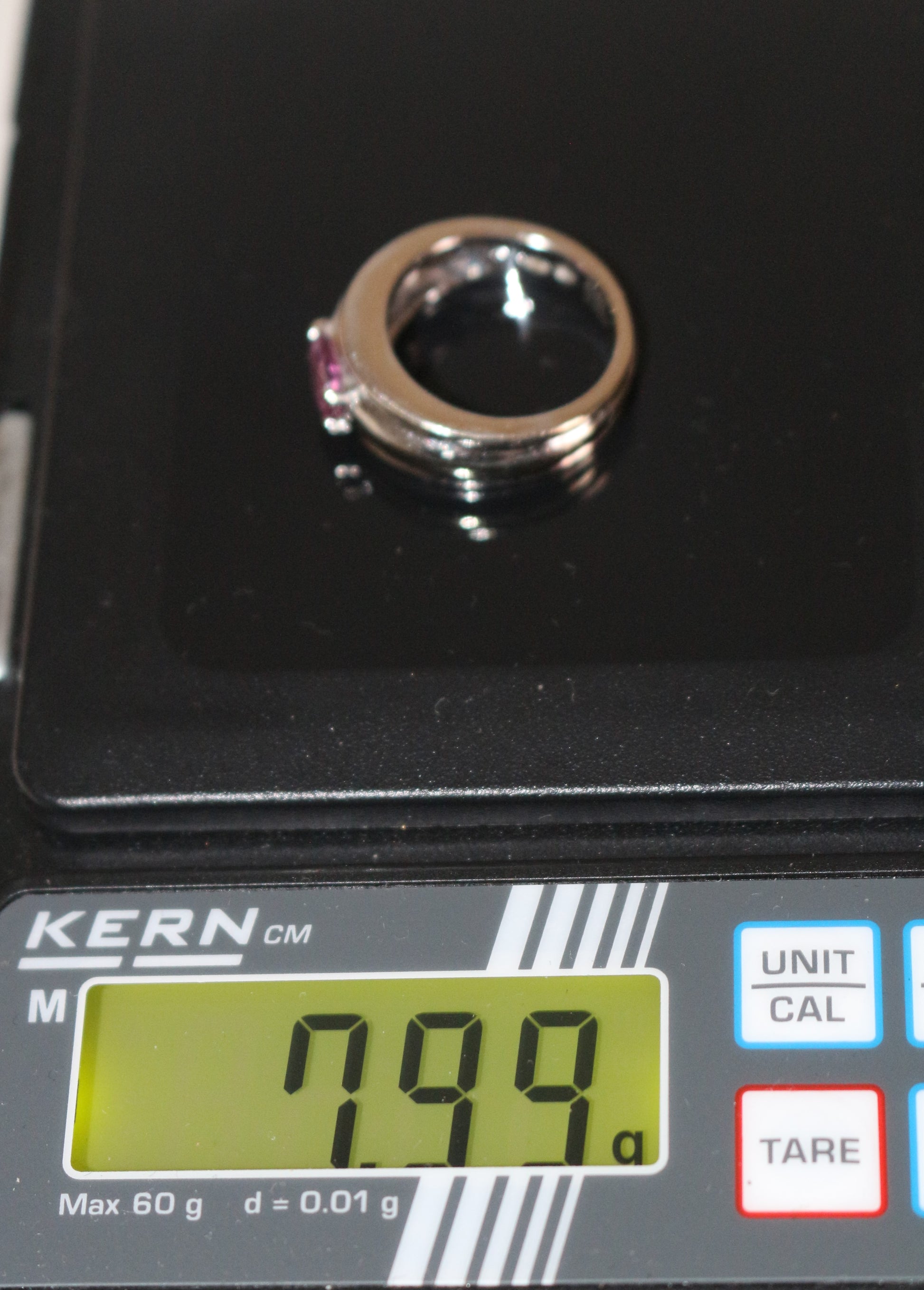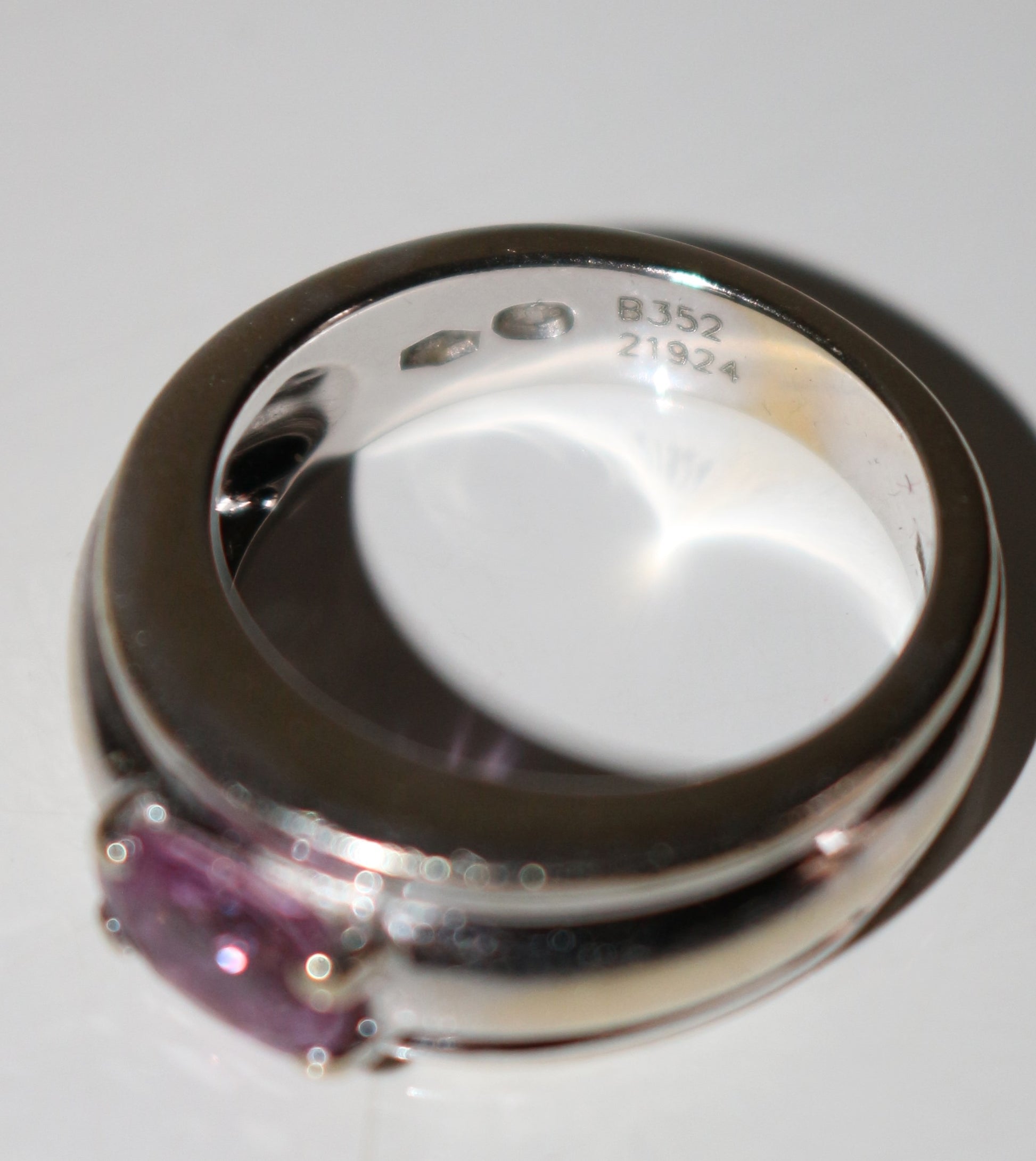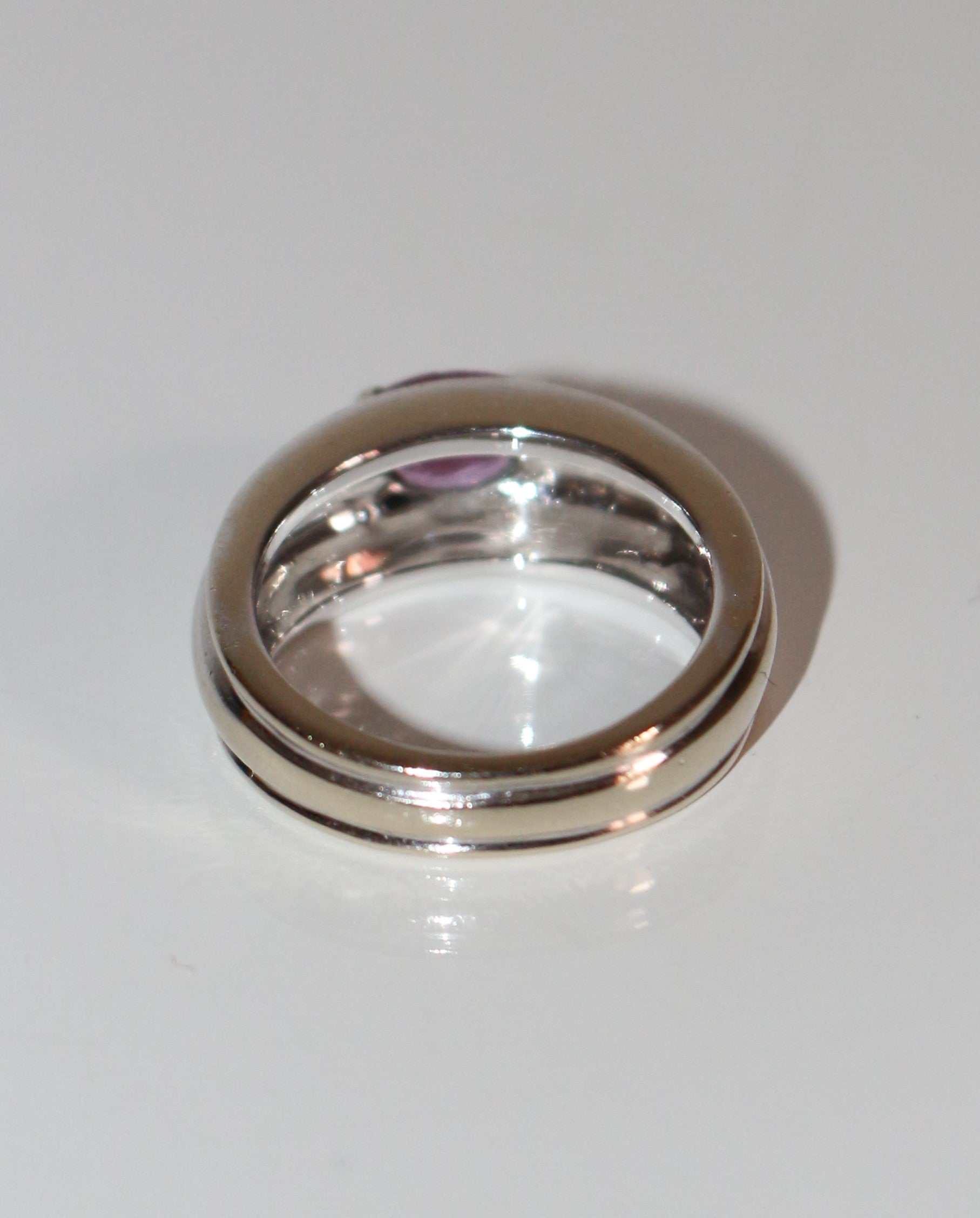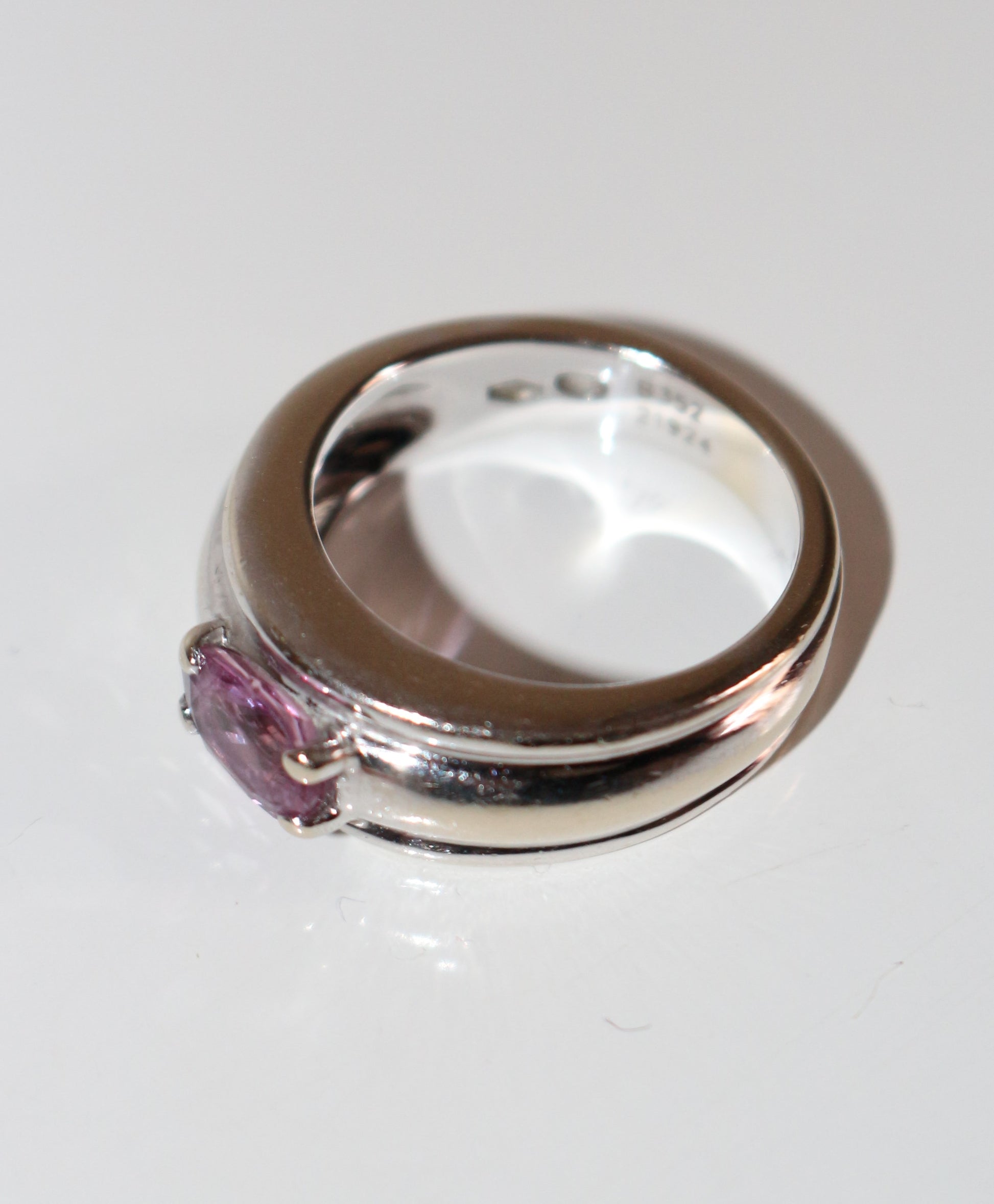BOUCHERON bague en or blanc 750 (18 carats) collection "Axelle" sertie d'un saphir ovale rose mesurant 7 mm / 5 mm / 3 mm environ (0.84 ct), années 90.