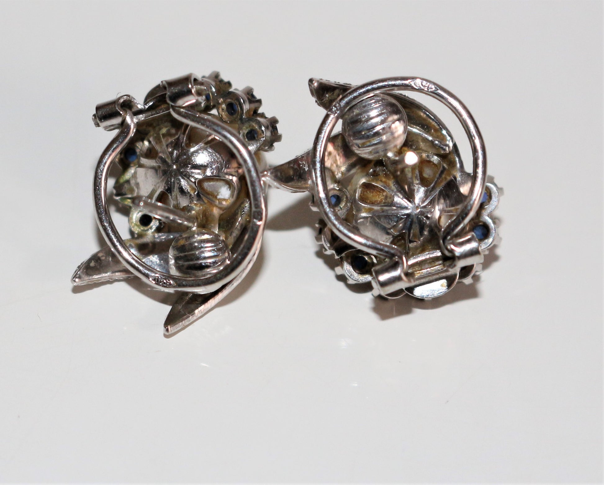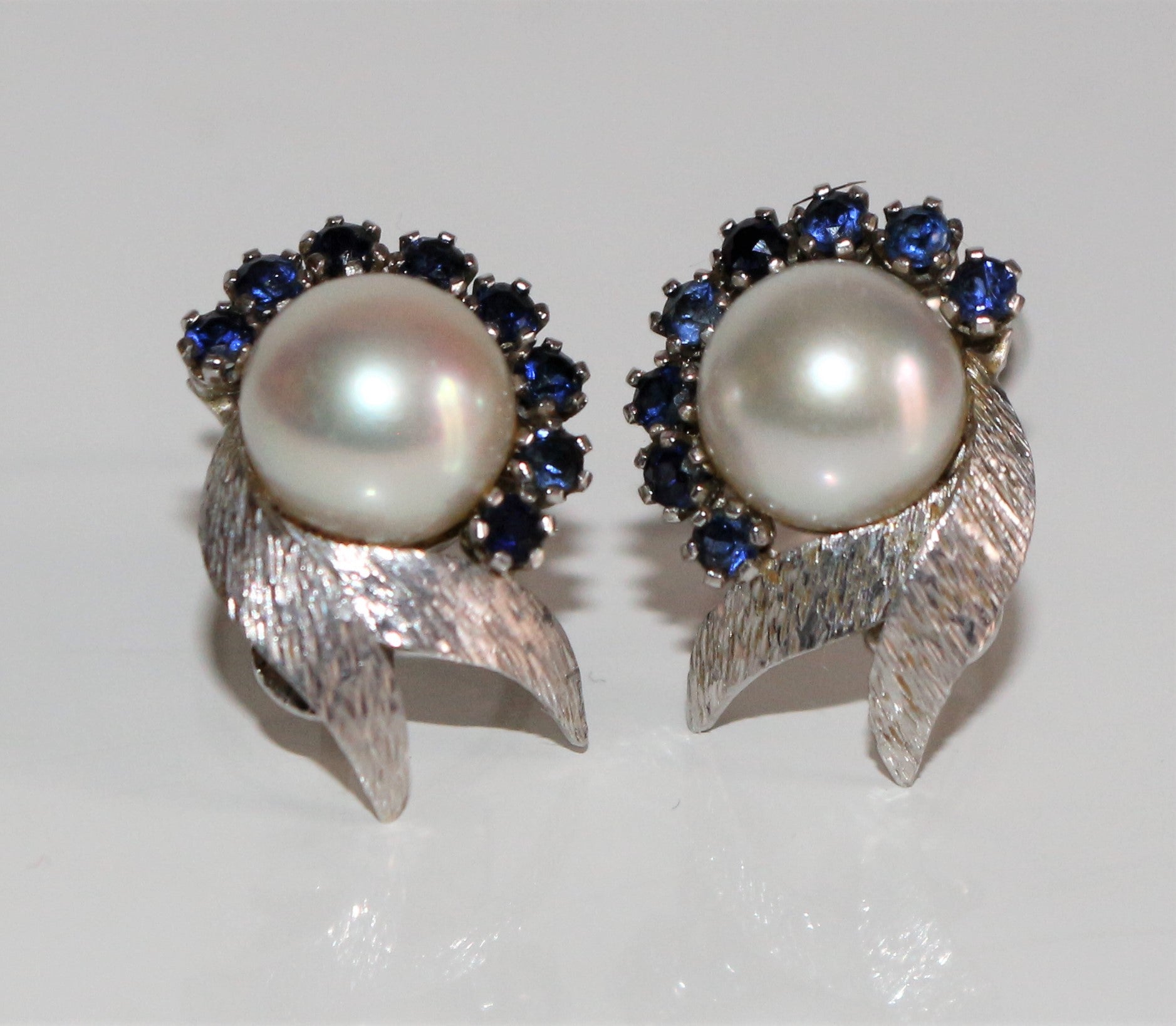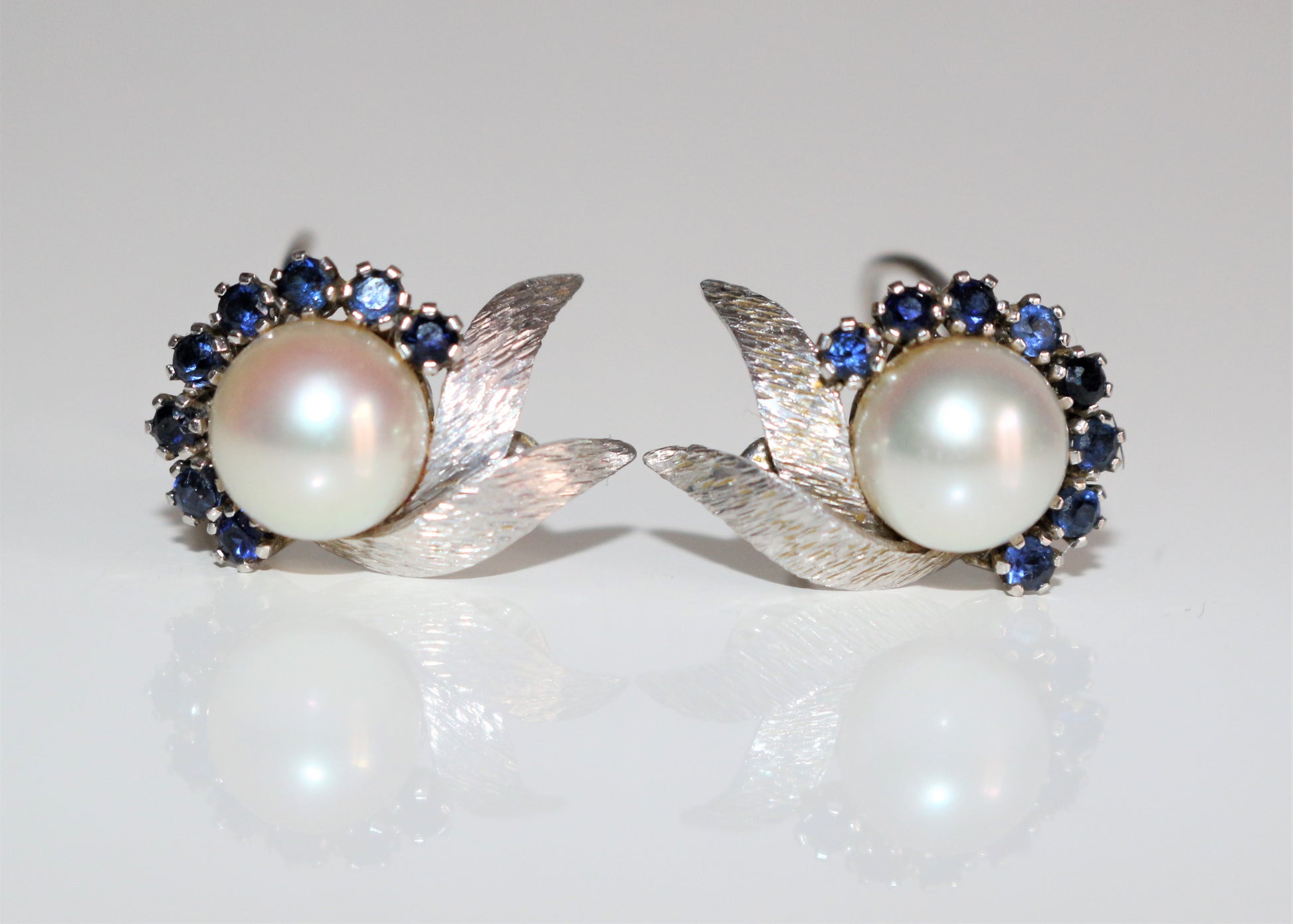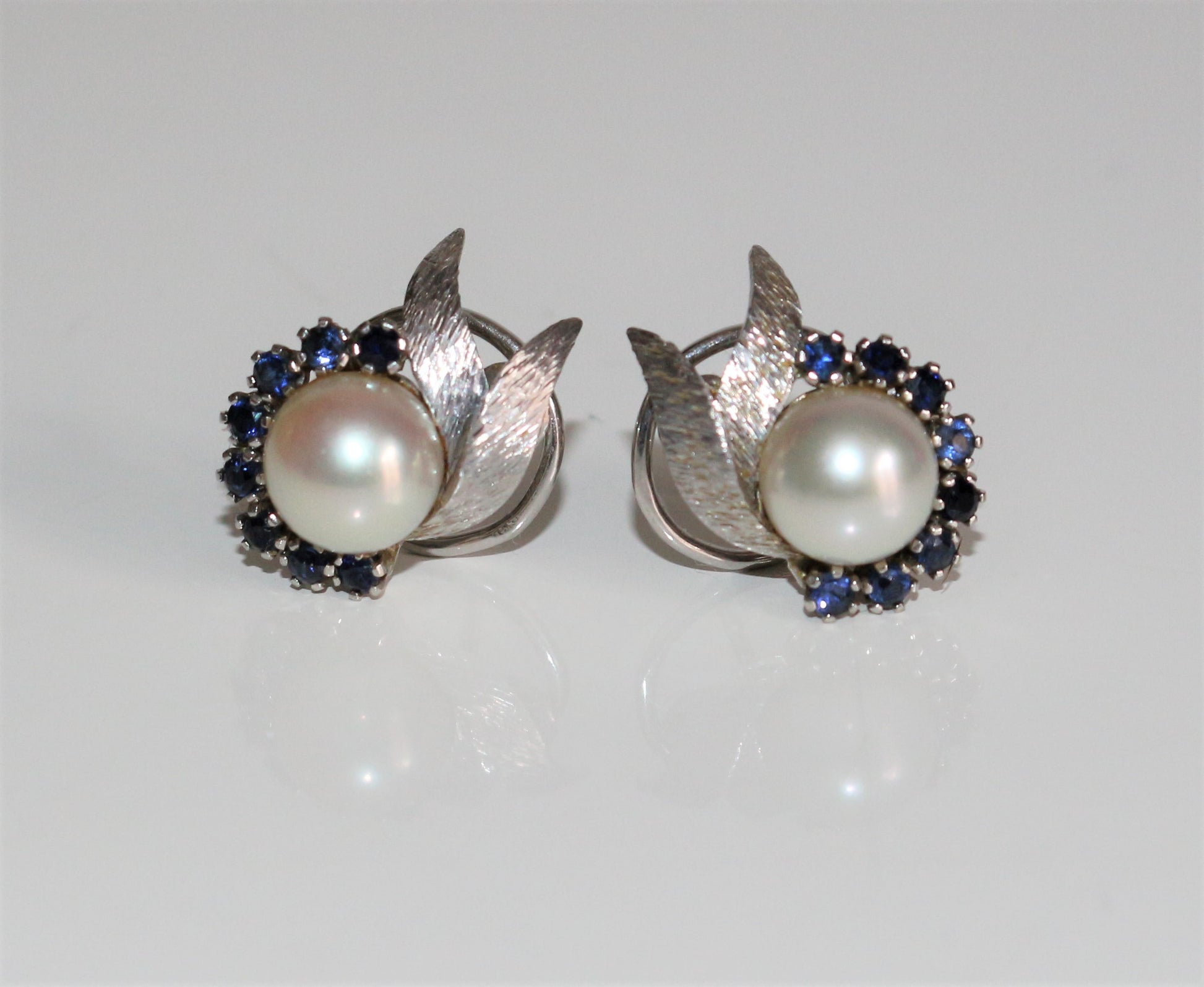 Pair of earrings for pierced ears with closure system: rod and racket, in 18k (750/1000e) white gold decorated with stylized foliage, centered with a cultured pearl 7.5 mm in diameter, lined with 8 small sapphires of 1 mm each.