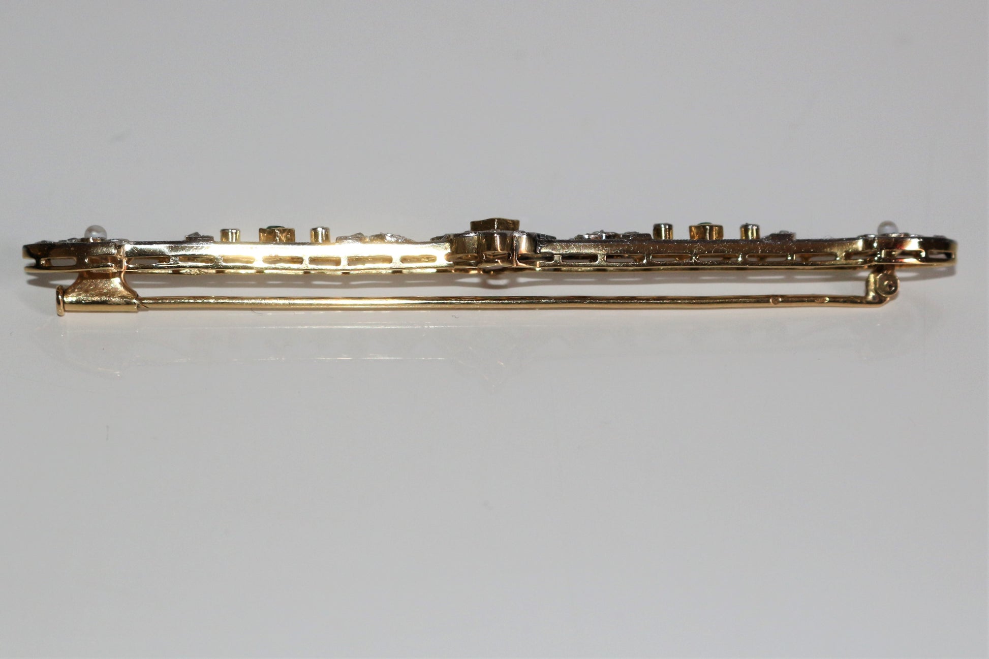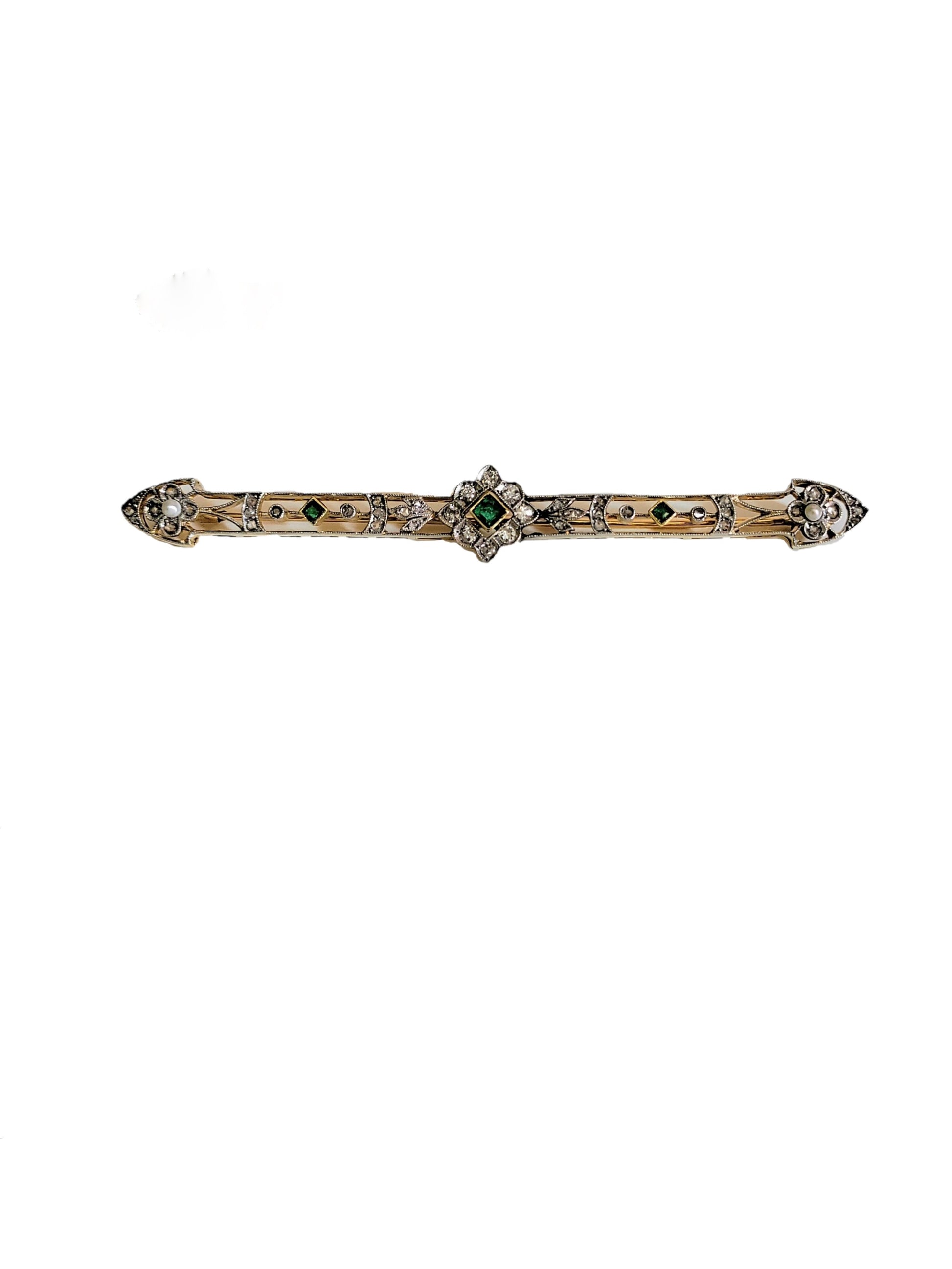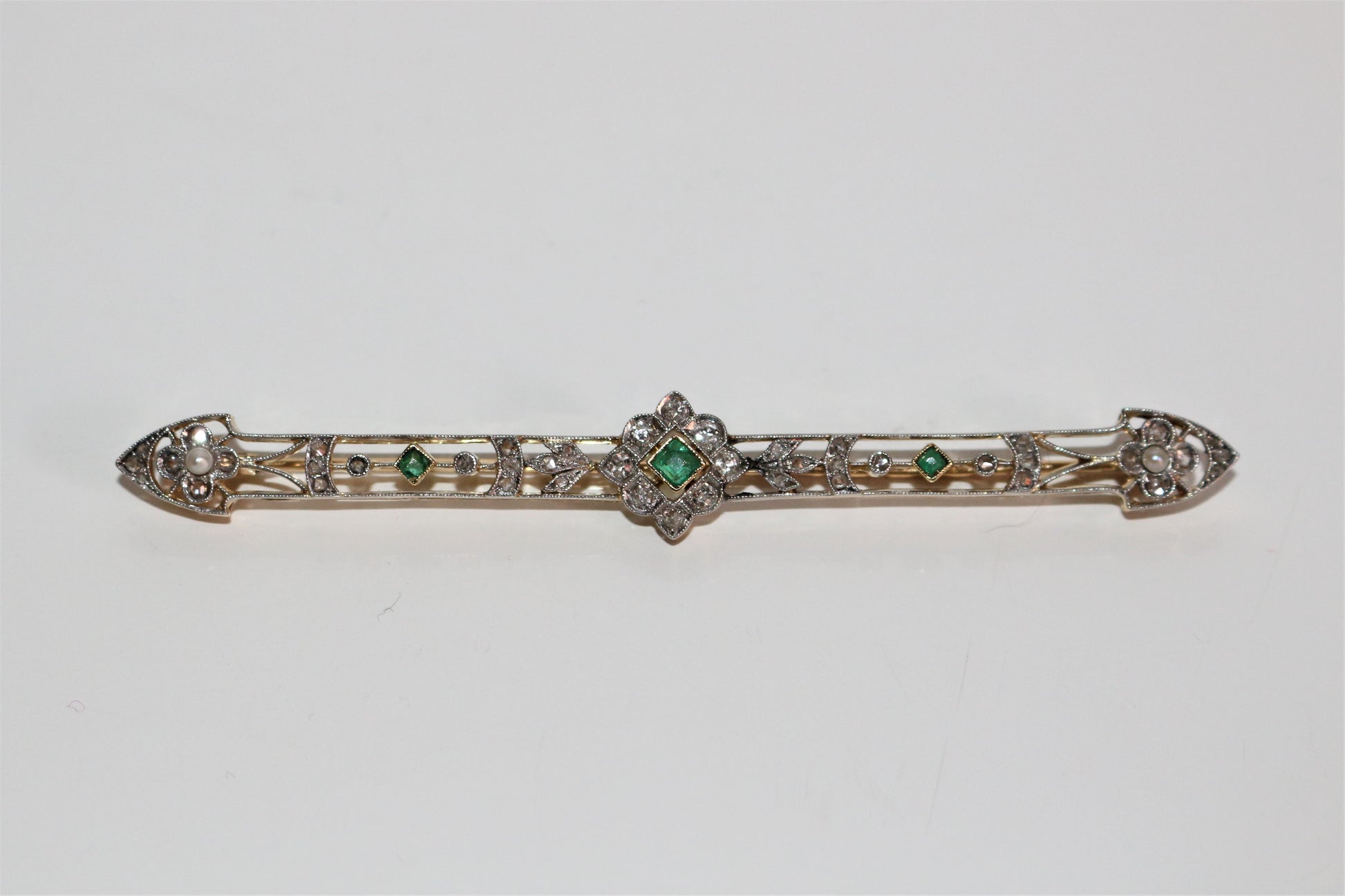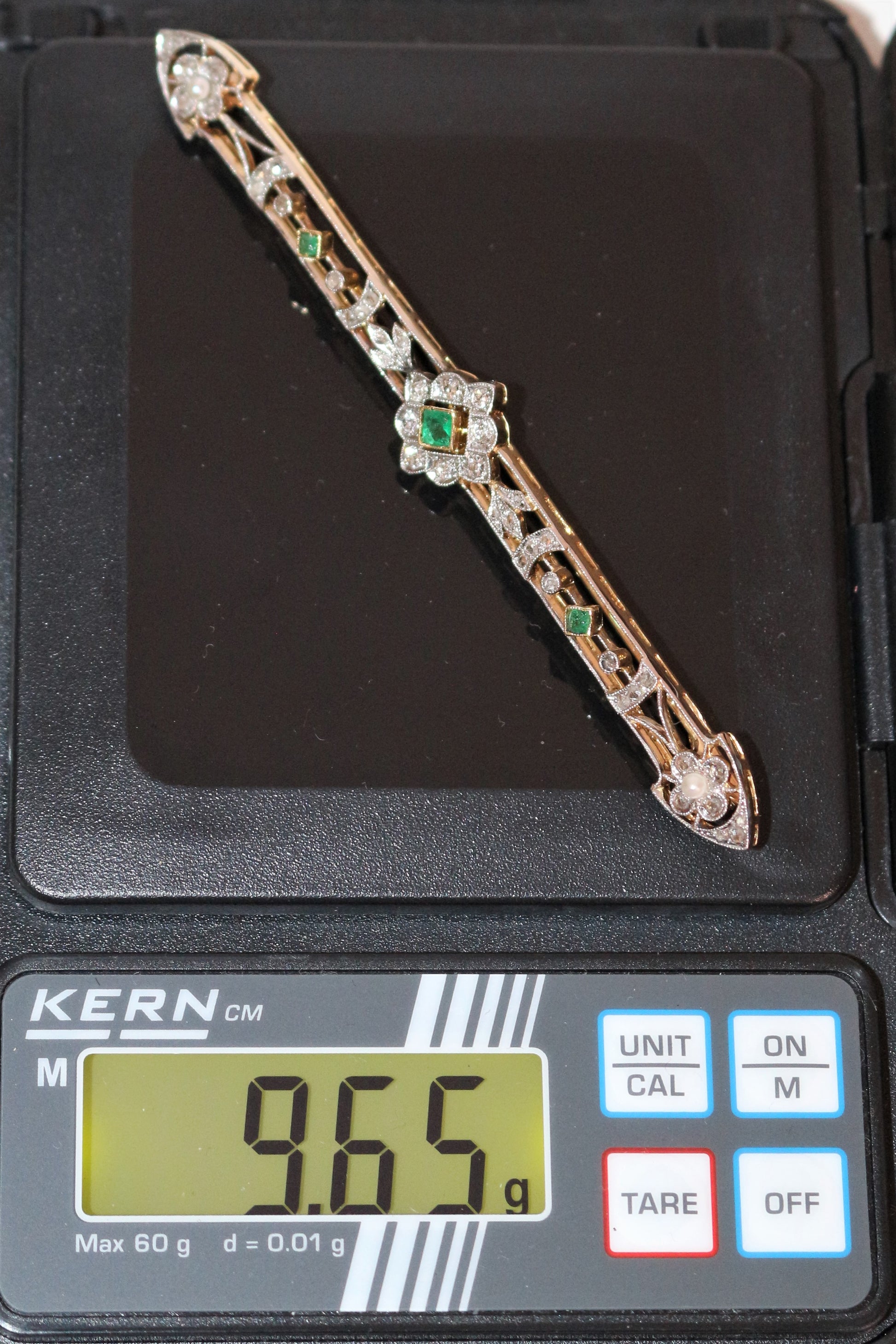 Broche-barrette début XXe, ajourée, en or jaune 750/1000e et or gris (18k), à motifs floraux et feuillagés très délicats, sertis d'émeraudes (3), de diamants taille ancienne et taille rose, et de petites perles blanches (2).