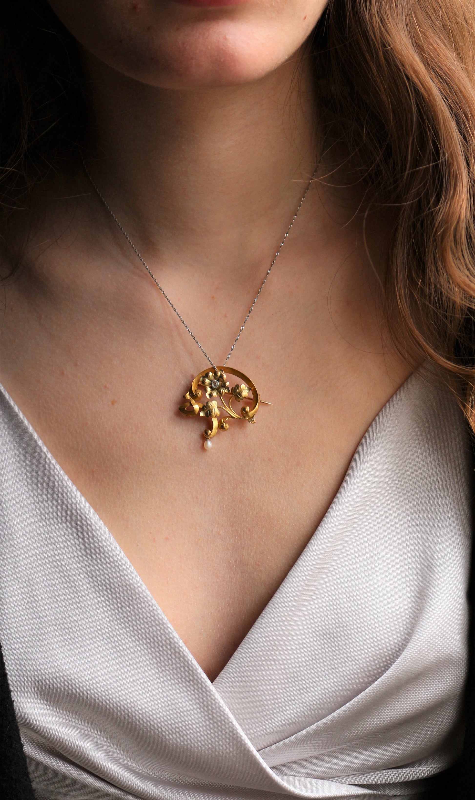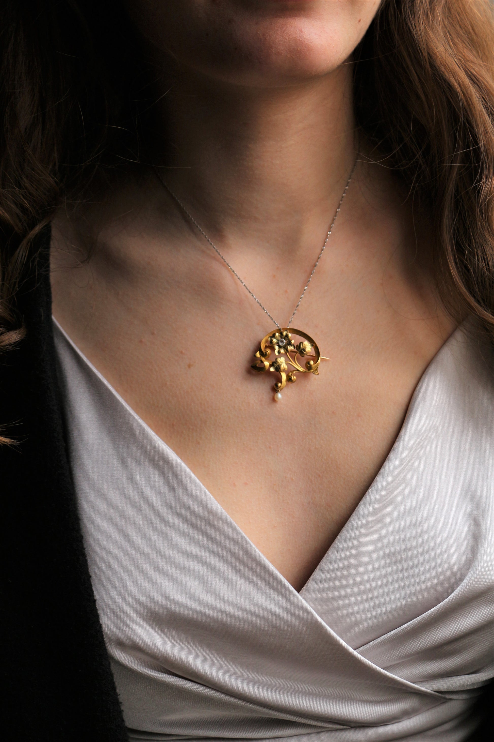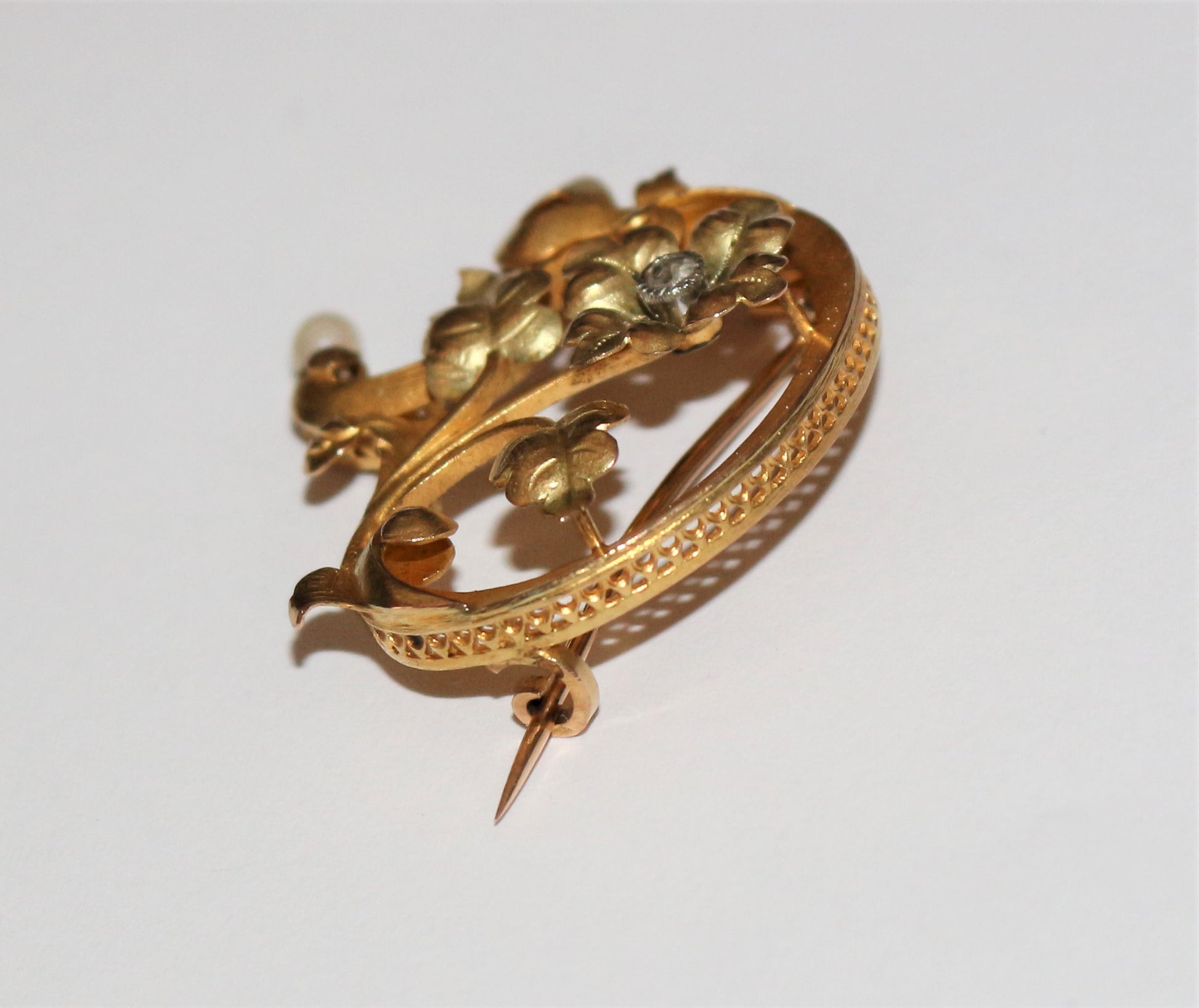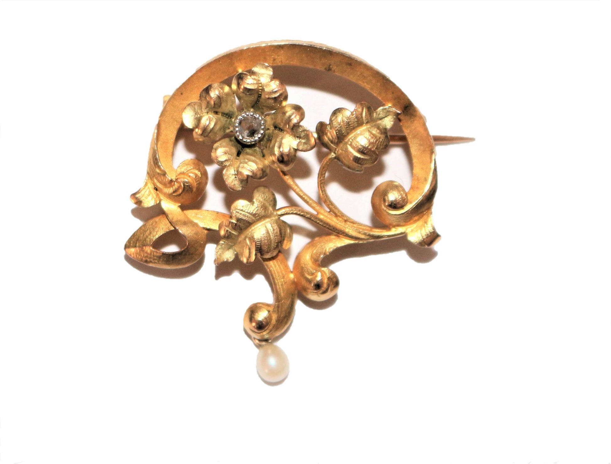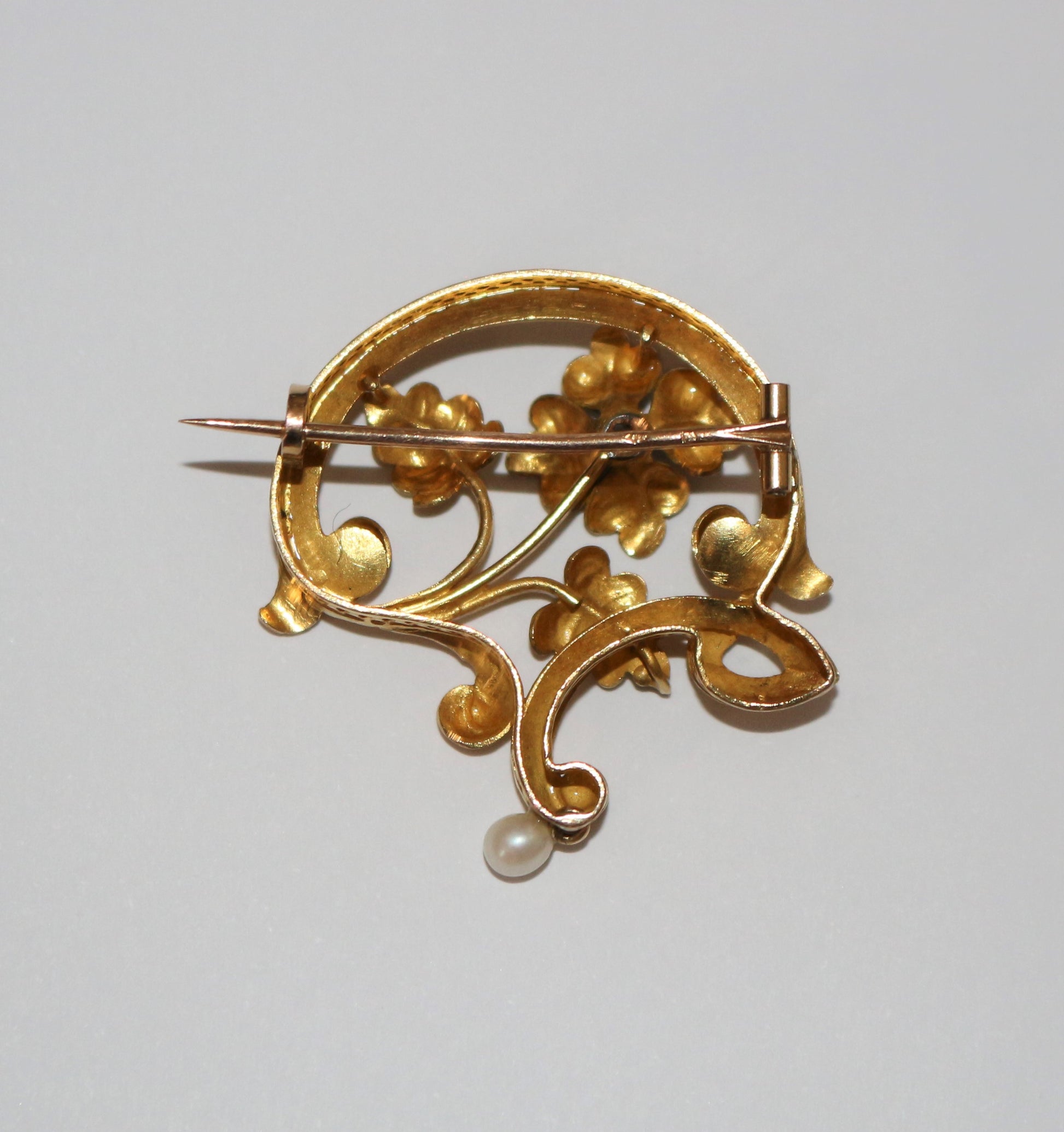 Broche d'époque Art Nouveau en or jaune 18k 750/1000e formant un motif floral stylisé, centré d'une petite rose et retenant une petite perle