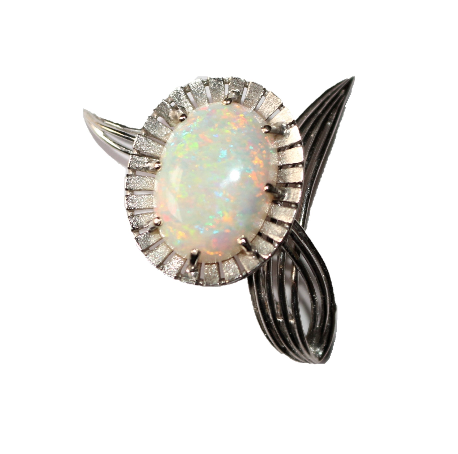 Broche en or gris 750/1000e des années 50-60 stylisant une fleur, sertie d'une importante opale blanche en cabochon, aux nombreux jeux de couleurs, pétales de la fleur en or gris amati