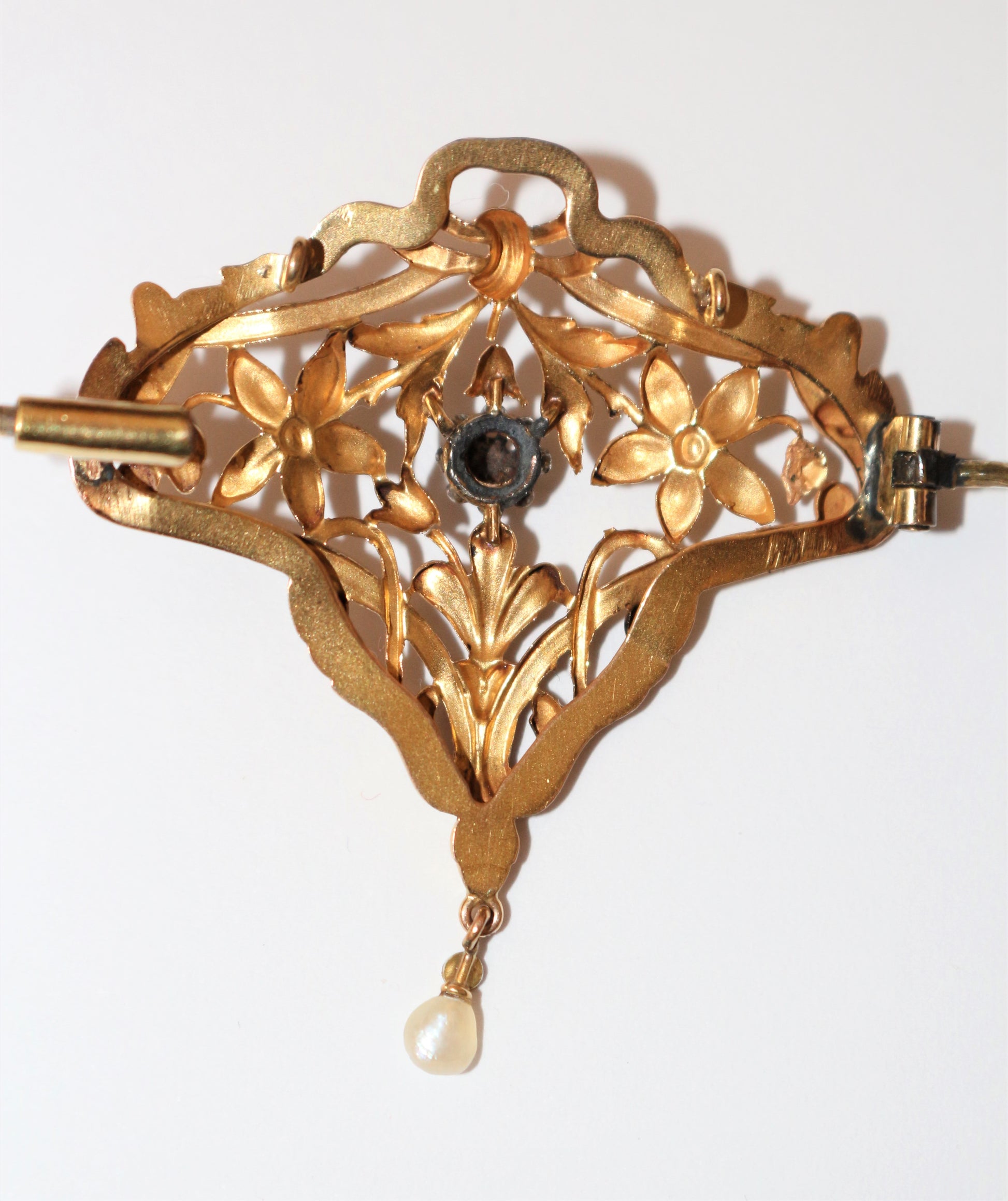 Broche - Pendentif d'époque Art Nouveau en or jaune 18 k 750/1000e et platine, à décor floral stylisé, réhaussé d'une petite rose centrale et retenant une petite perle.