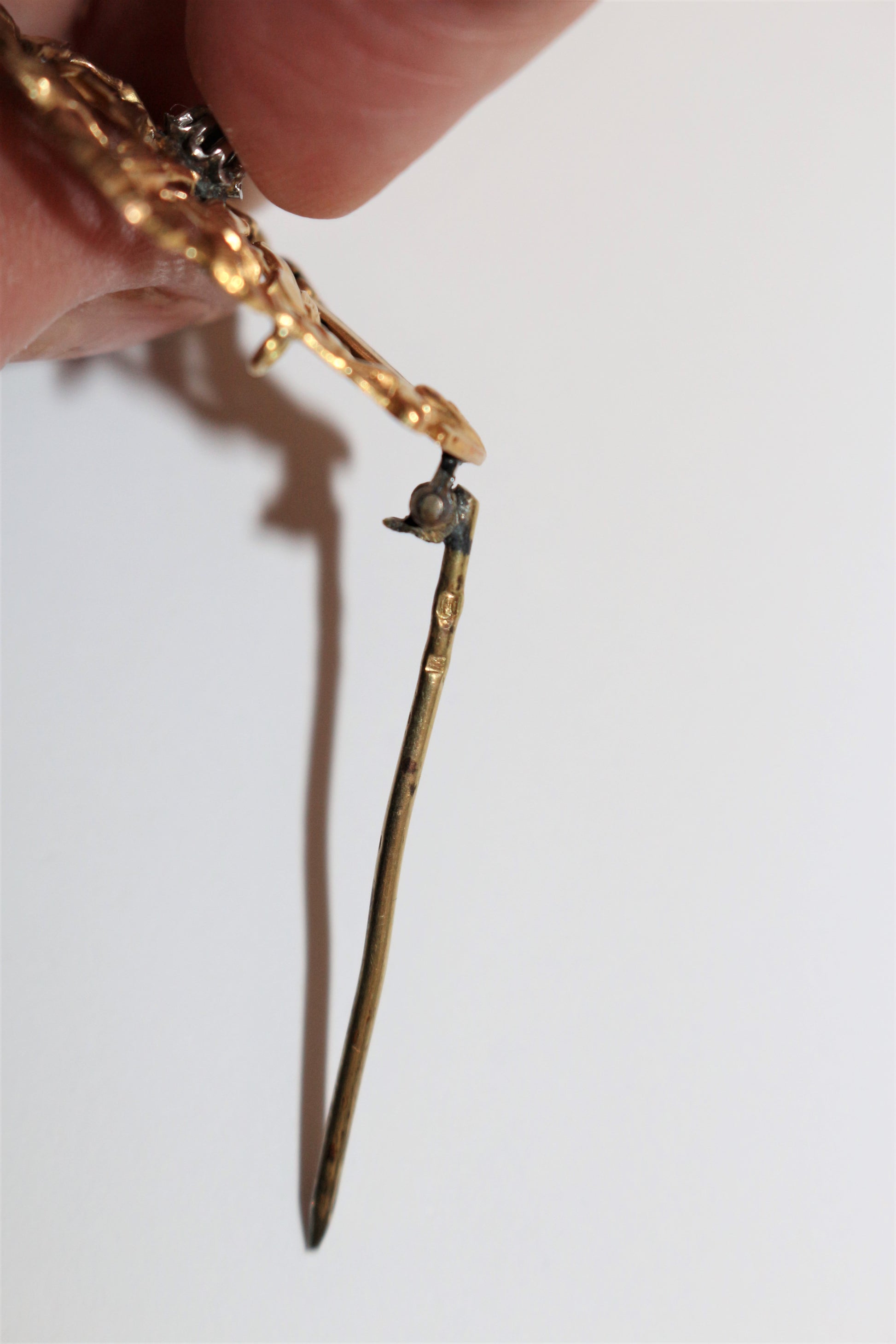 Poinçons : hibou pour or 18k et mascaron dans un rectangle pour platine sur l'épingle. Epingle en métal.