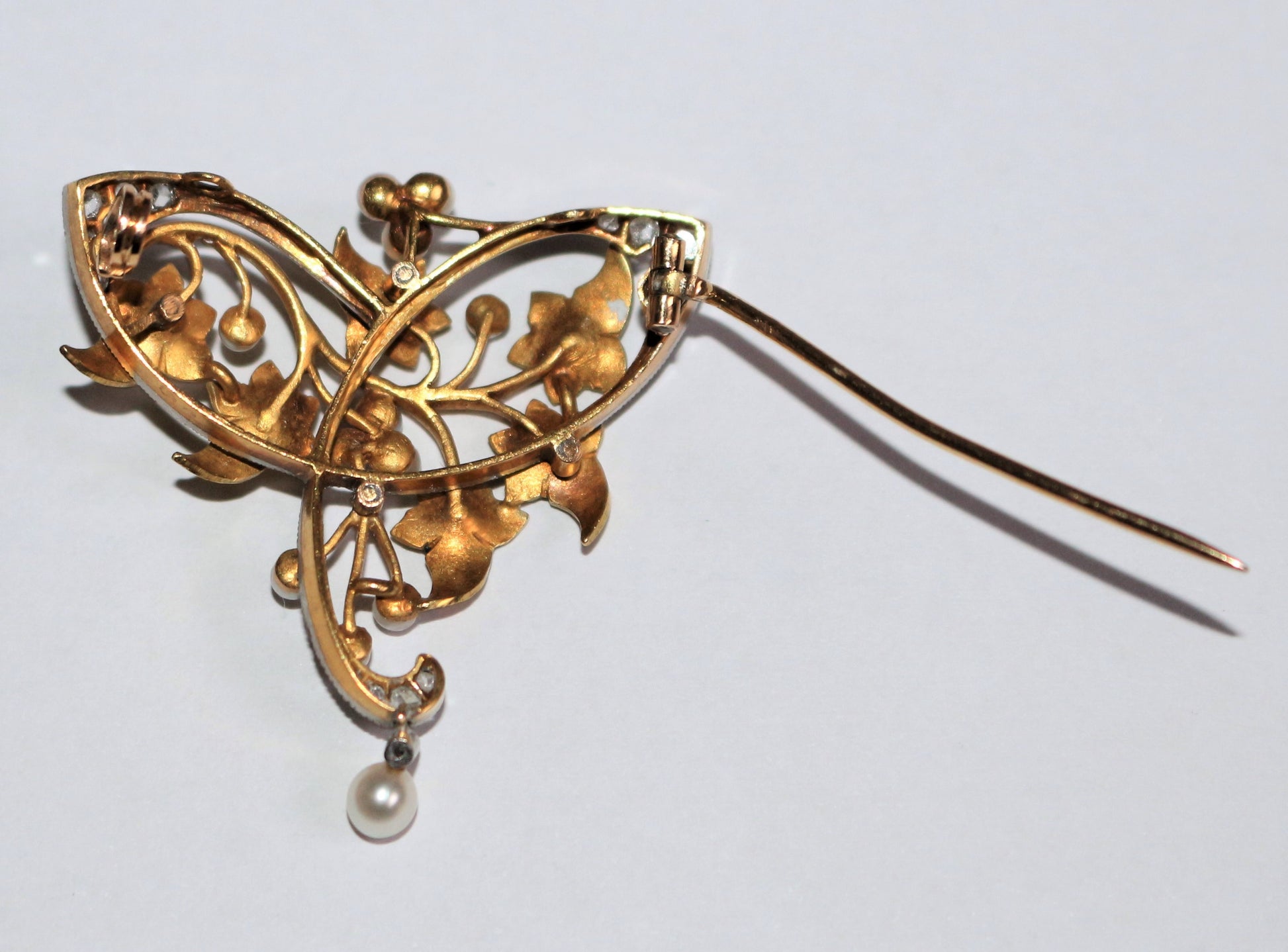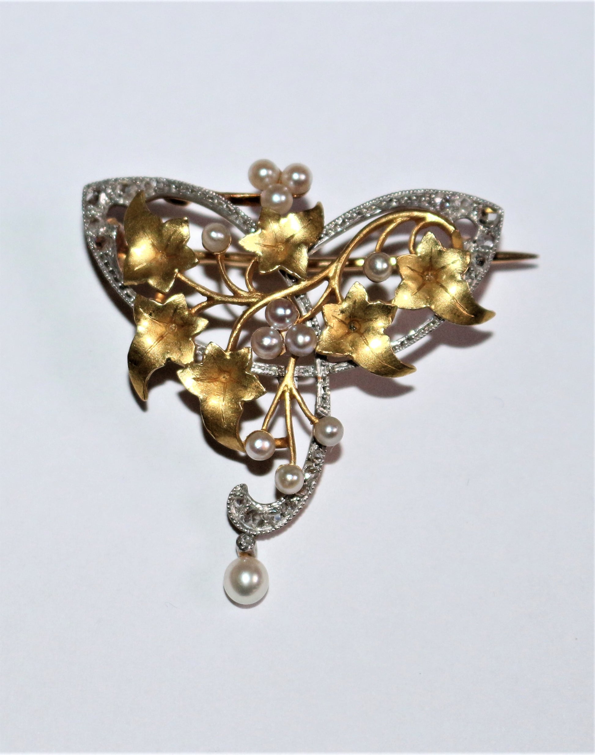formant un décor végétal très raffiné avec petites perles, et petits diamants taille rose (18 en tout) : les plus gros ont été vérifiés