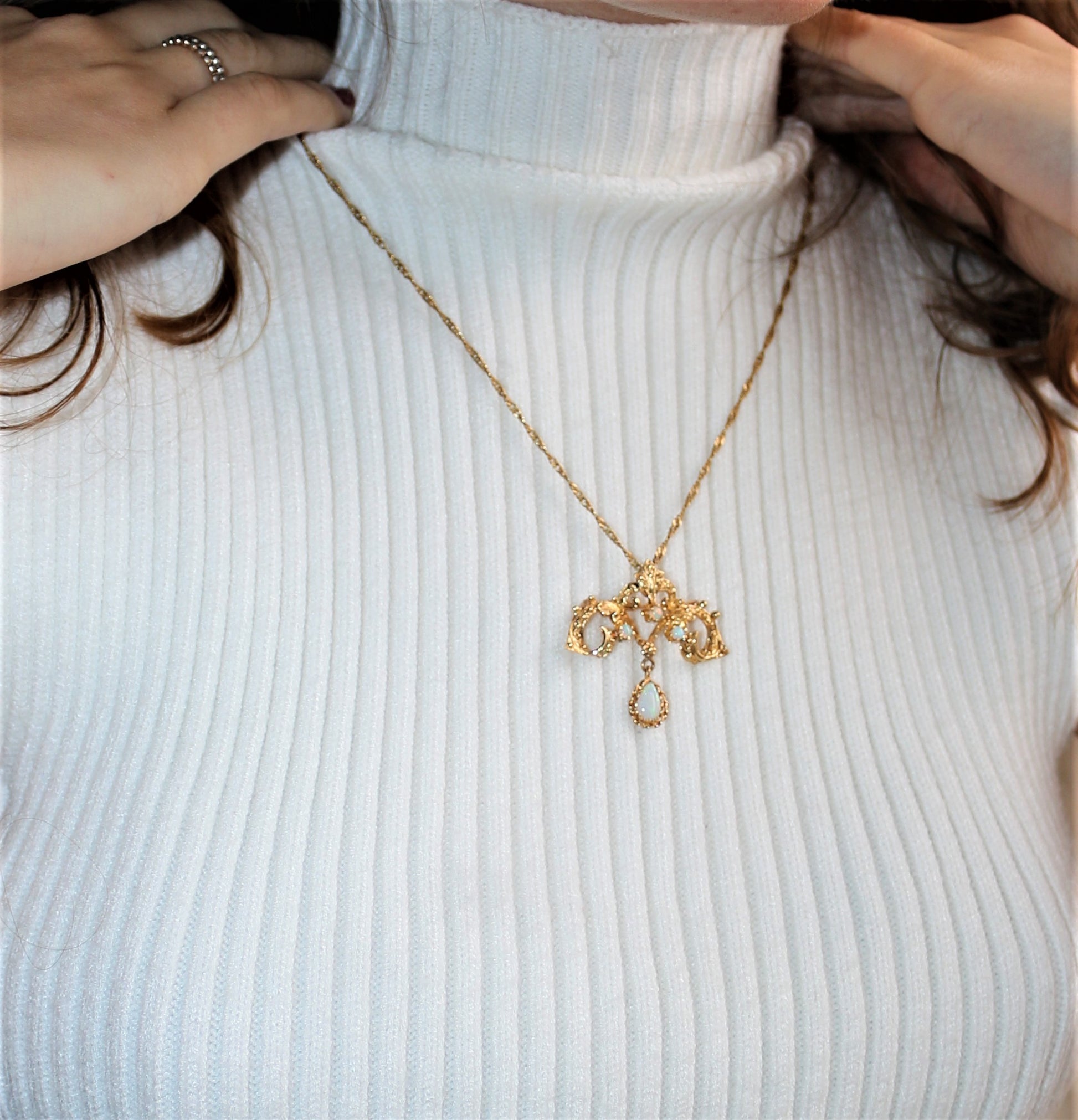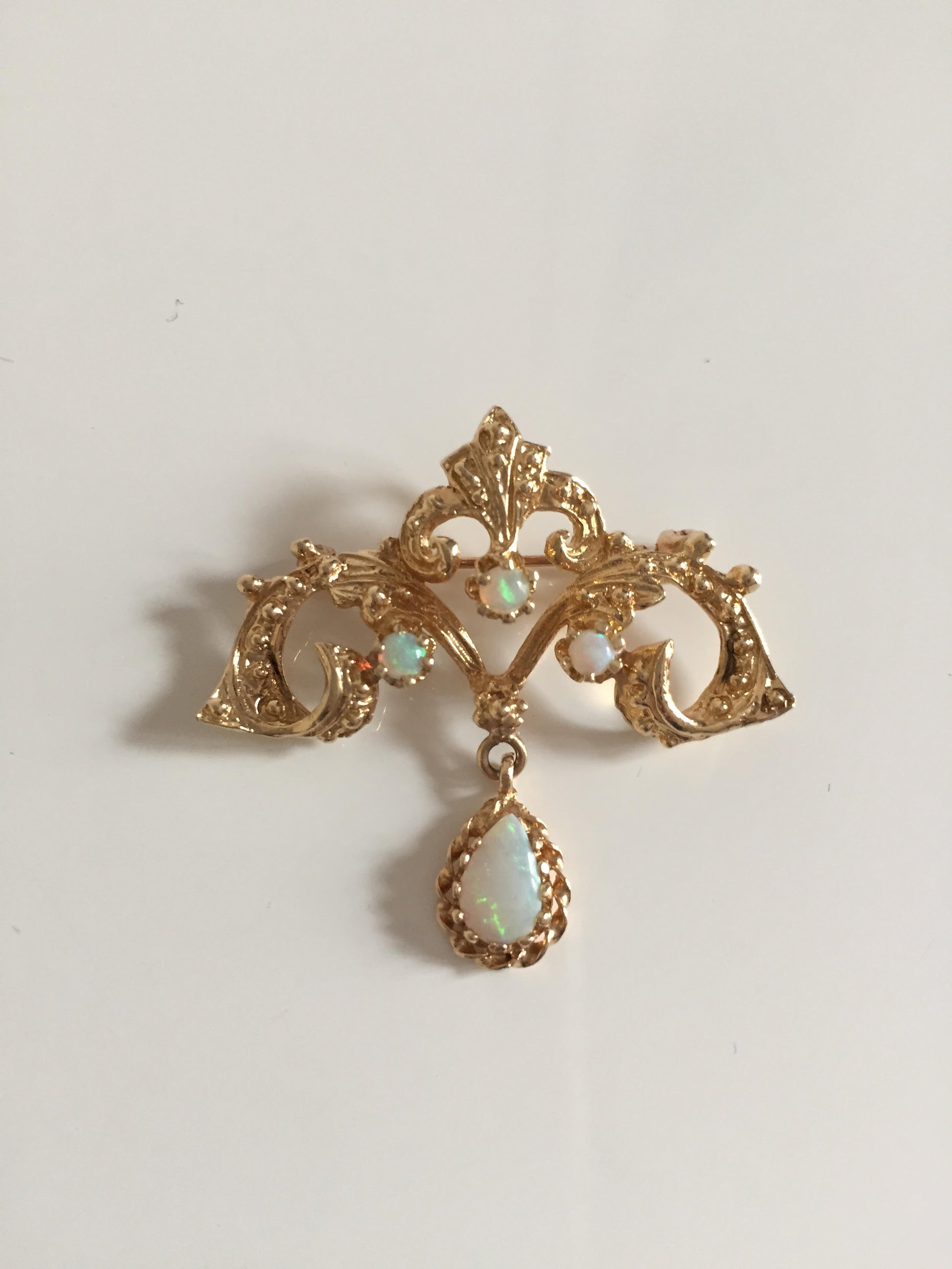 Broche-pendentif Napoléon III en or jaune 585 millièmes (14 carats) ornée de trois petites opales rondes et d'un motif en goutte serti d'une opale poire plus importante. Peut être portée en broche ou en pendentif car présence d'une bélière au dos.