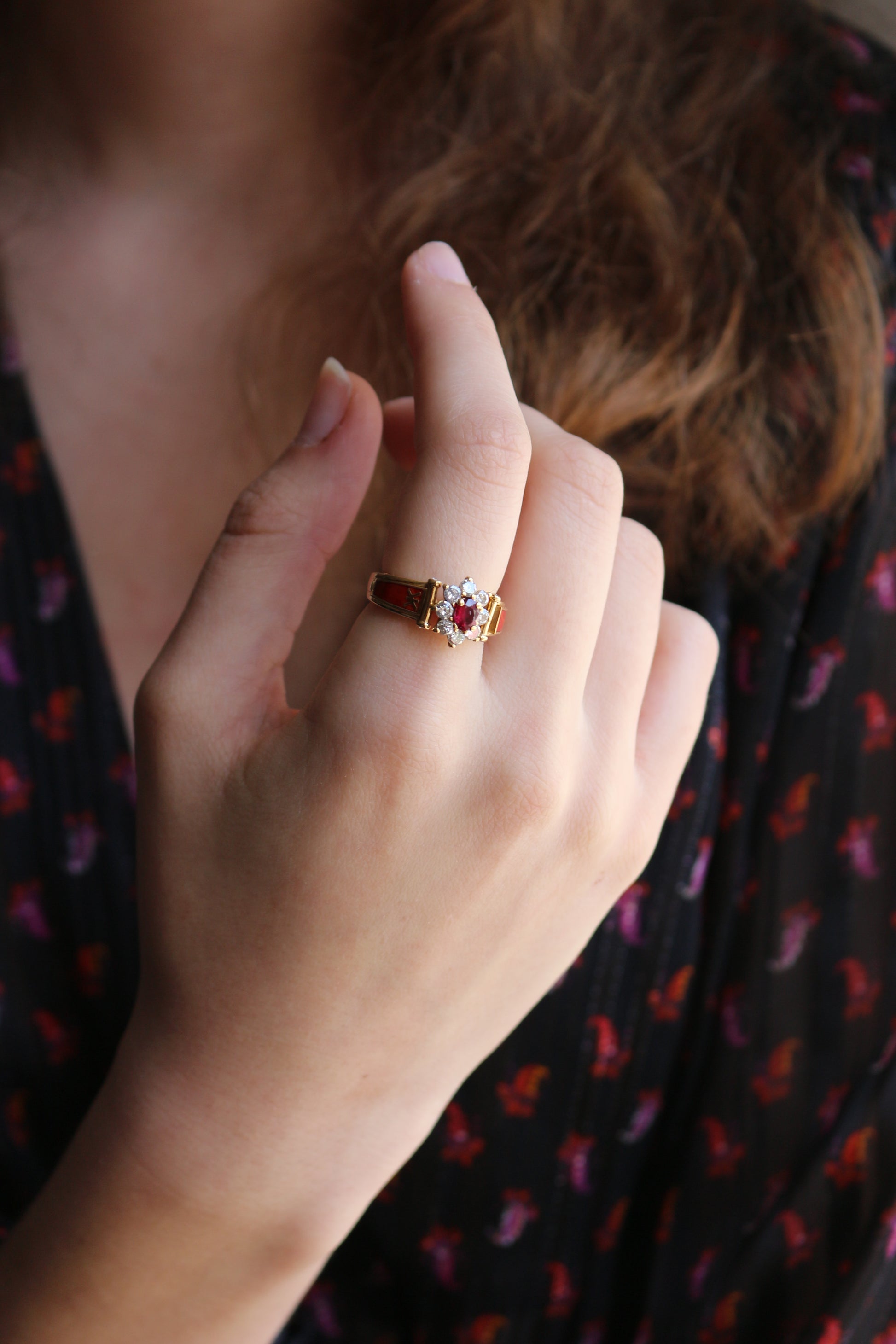 Bague émaillée signée KORLOFF, collection "Enamel" en or jaune 18 carats ornée d'un Rubis en serti griffes de 0.40 cts environ (5 x 4 x 2.5 mm) et de 0.60 carat environ de diamants brillants qualité : G-VS (8 + 4 petits diamants aux extrémités des bords) système de 4 vis pour démonter et changer le décor émaillé