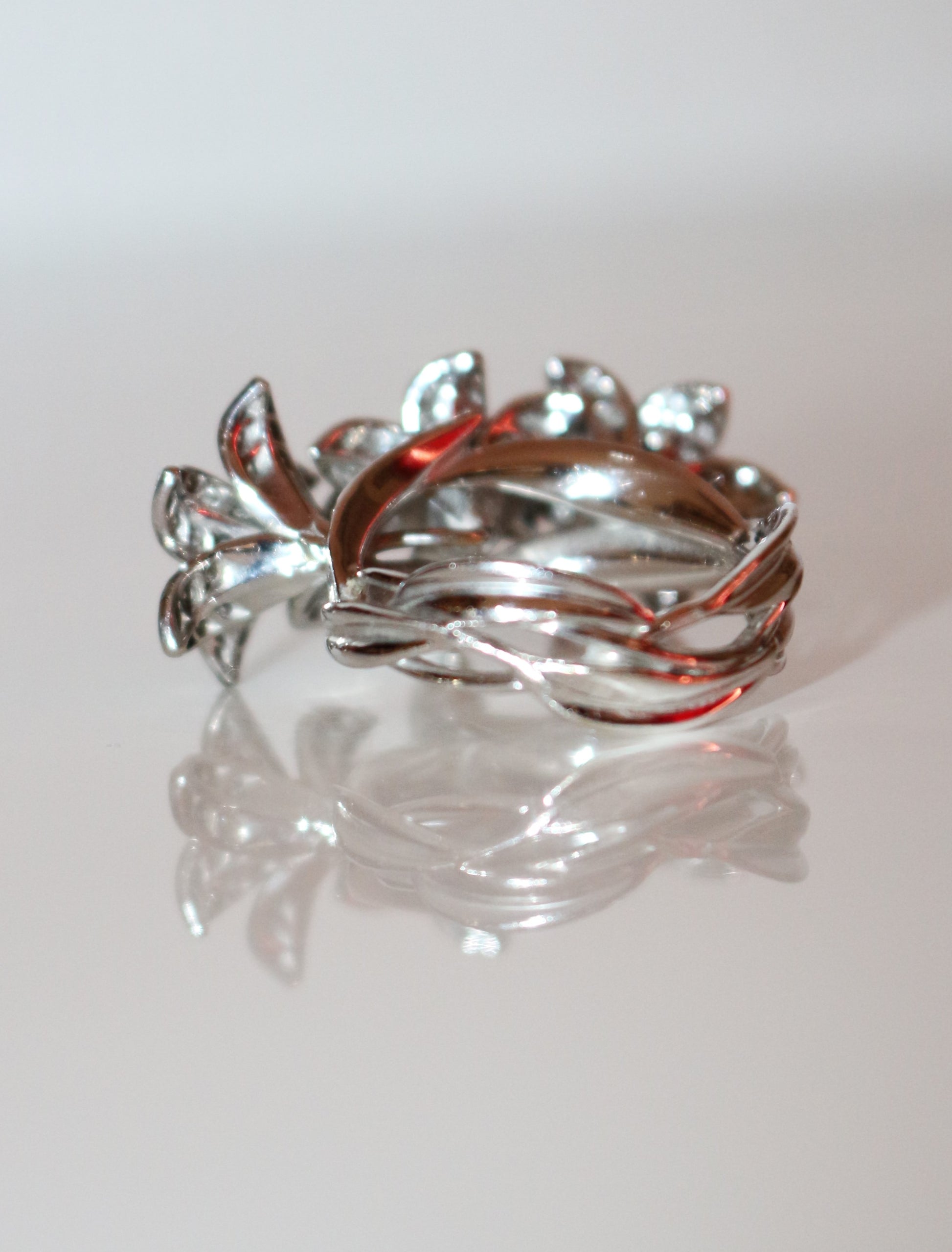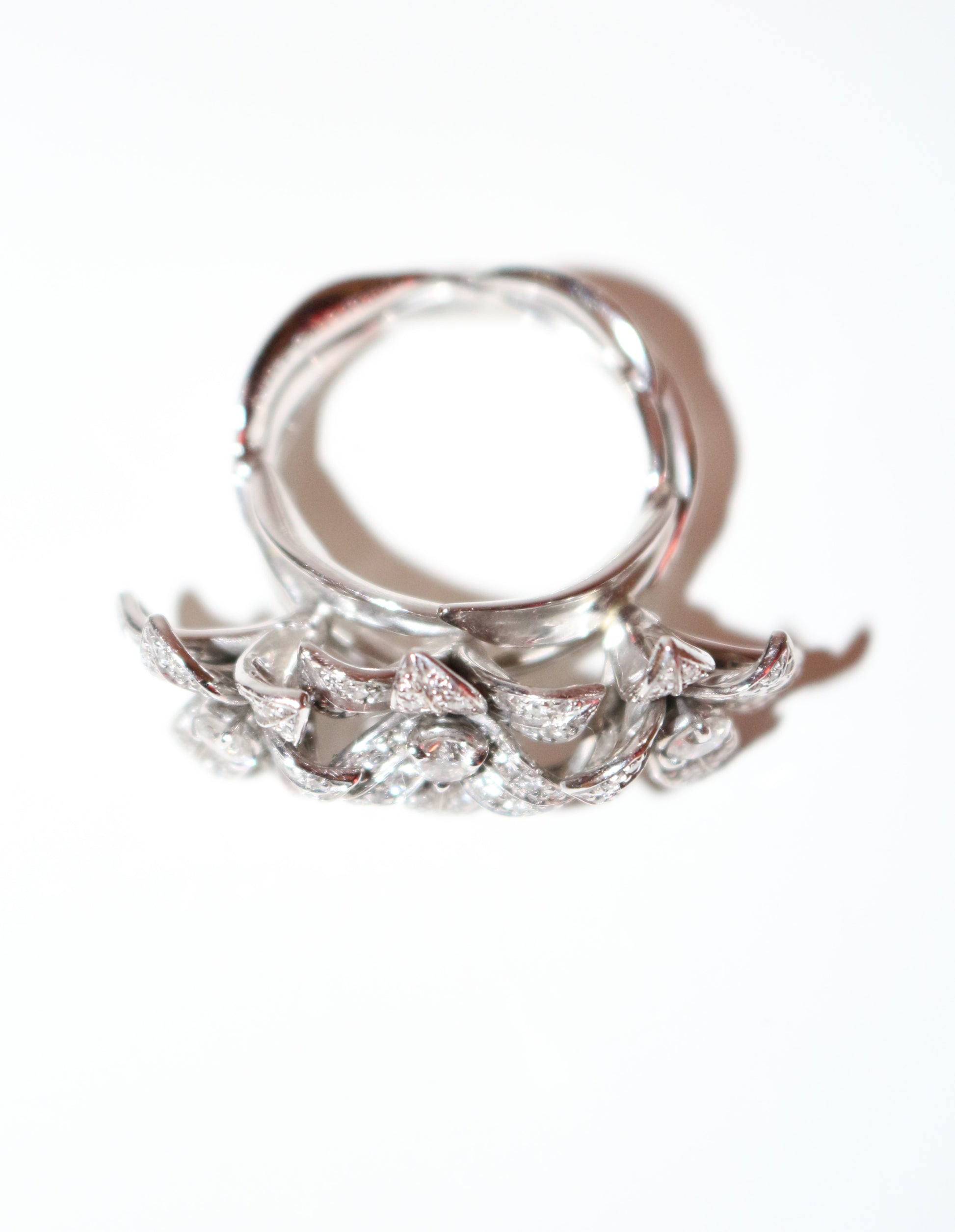 Bague bouquet trois fleurs de la Maison Mellerio dits Meller, le joaillier des Reines, datée de 2013, composée de trois lys de 6 pétales, en or blanc 750/1000e, 18 carats et diamants. L'anneau de la bague ajouré est en forme de tiges entrelacées des lys. Travail délicat et raffiné de la collection Médicis en hommage aux 400 ans de la maison (1613-2013).