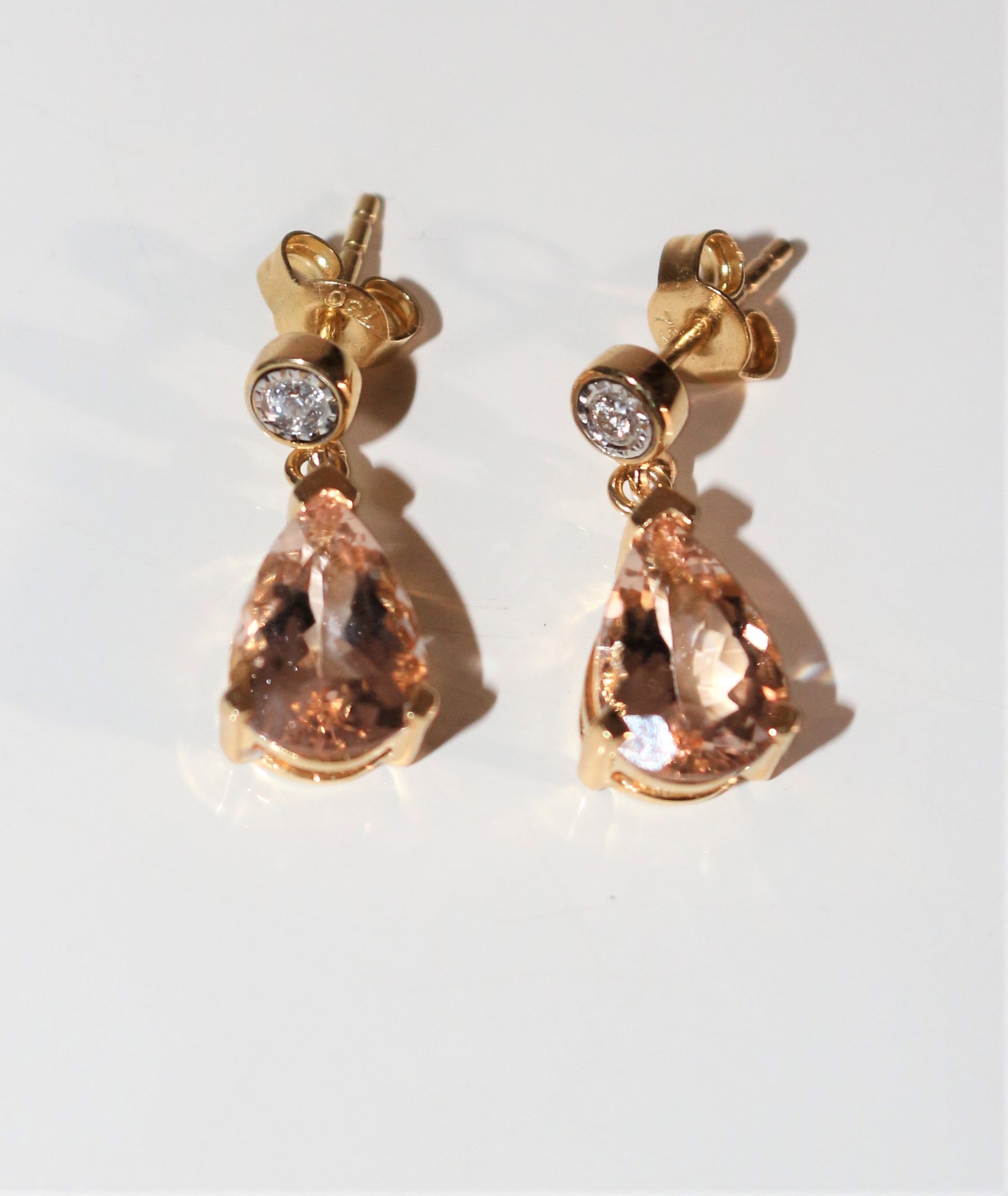 Paire de boucles d'oreilles en or jaune 18 carats (750/10000e) serties d'un petit diamant brillant, retenant une morganite taille poire de 1,40 carat environ (10 / 7 / 4 mm)