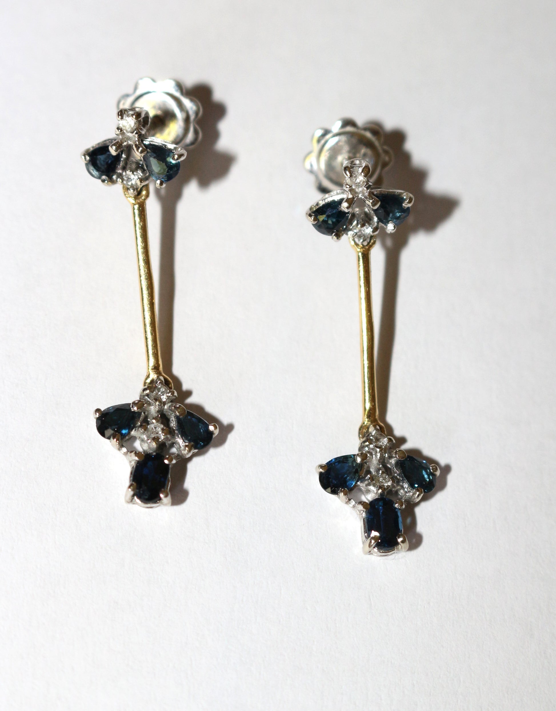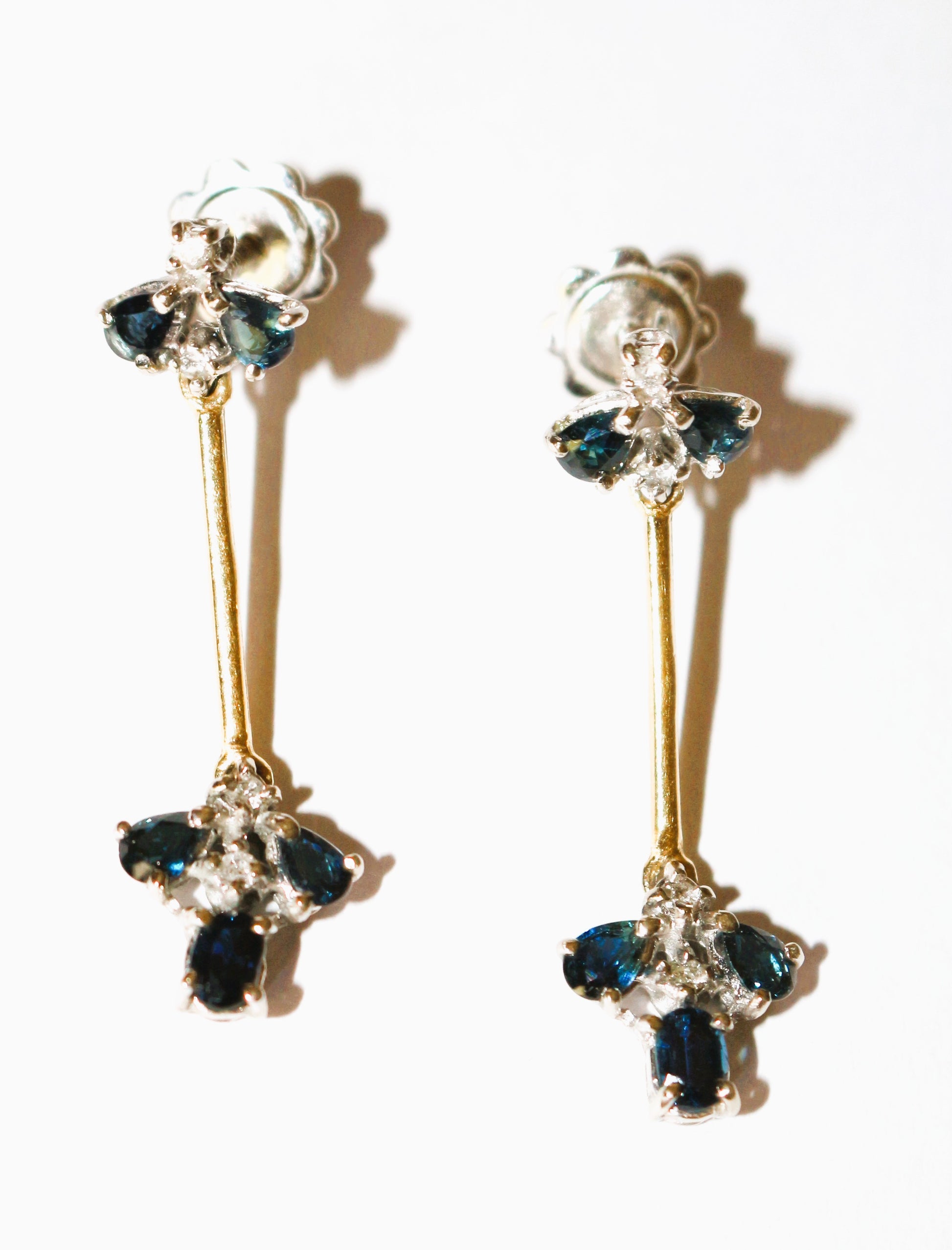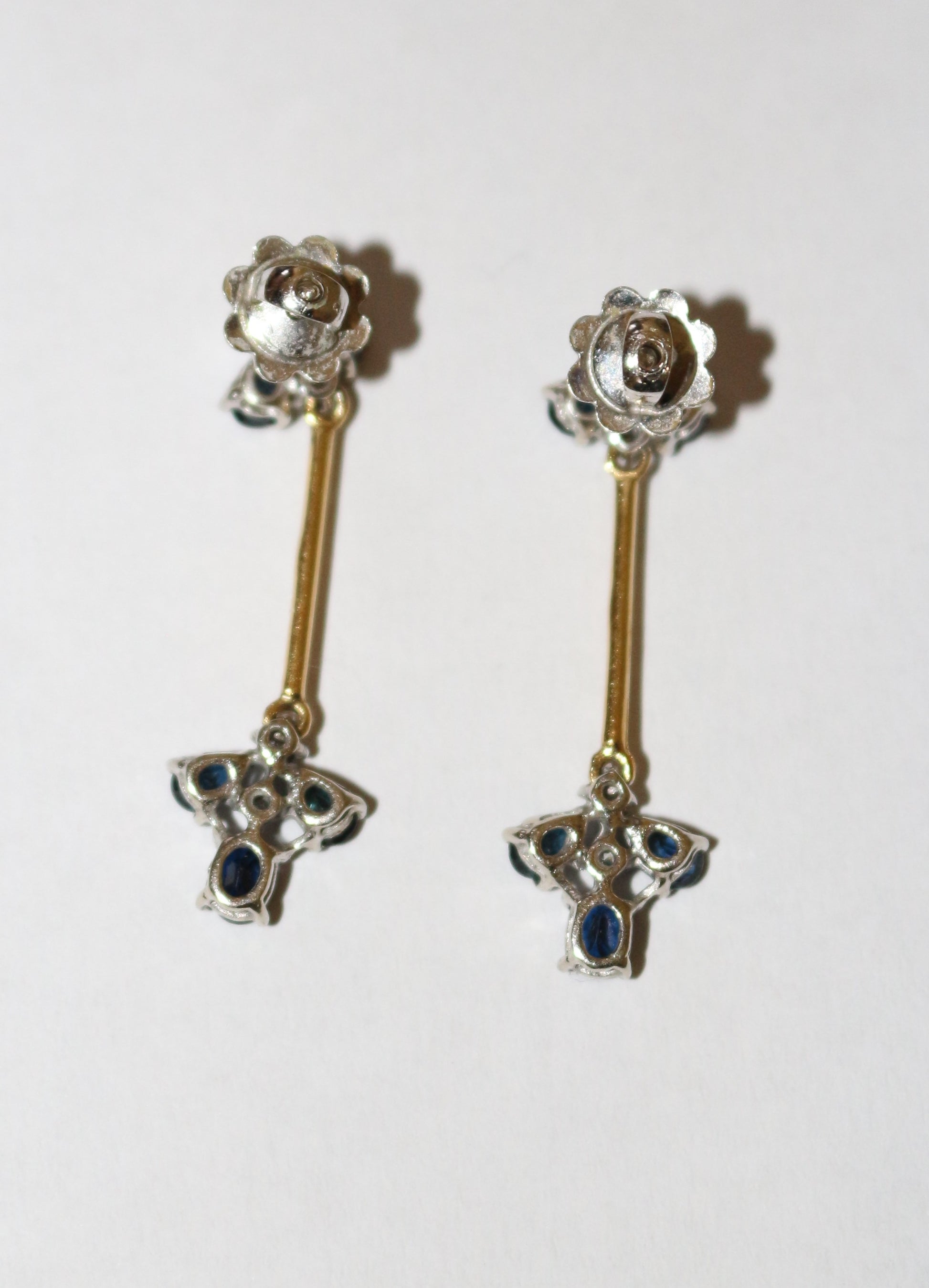 Paire de pendants d'oreilles en or jaune et or blanc 750/1000e (18 carats) ornés de petits saphirs ovales et taille poire sertis sur griffes (5 chacun) et de petits brillants (4 chacun), les fermoirs sont à vis. Années 70.
