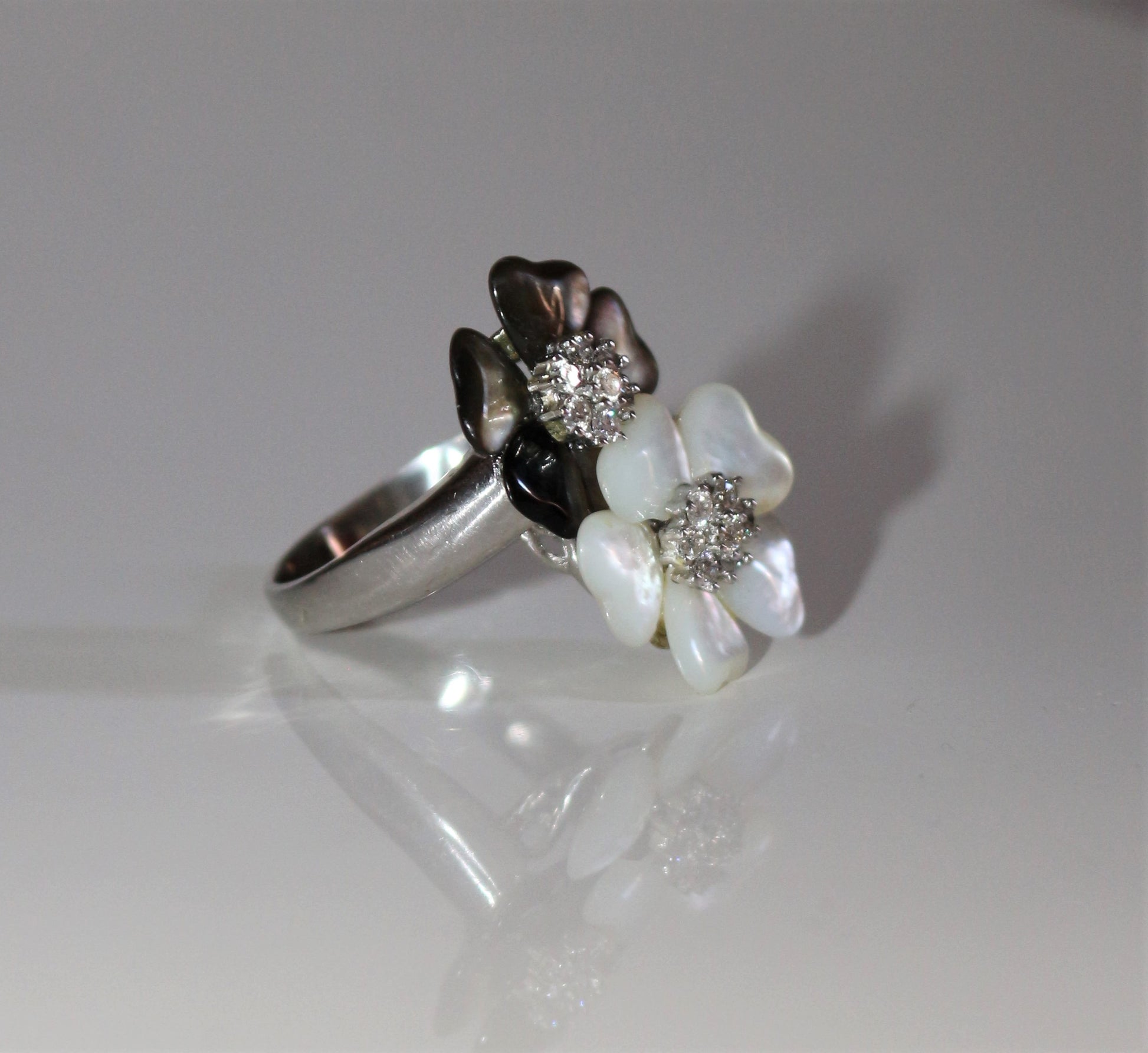 Bague en or blanc 750/1000e, 18 carats, ornée de deux fleurs, juxtaposées verticalement, le coeur est serti de 7 diamants taille brillant, les pétales sont en nacre blanche et grise.