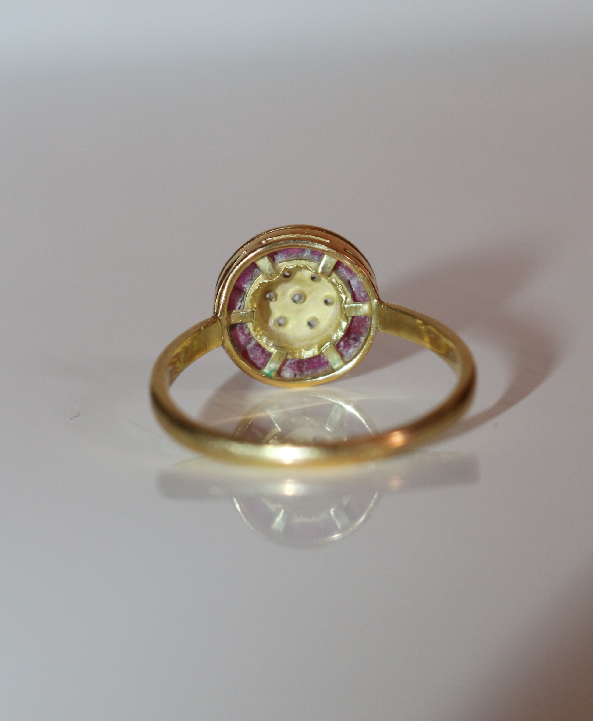 Bague Art Déco 2 ors, principalement en or jaune 750/1000e (18 carats) centrée d'un pavage de petits diamants taillés en rose, dans un entourage de rubis synthétiques calibrés