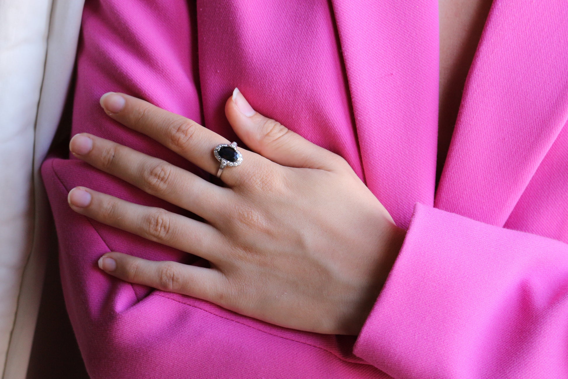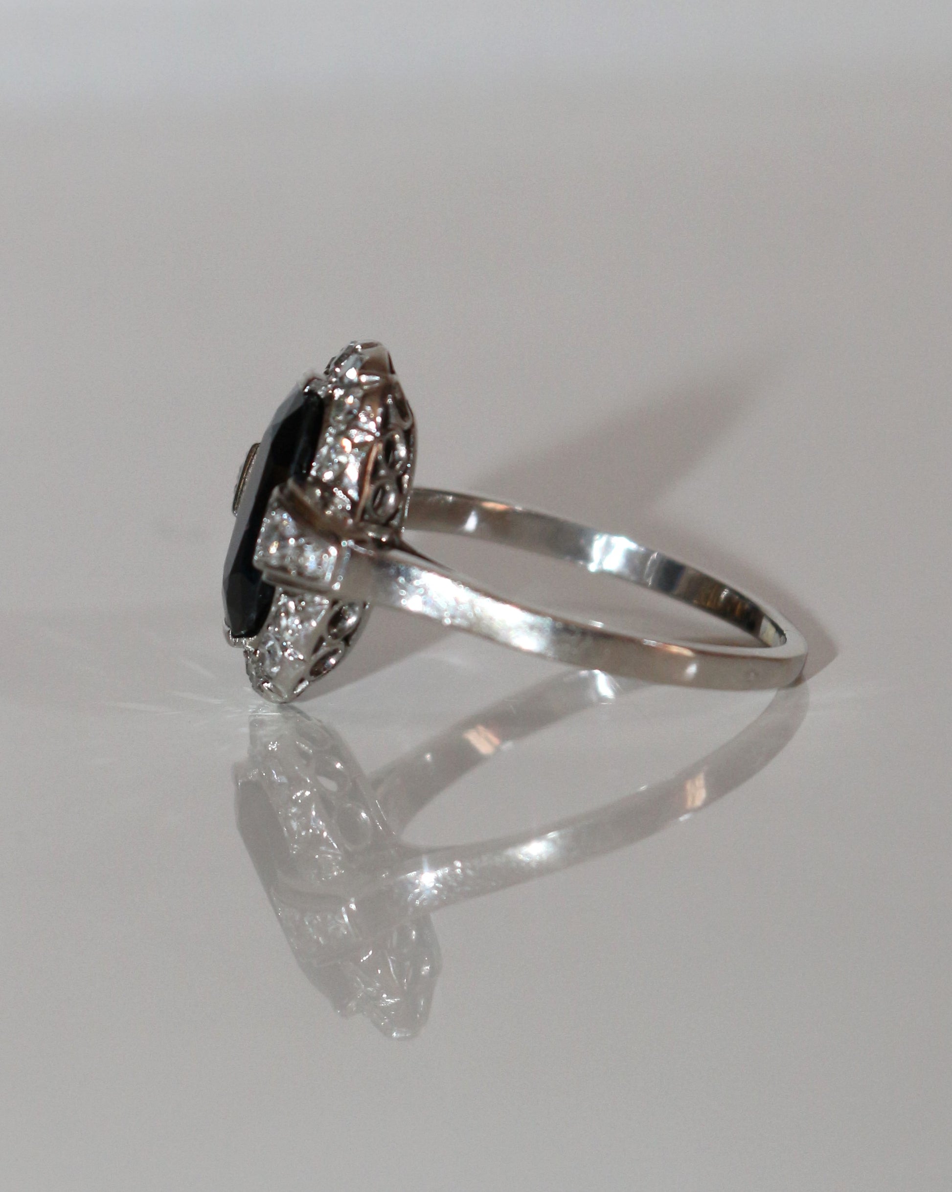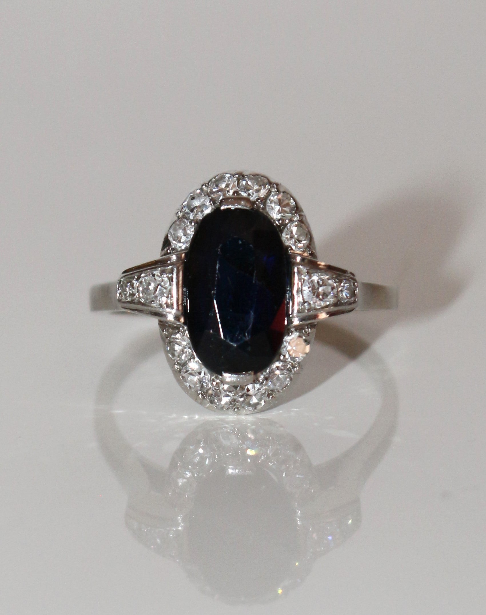 Bague d'époque Art Déco 1925, en or gris 750/1000e (18 carats) sertie d'un saphir ovale foncé bleu marine entouré et épaulé de diamants taille 8/8.