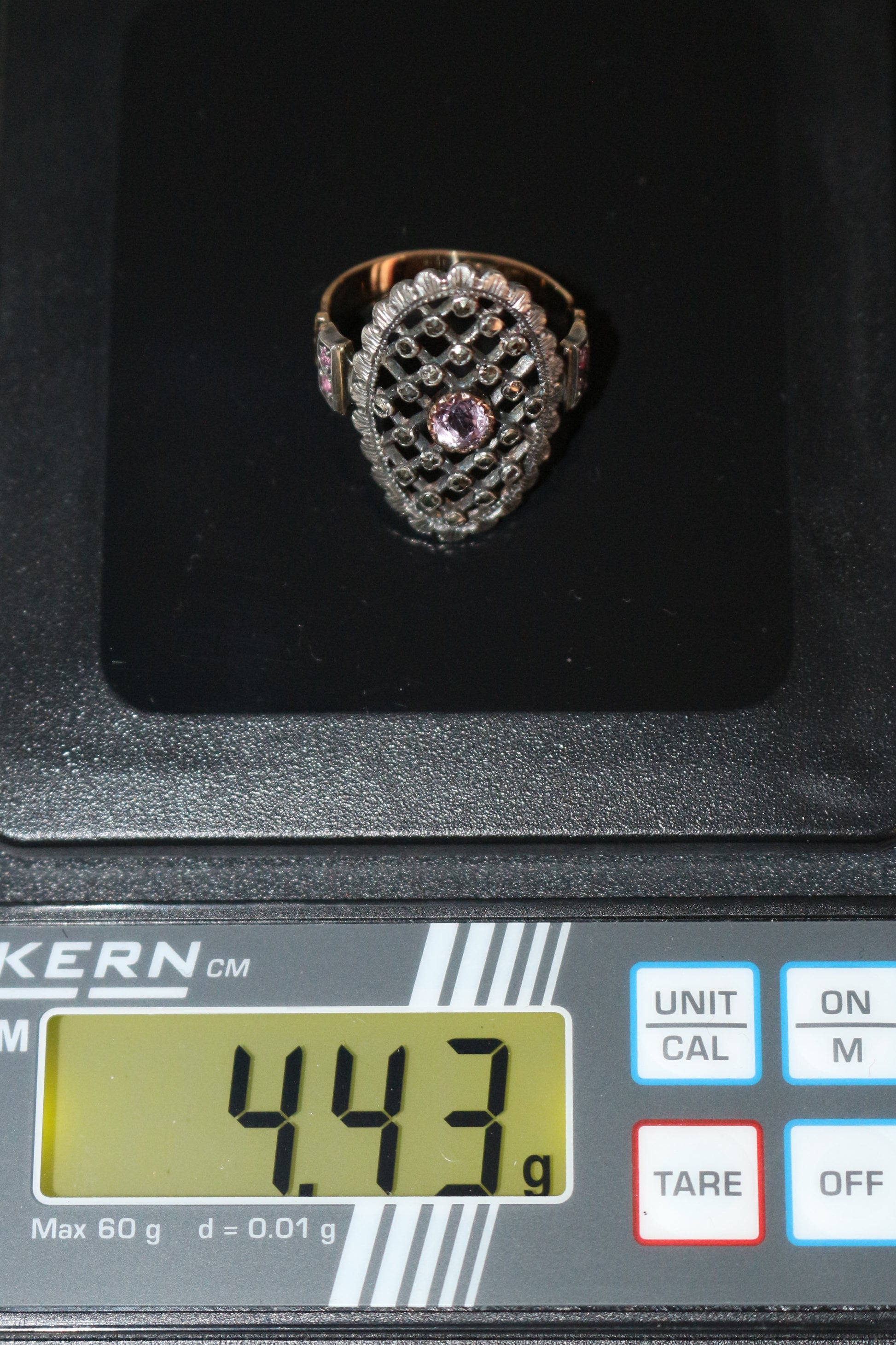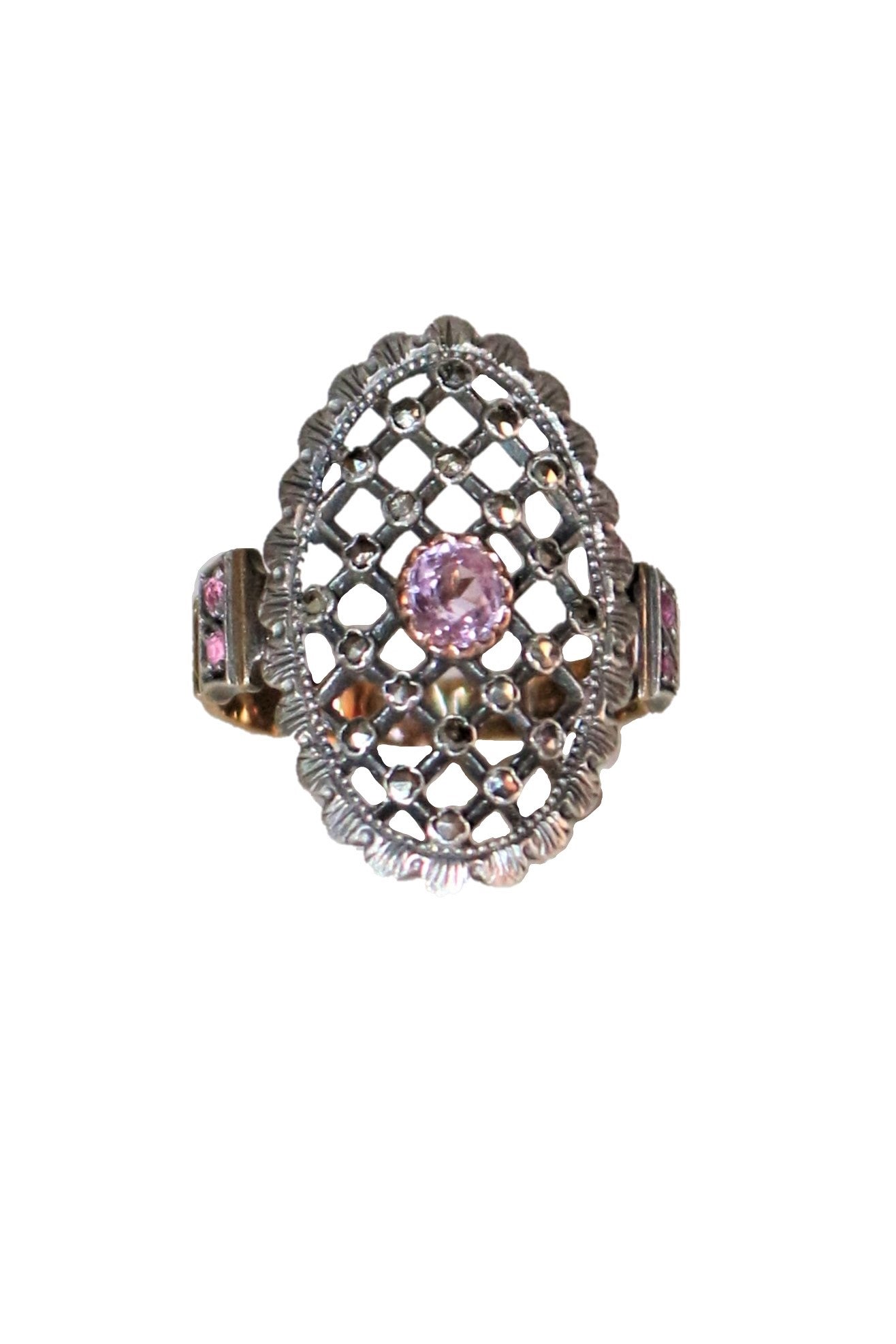 Grande bague marquise en or jaune 750/1000e (18 carats) et argent, formée d'une résille sertie de petites pierres marcassites (pyrites), d'une améthyste centrale et de 4 petites pierres roses sur les côtés, datée du début XXe Belle Epoque.
