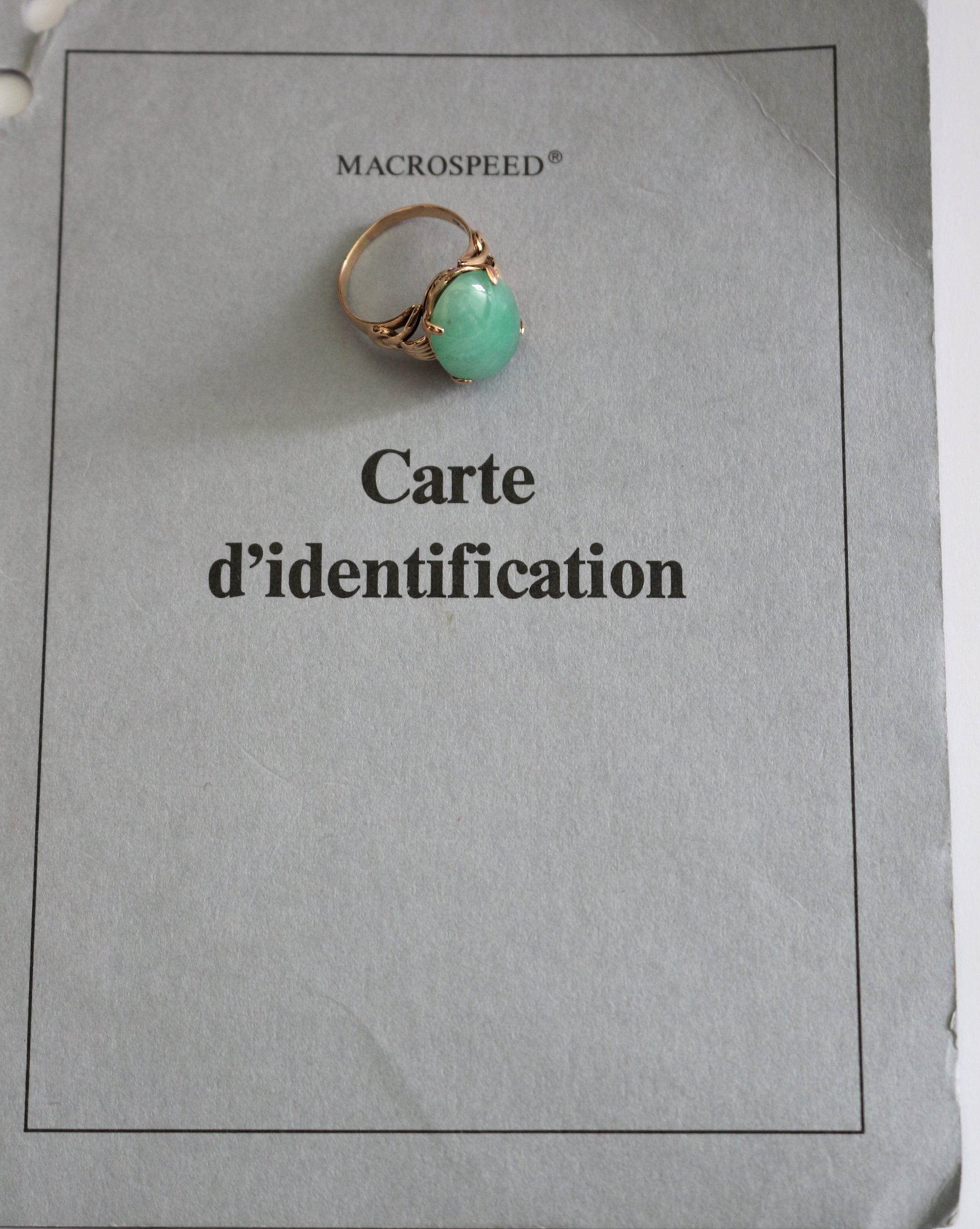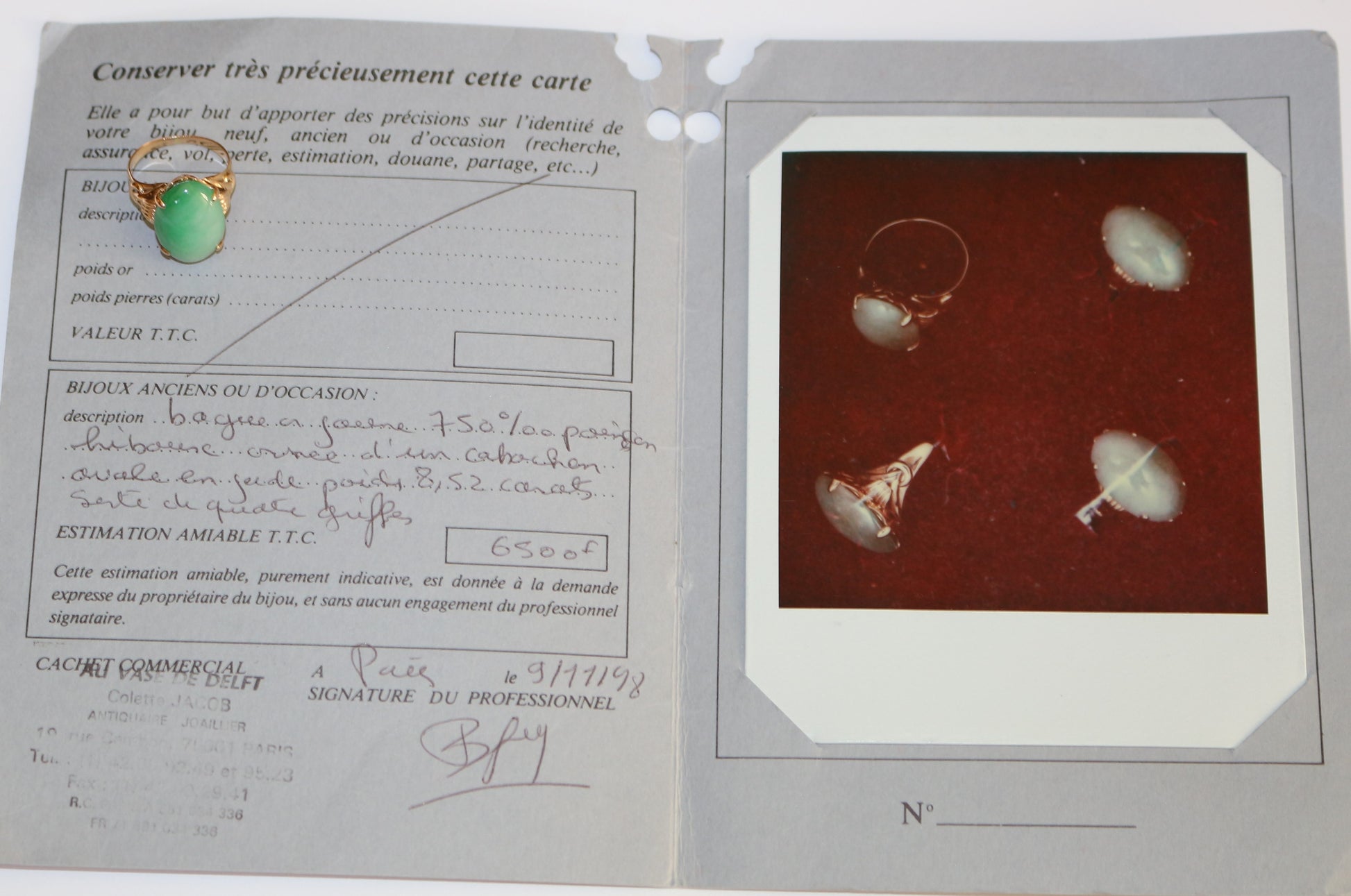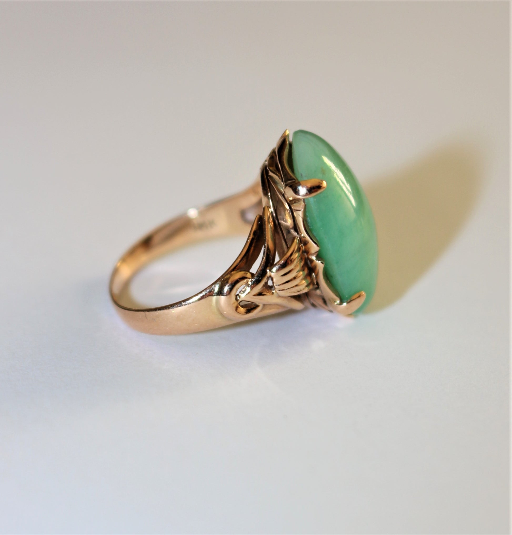 Bague-chevalière en or jaune 750/1000e (18k) de style égyptisant ornée d’un cabochon ovale de jade jadéite serti de quatre griffes