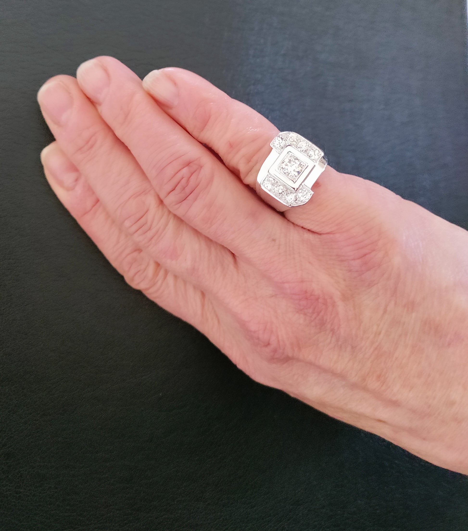 Bague chevalière Art Déco, années 1930, en or blanc 750/1000e (18 carats) et platine, présentant un motif géométrique décalé serti de 9 diamants taille ancienne et demi-taille.