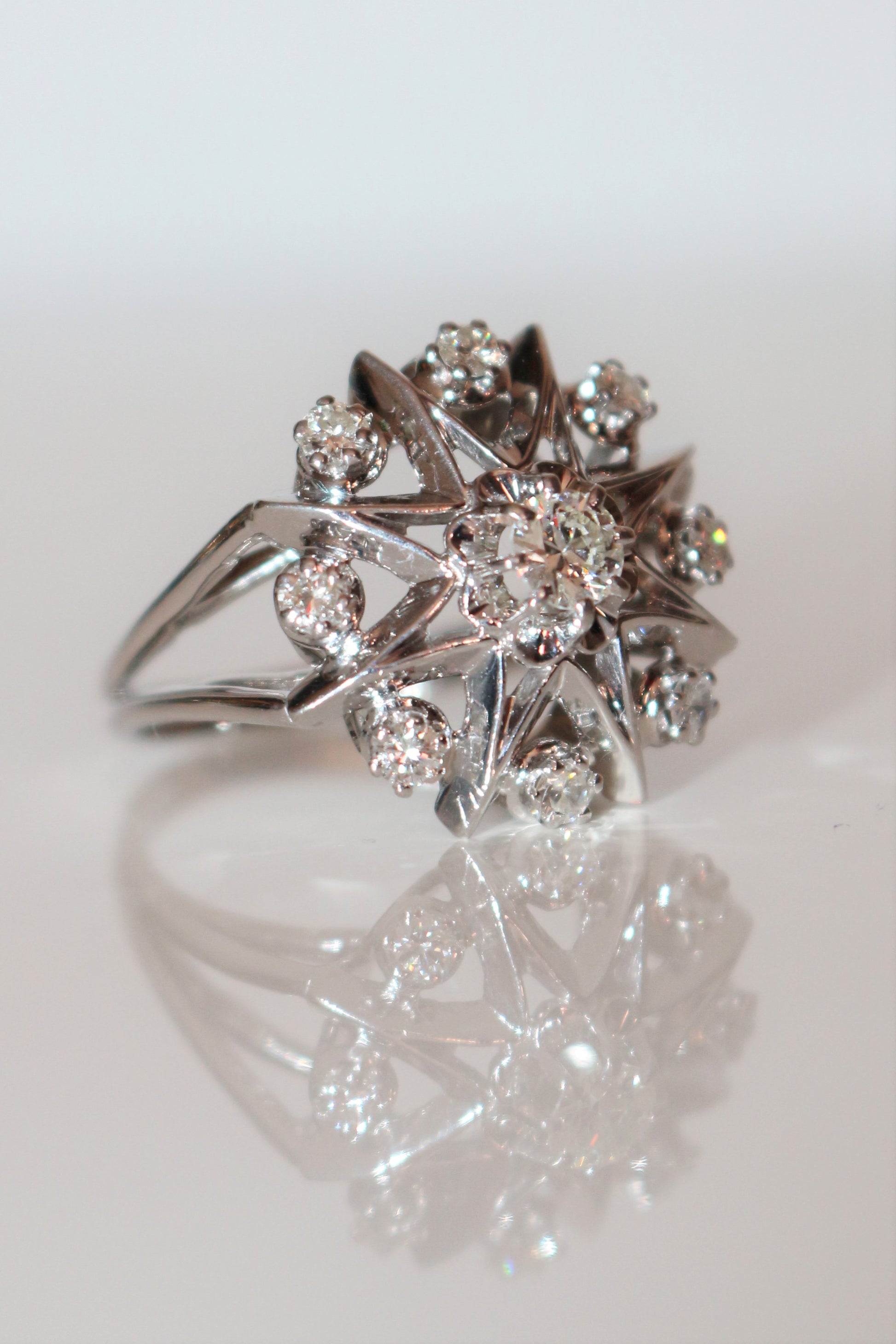 Bague Etoile en or gris 750/1000e (18k) ajourée, ponctuée de 8 diamants taille brillant de 2 mm (pour un total de 0,40 ct) et centrée d'un diamant taille brillant de 0,30 ct (4 mm / 3 mm). Total estimé de 0,70 ct. Travail français des années 60.