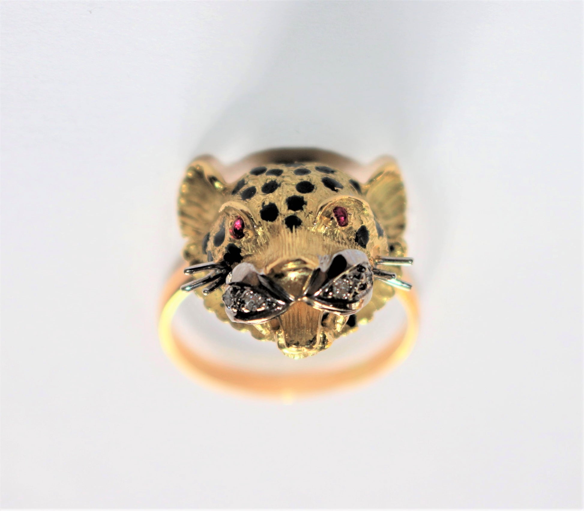 Bague félin en or jaune 750/1000e (18 carats) émaillée, 4 petits brillants et 2 petits rubis