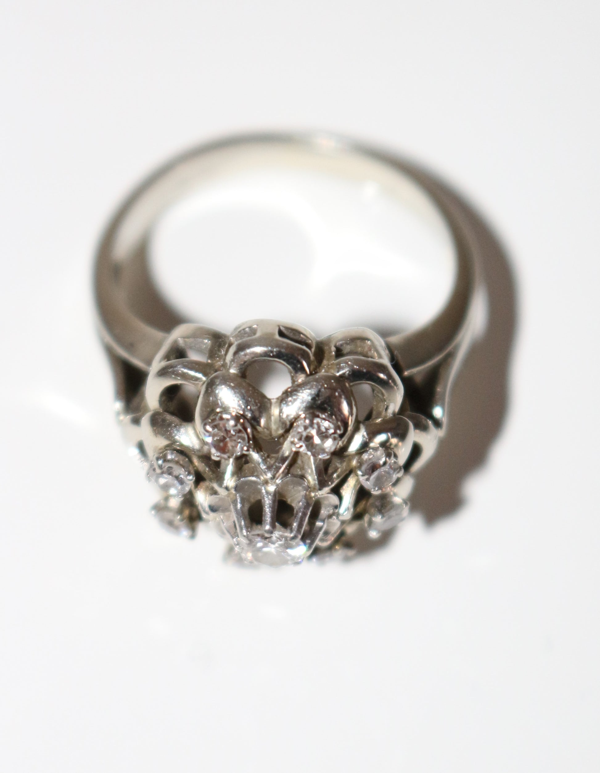 Bague marguerite en platine min 850/1000e et or blanc 750/1000e, des années 50, monture ajourée sertie de 8 petits diamants et centrée d'un diamant rond d'environ 0.15 ct (3,4 mm)