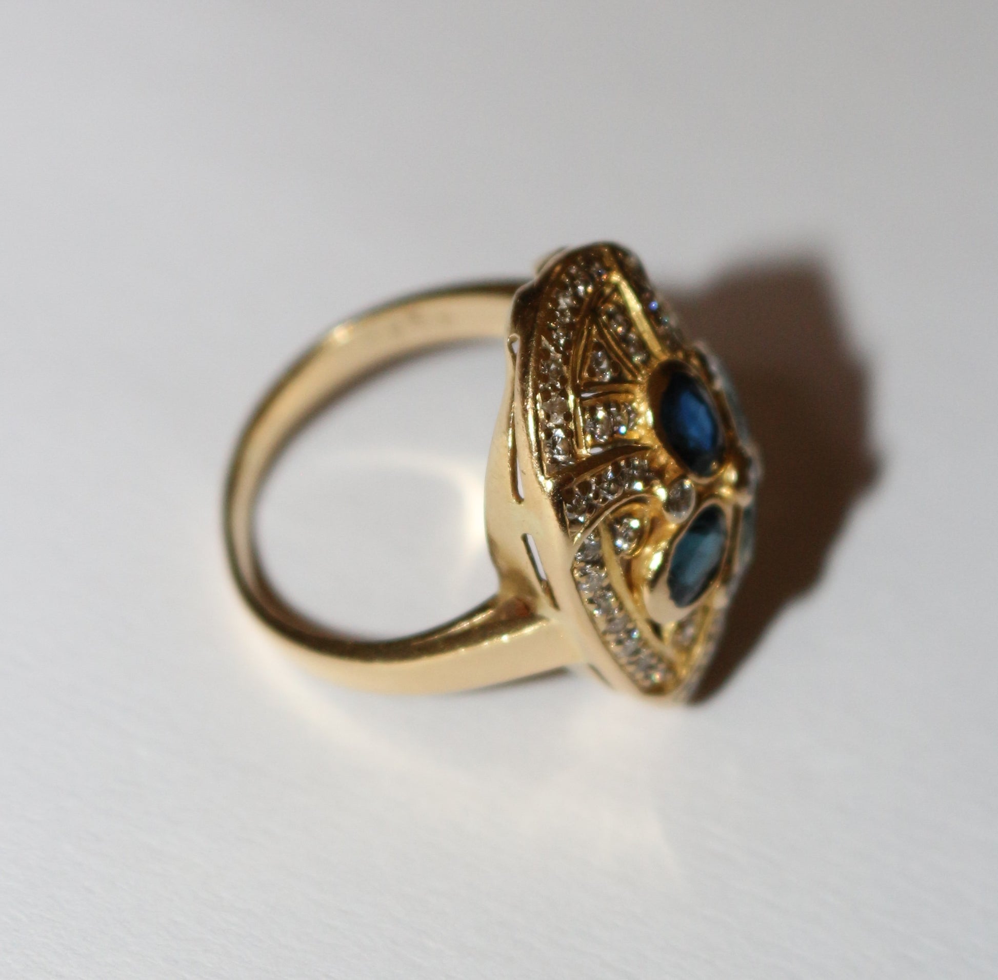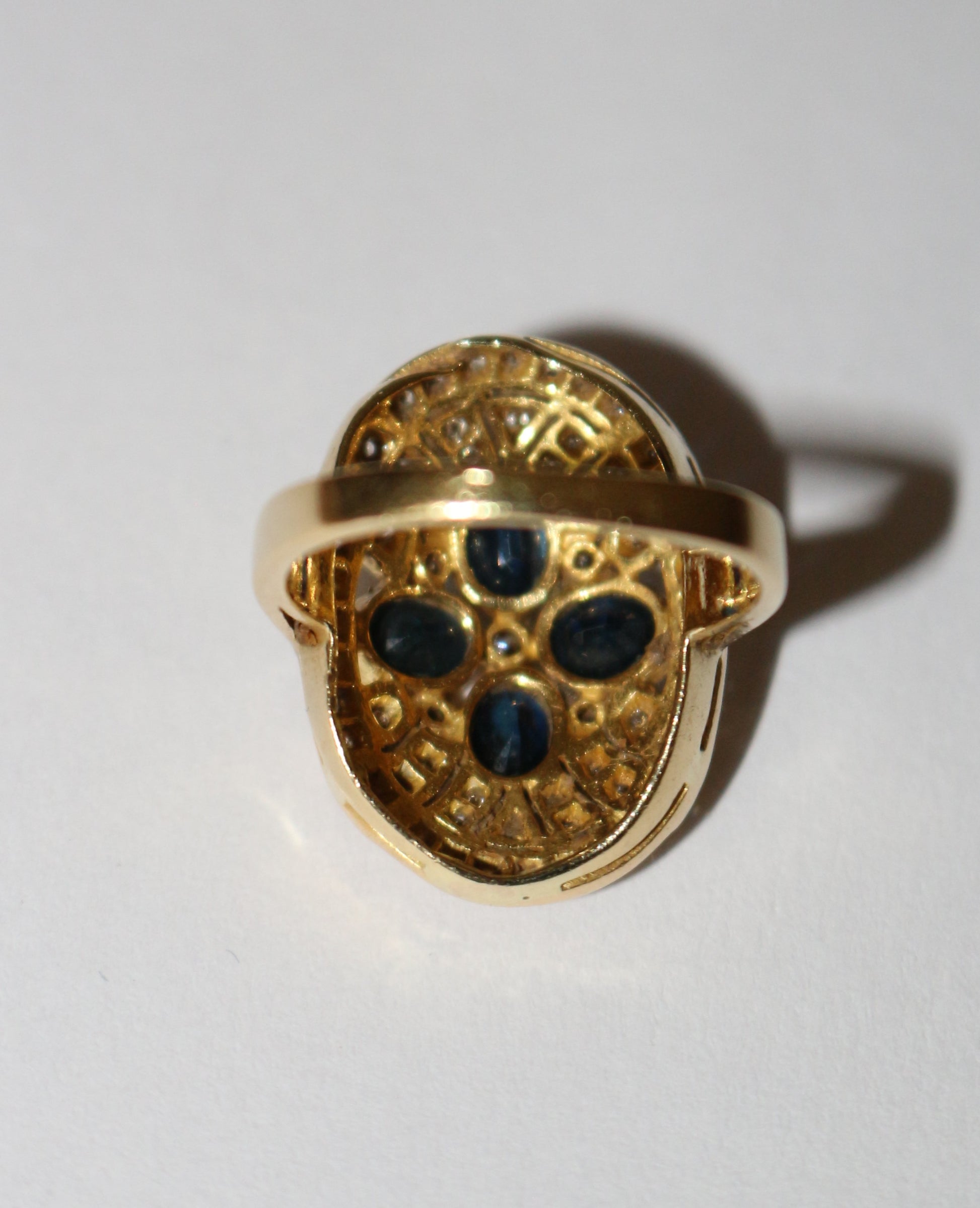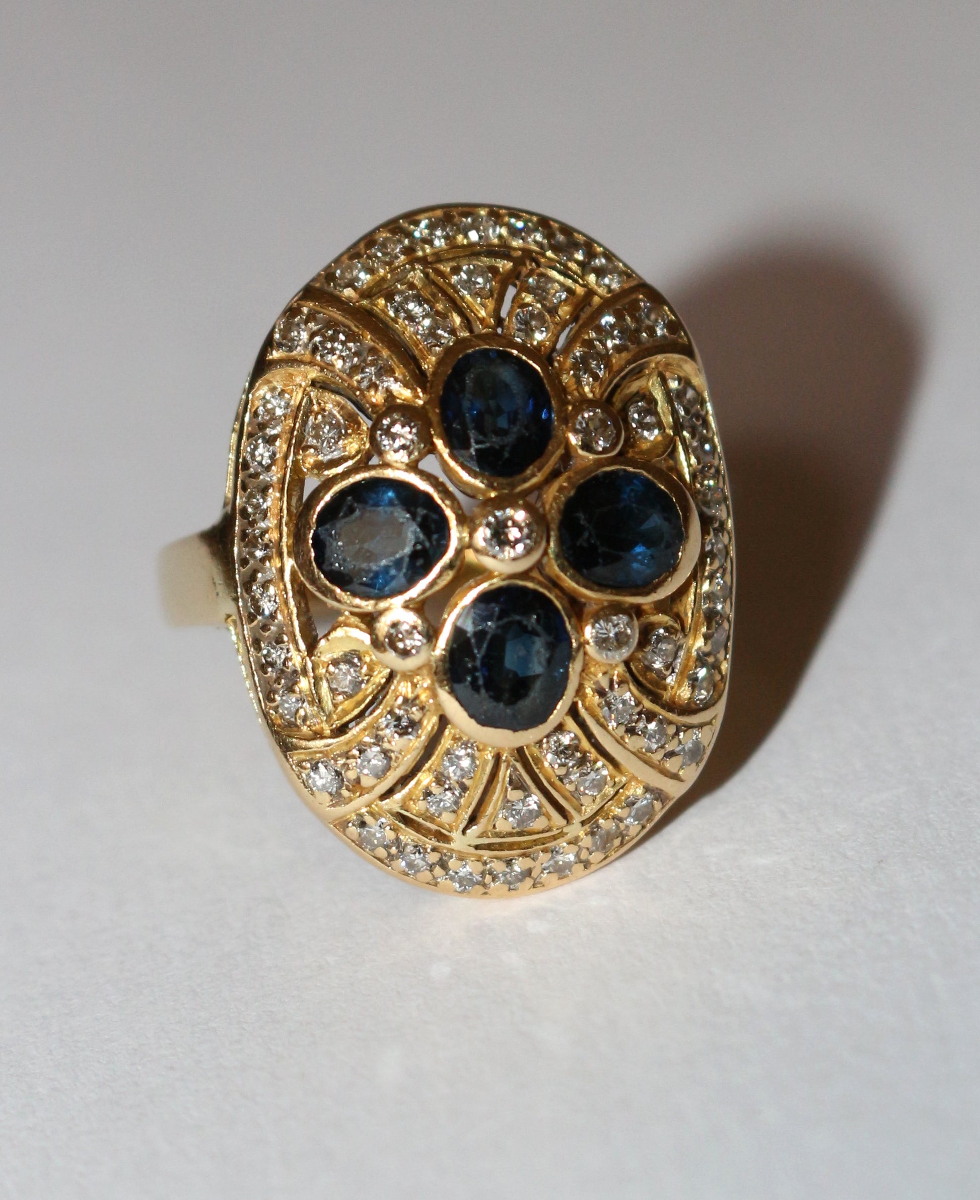 Bague à chaton ovale rayonnant en or jaune 750/1000e (18 carats), sertie clos de 4 saphirs ovales facettés  (pour un total de 0.96 ct) et de diamants taille brillant. Beau travail ajouré des années 80-90.
