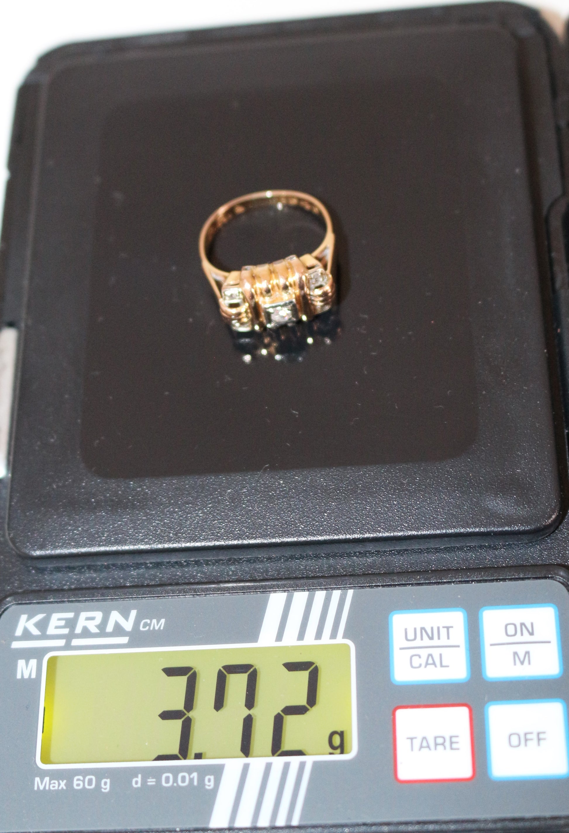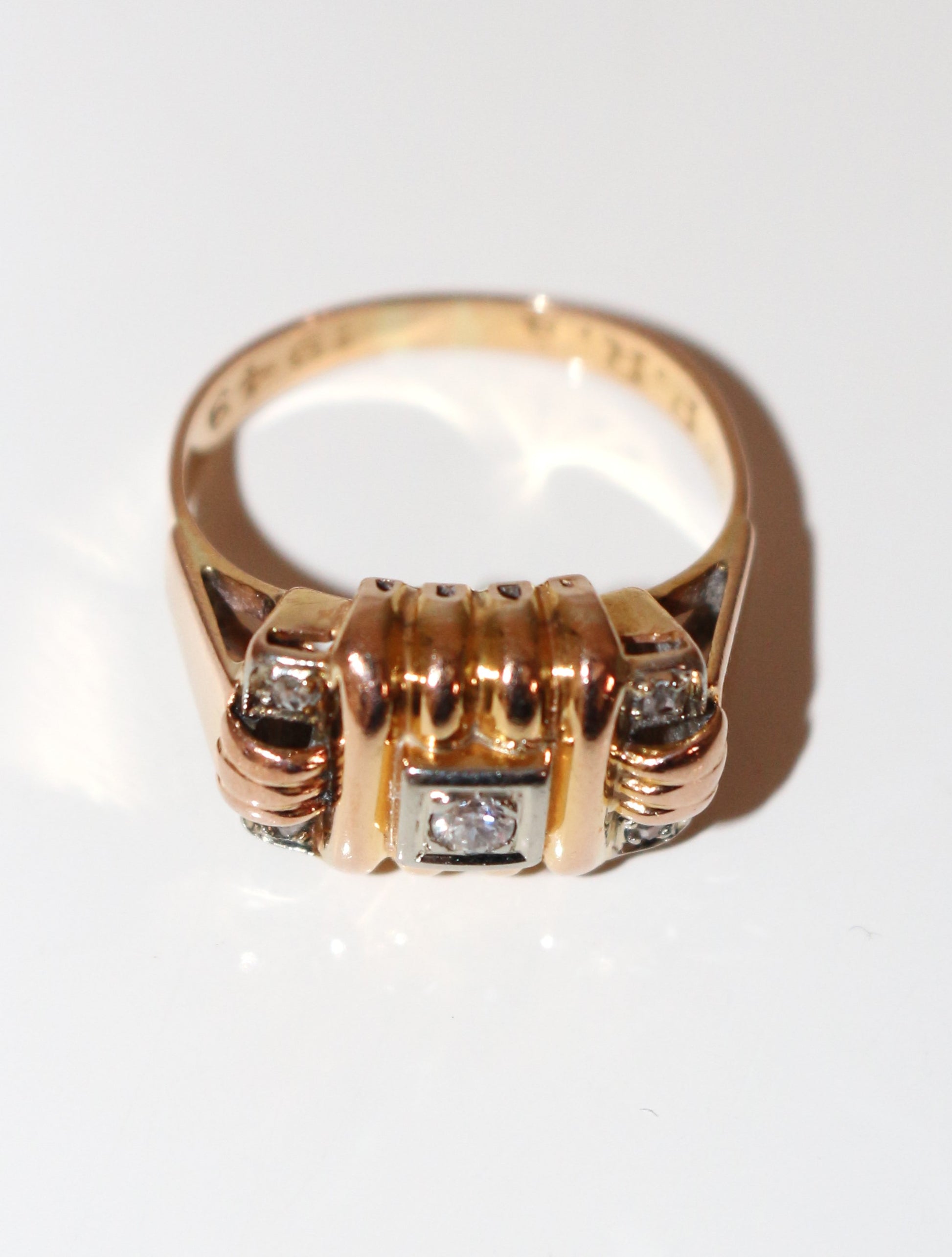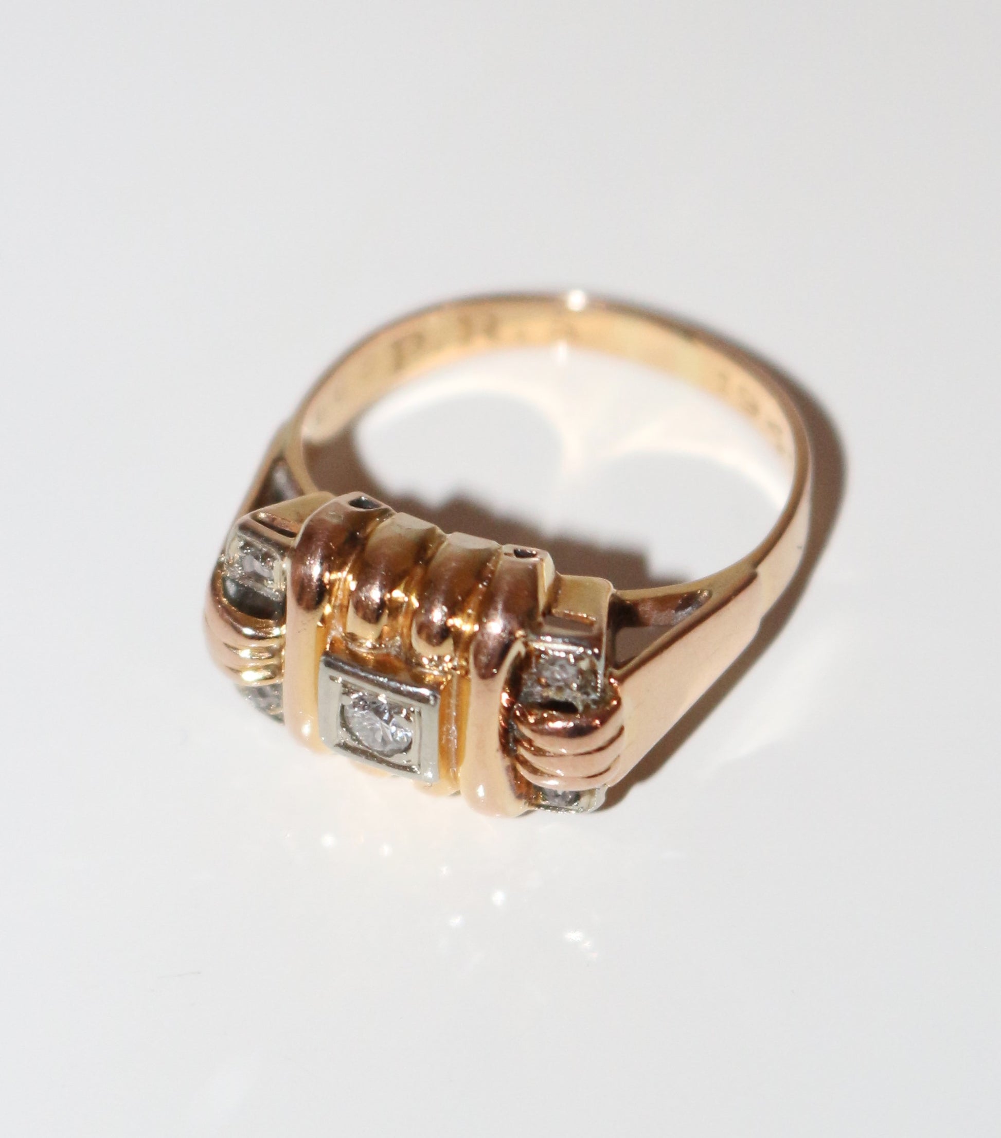 Jolie bague rétro en or jaune et or blanc 750/1000e à godrons, centrée d'un petit diamant rond et sertie de 4 petits diamants taille rose, datée à l'intérieur de 1949