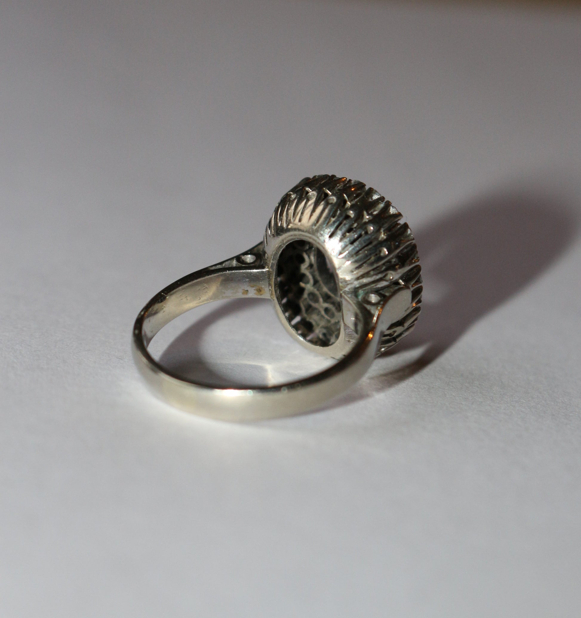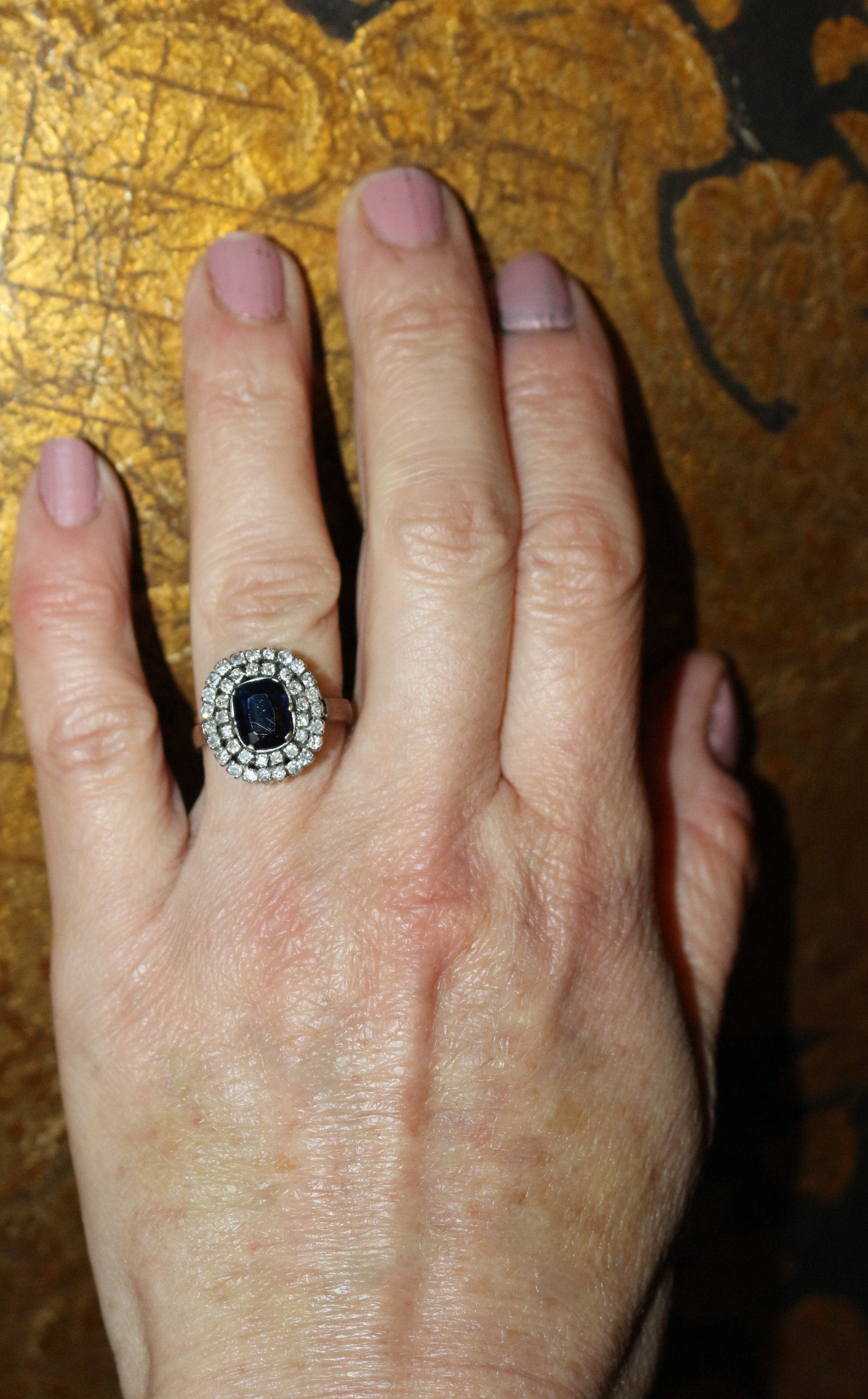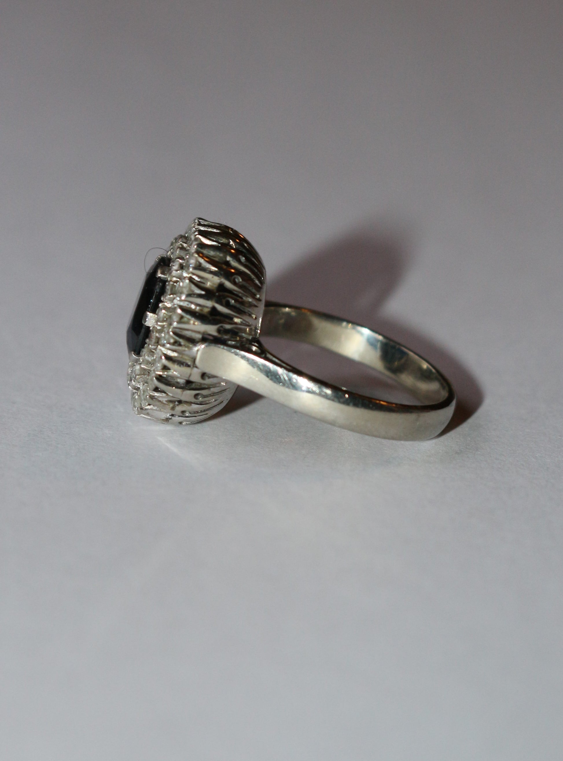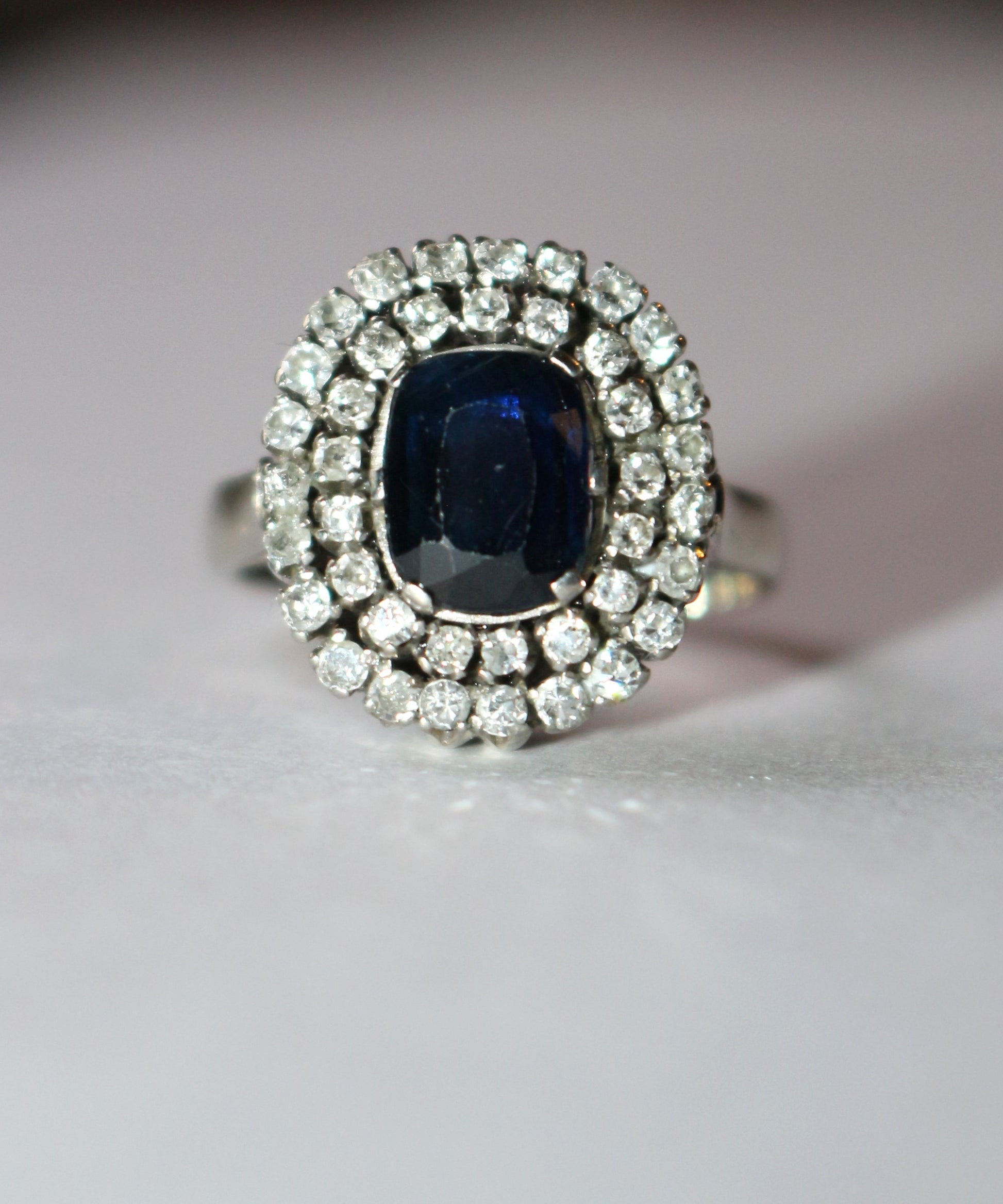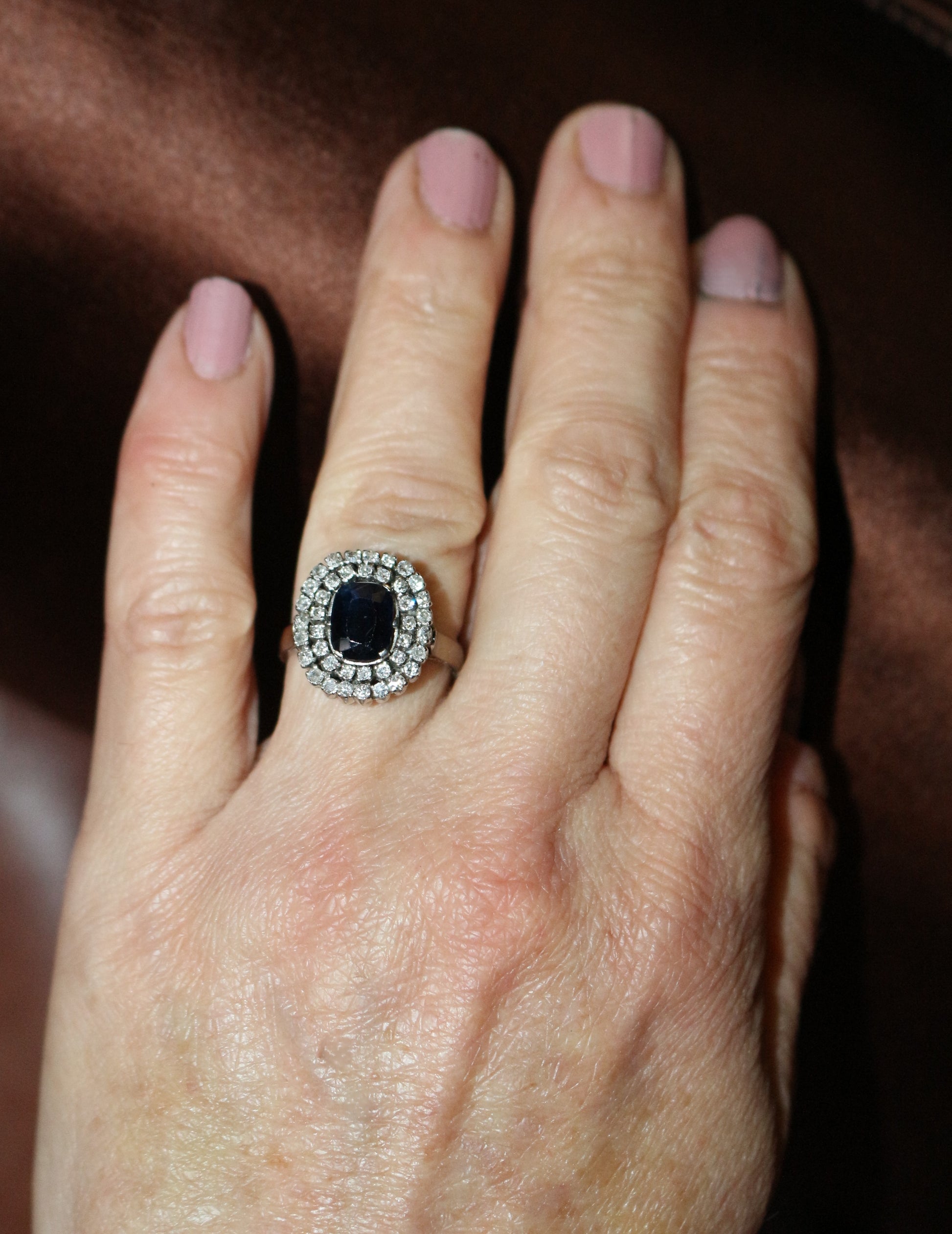 Bague en or gris 750/1000e (18 carats) vintage (années 70), sertie d'un saphir ovale facetté foncé, posé sur un double entourage de diamants taille brillant.
