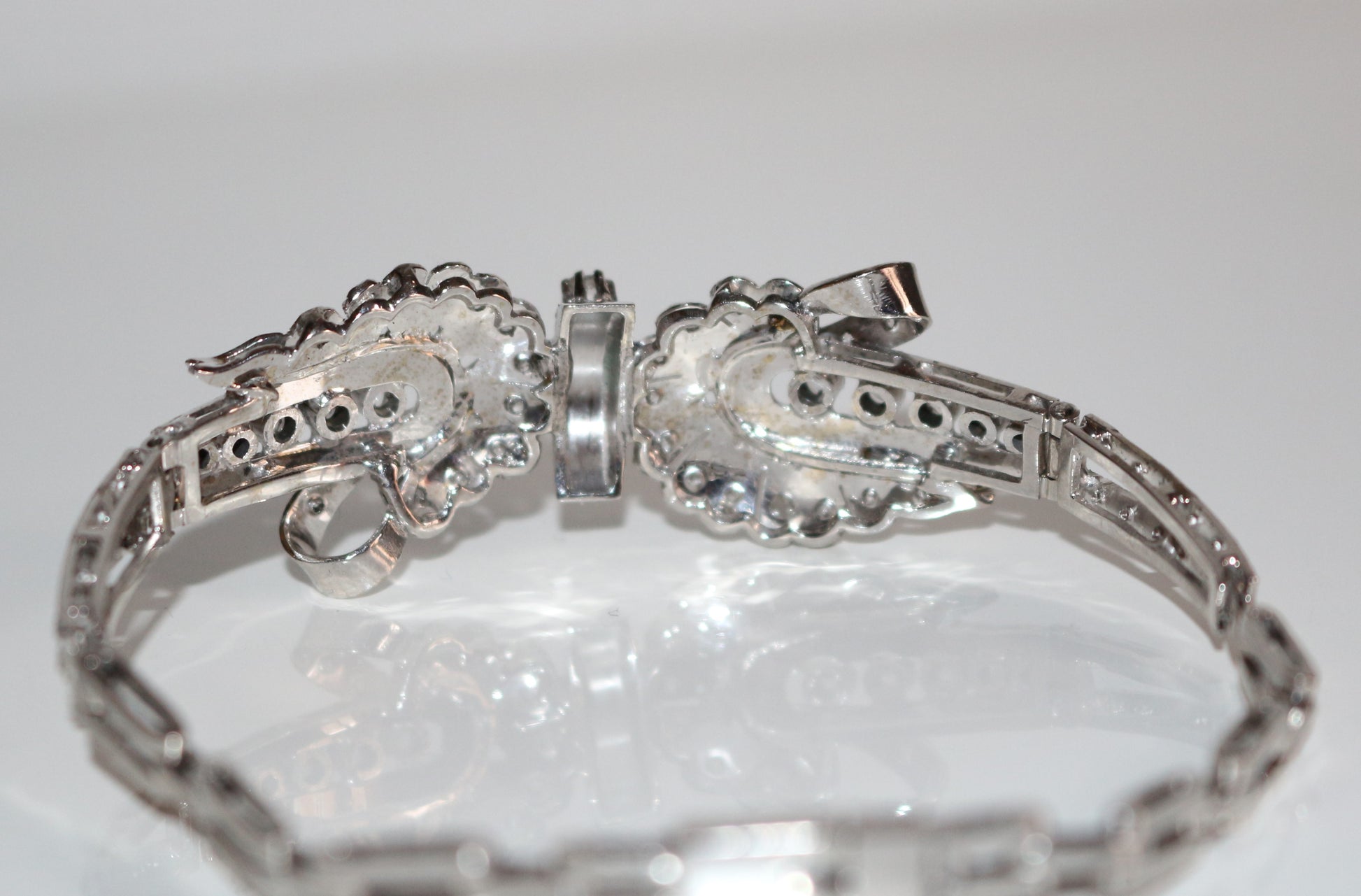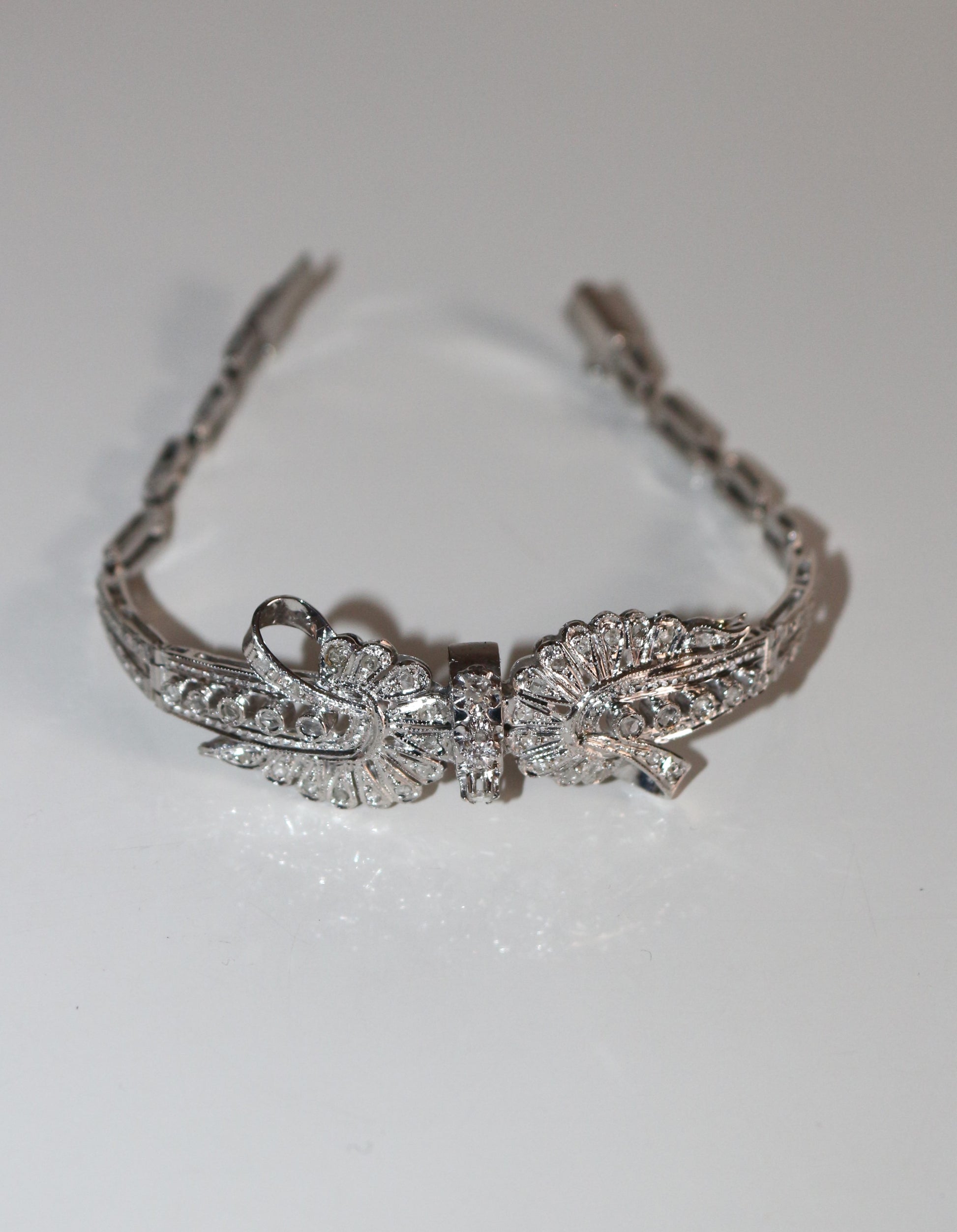 Bracelet en or blanc 18 carats 750/1000e à double volute et ruban, serti de petits diamants, taille rose, dont trois centraux et 5 en chute de part et d'autre. Le diamant central est taillé brillant. Travail des années 60-70, étranger. De style Art Déco.
