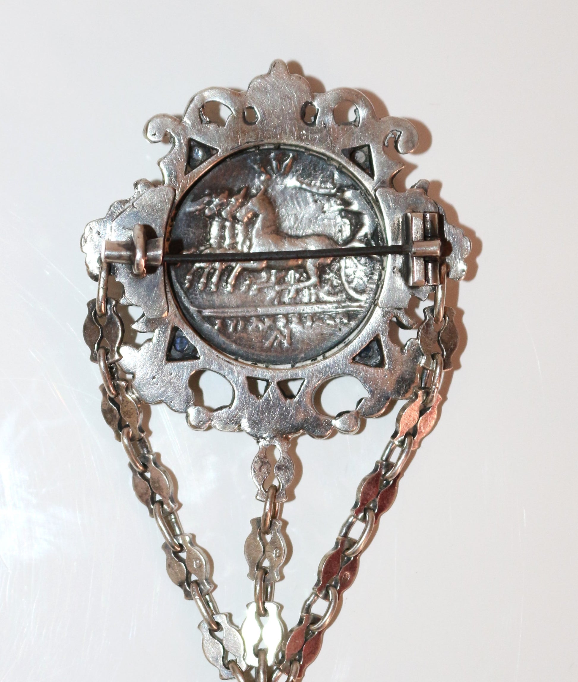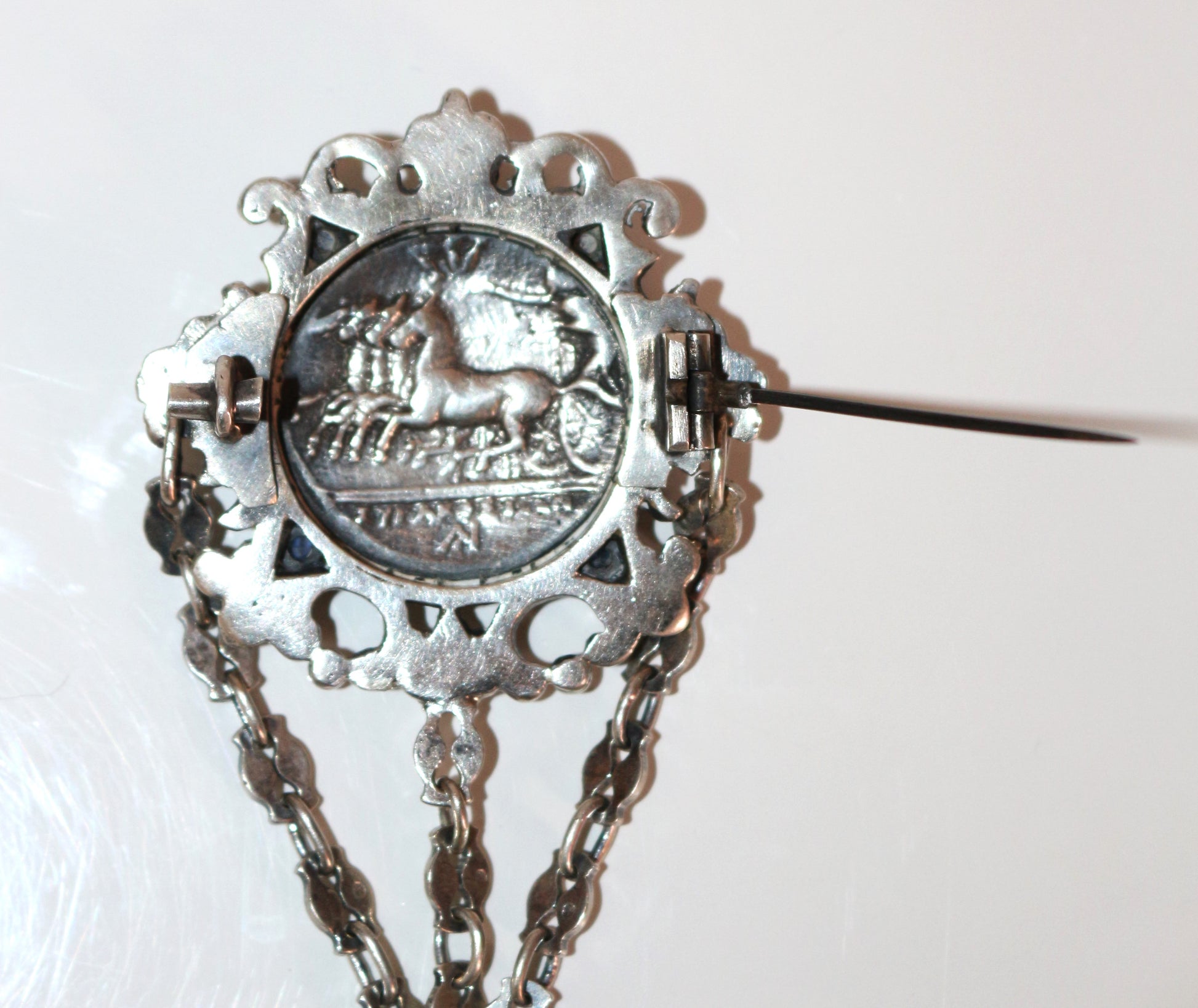 Broche châtelaine fin XIXe (1880) centrée d'un tétradrachme représentant la tête d'Aréthuse (mythologie grecque, nymphe du cortège d'Artémis) entourée de quatre dauphins à l'avers et d'un quadrige bondissant conduit par un aurige au revers.