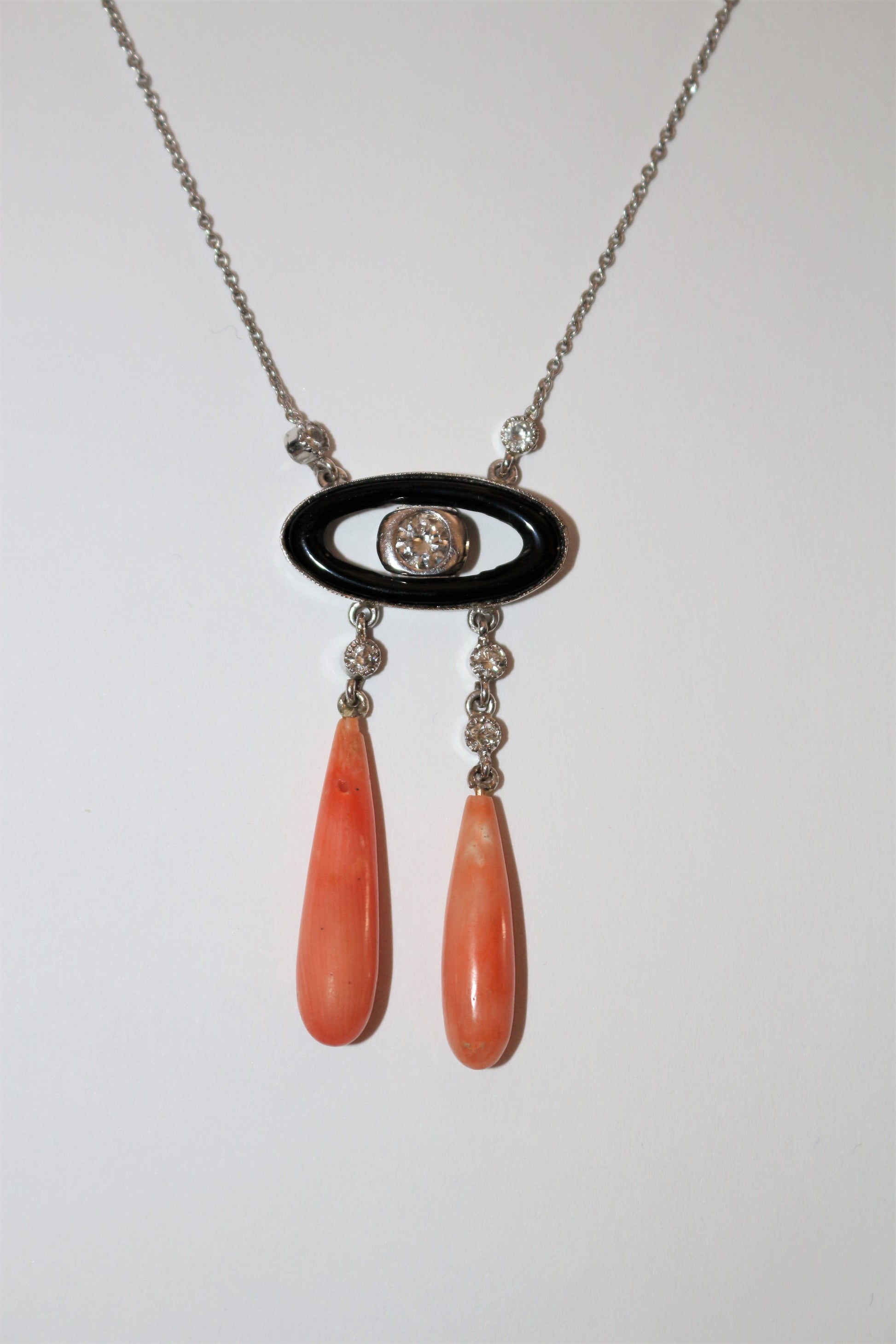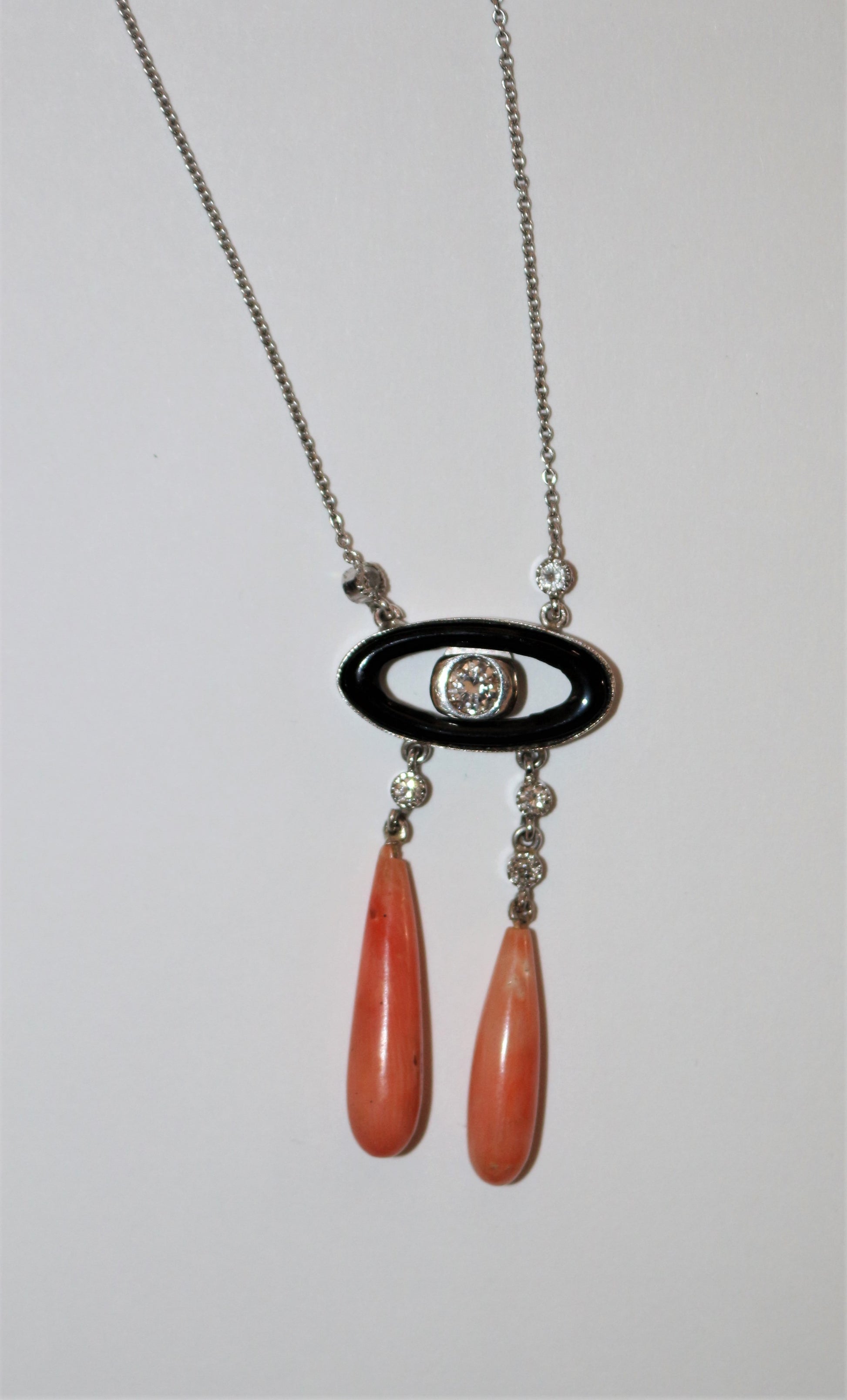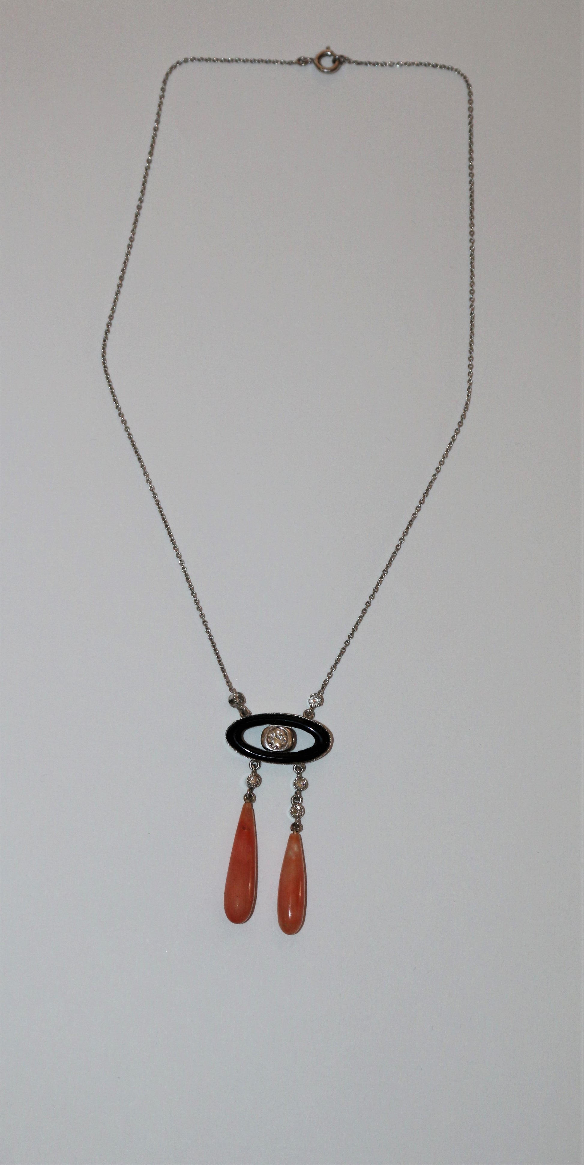 Collier "Négligé" ras de cou en or gris 750/1000e (18 carats), orné d'un motif en onyx centré d'un diamant taille brillant d'environ 4,8 mm, encadré de 5 diamants taille brillant d'environ 2 mm, portant 2 gouttes de corail. Total : 0.55 carat
