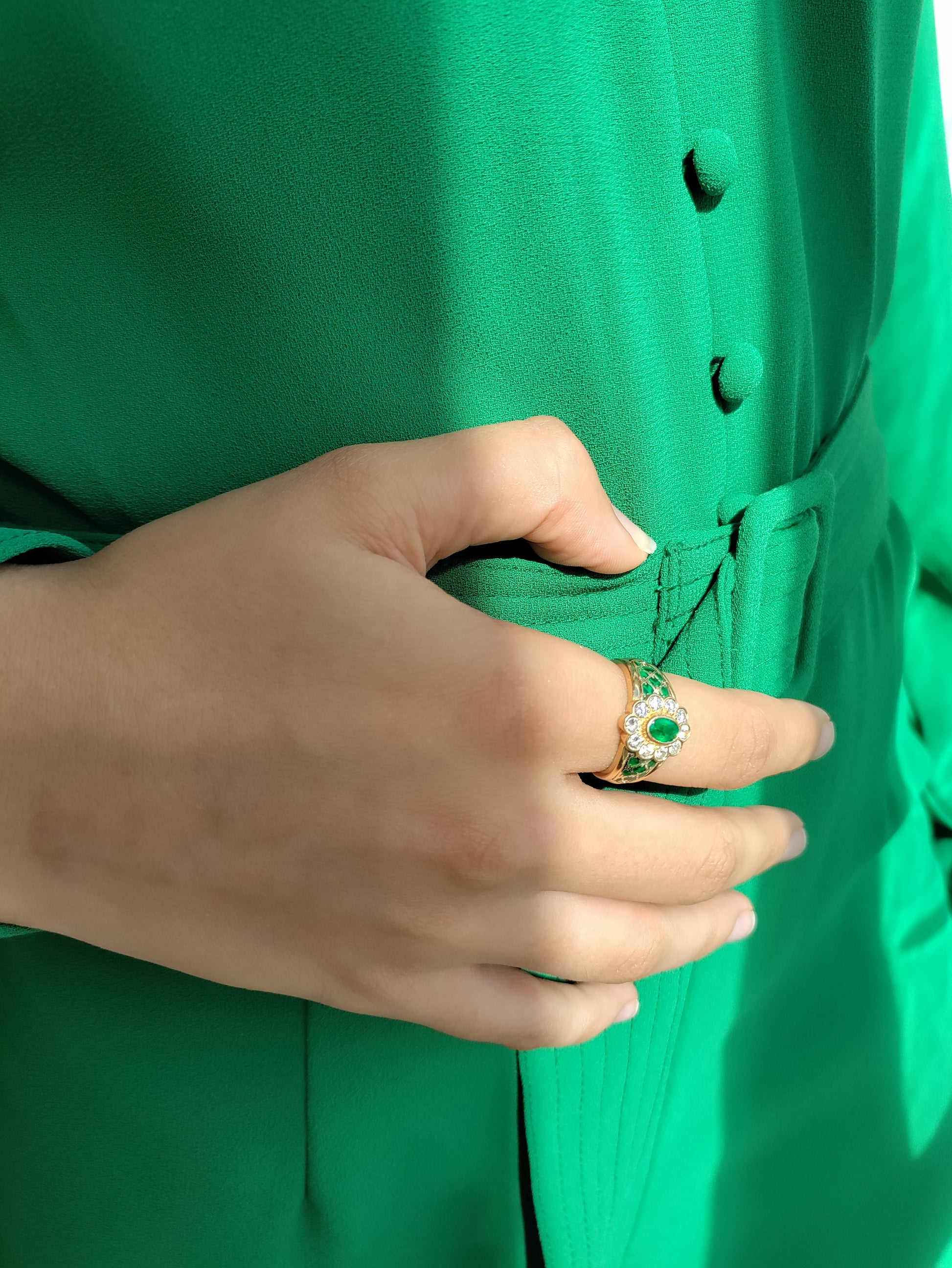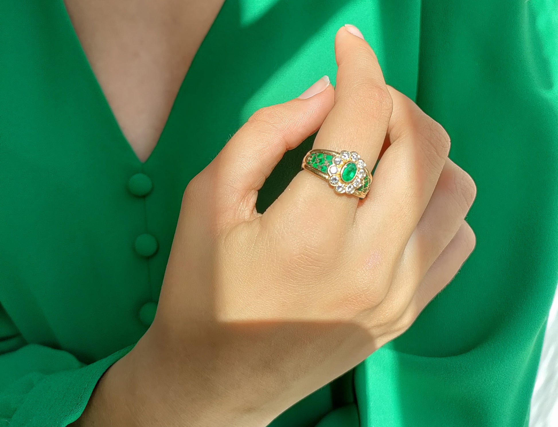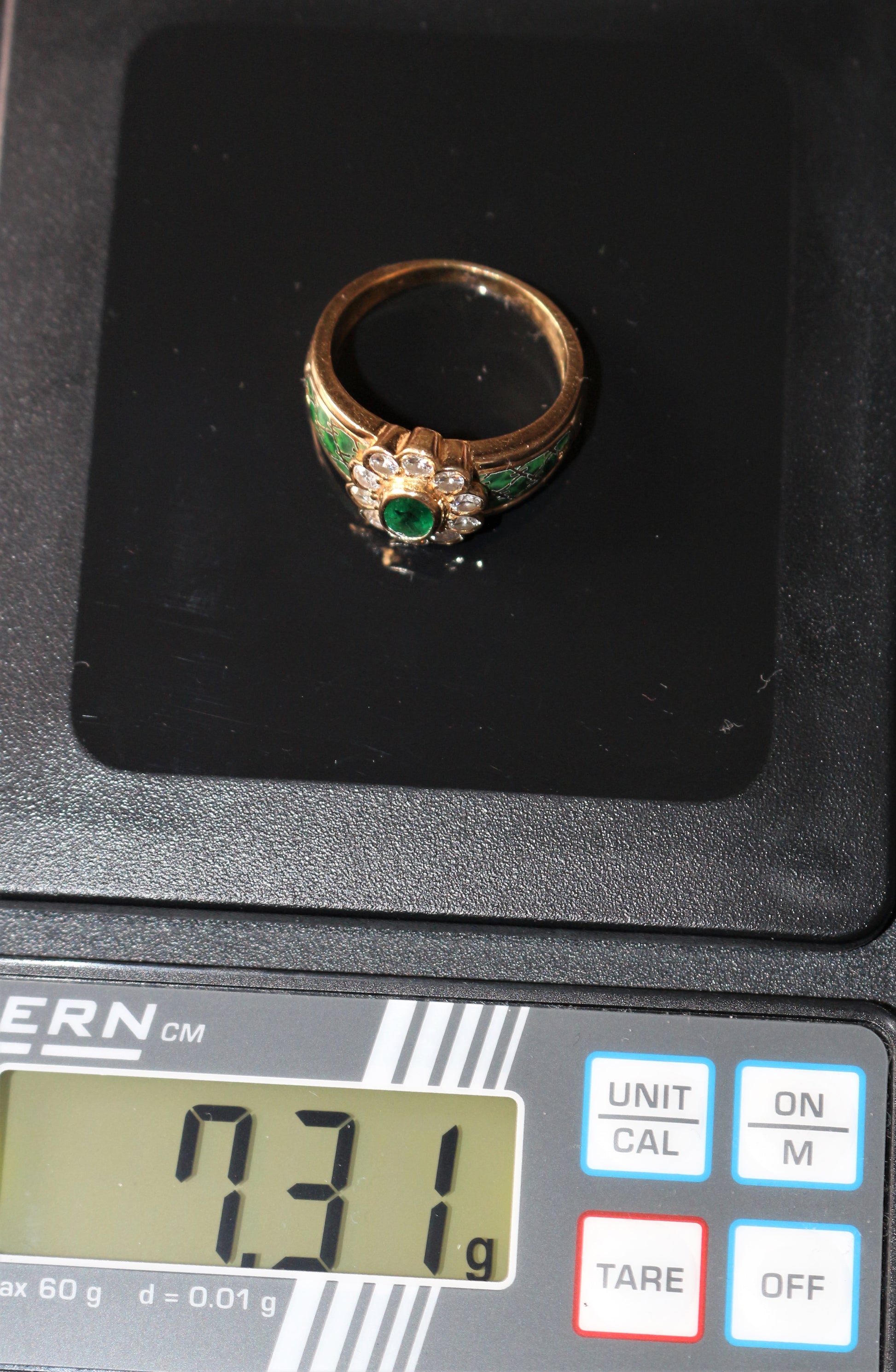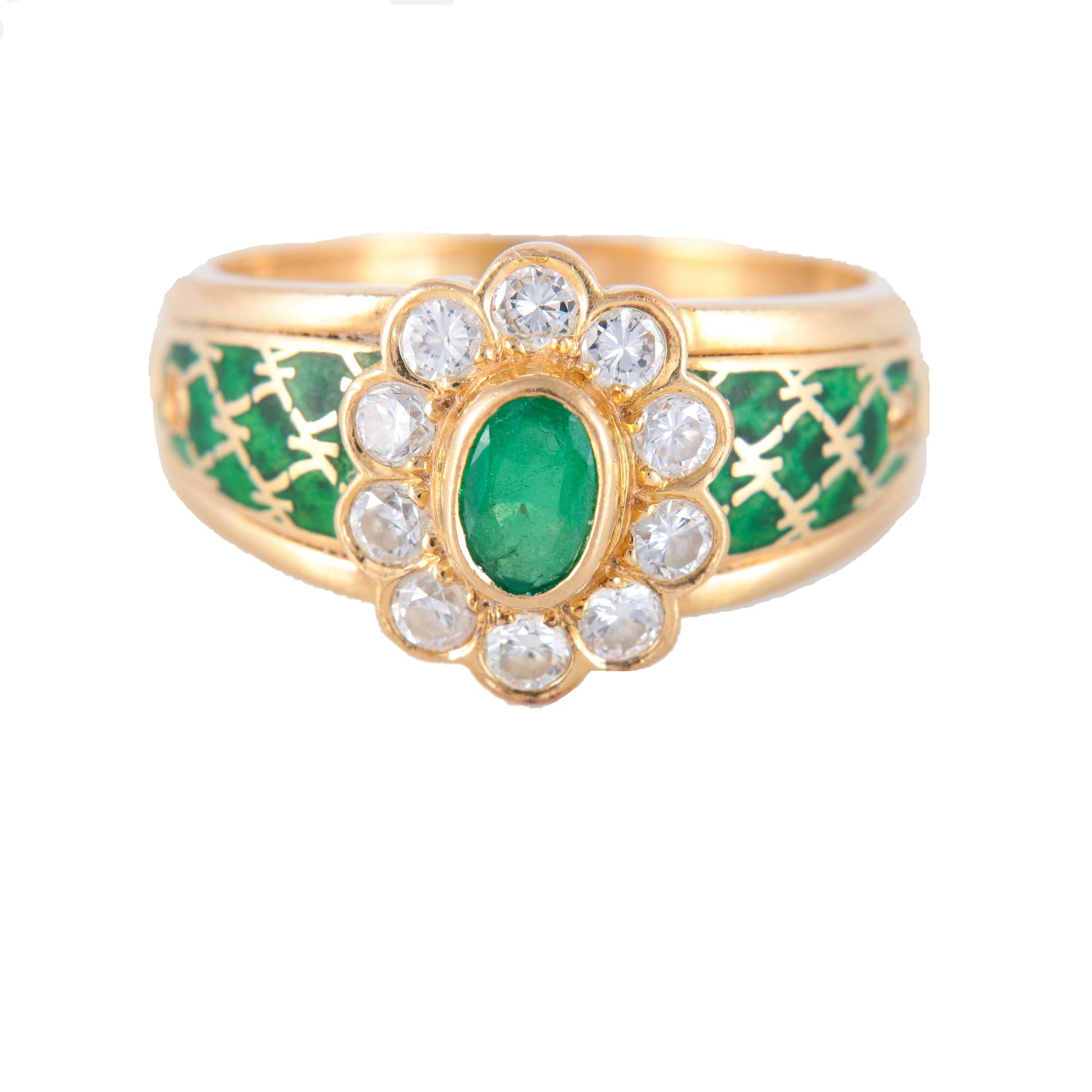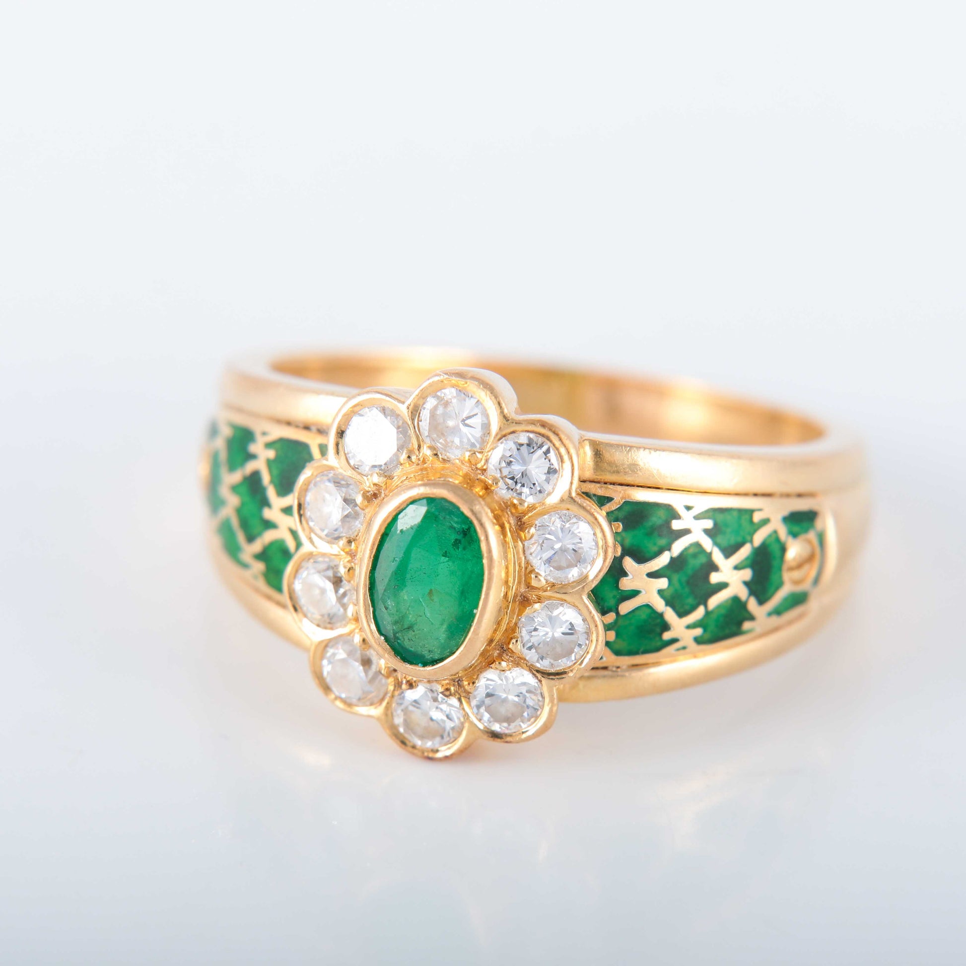Bague Korloff, collection "Enamel", marguerite composée d'une émeraude et de 10 diamants taille brillant, en serti clos, entourage en émail vert avec logo de la marque 2K adossés inversés