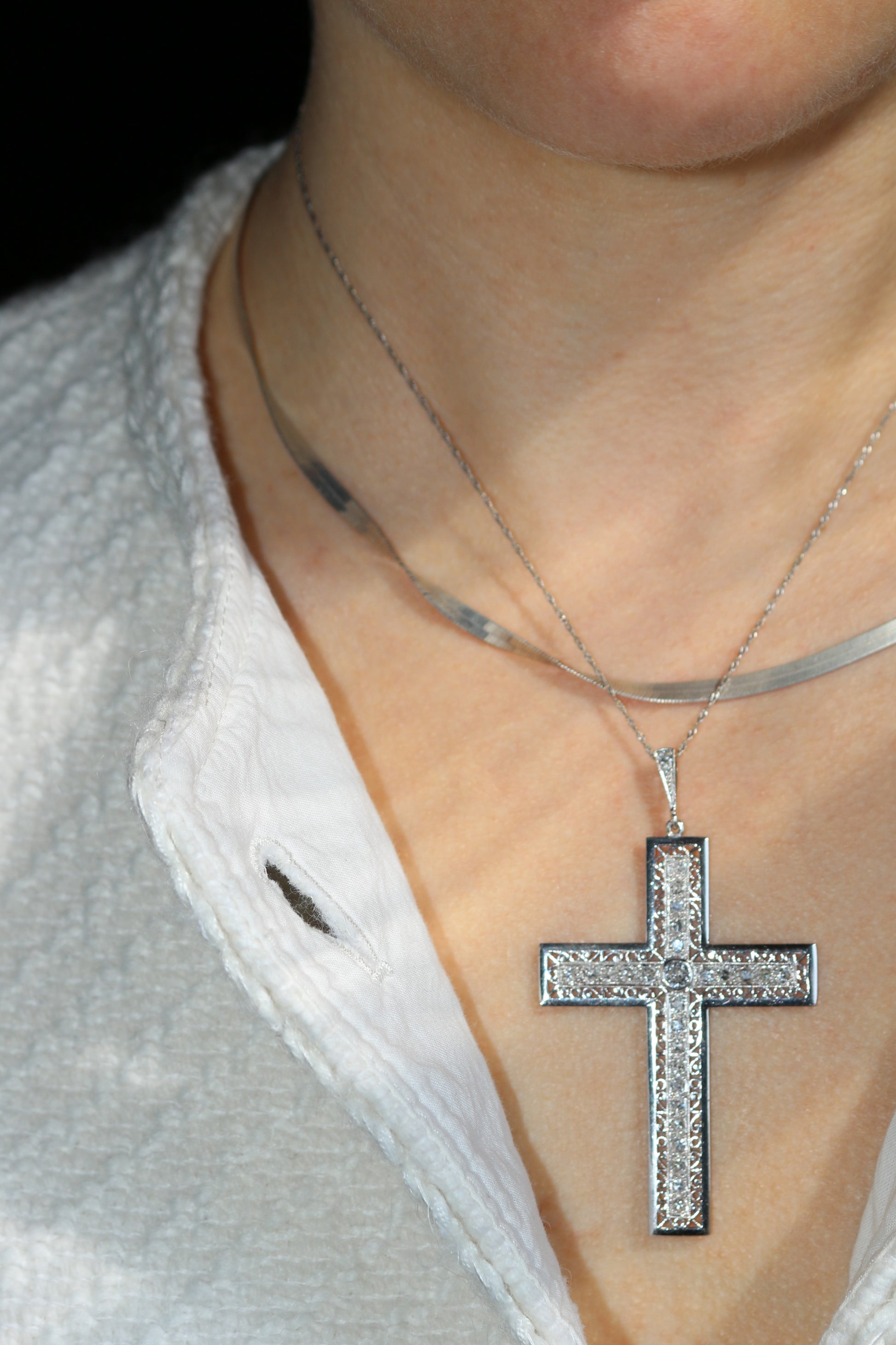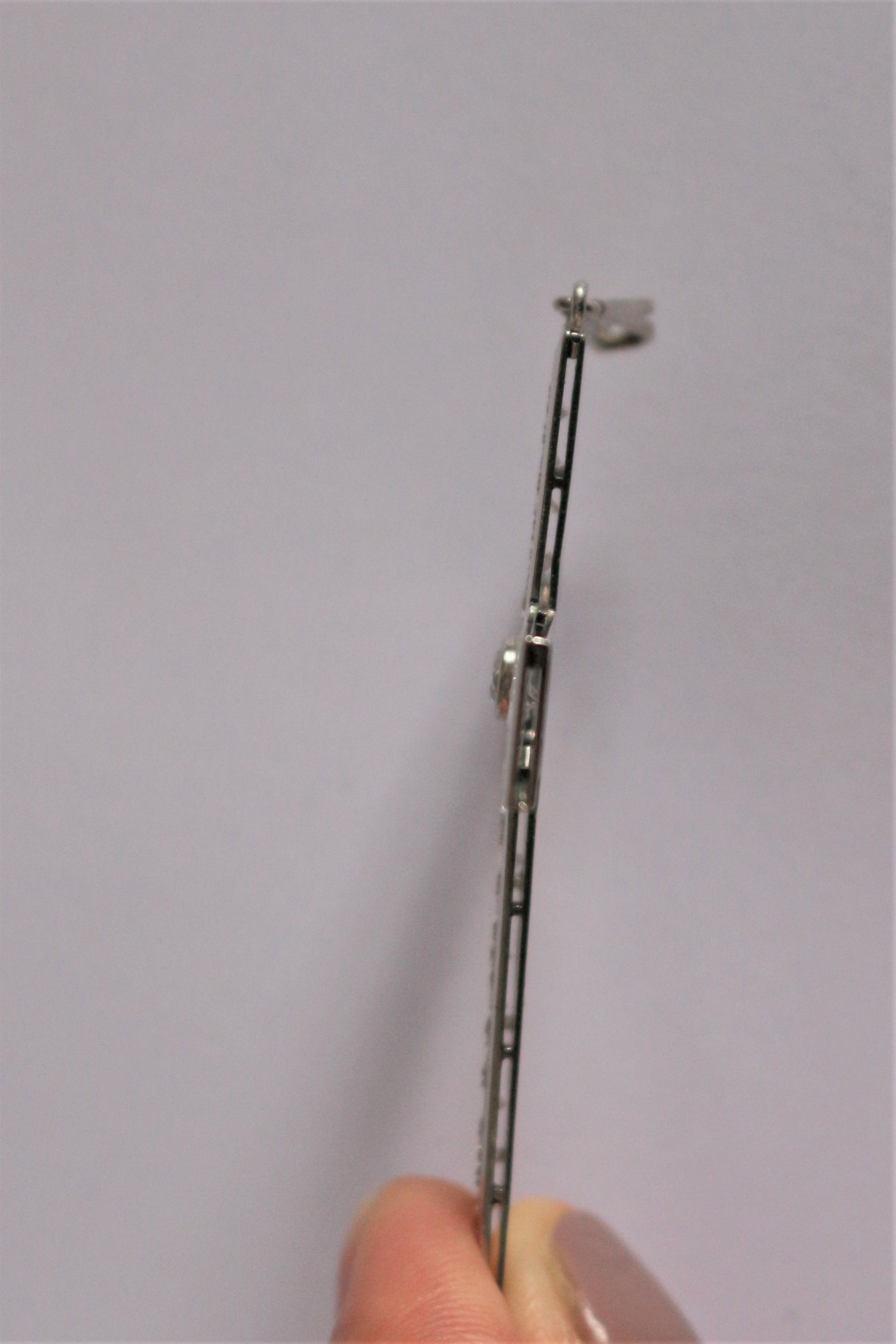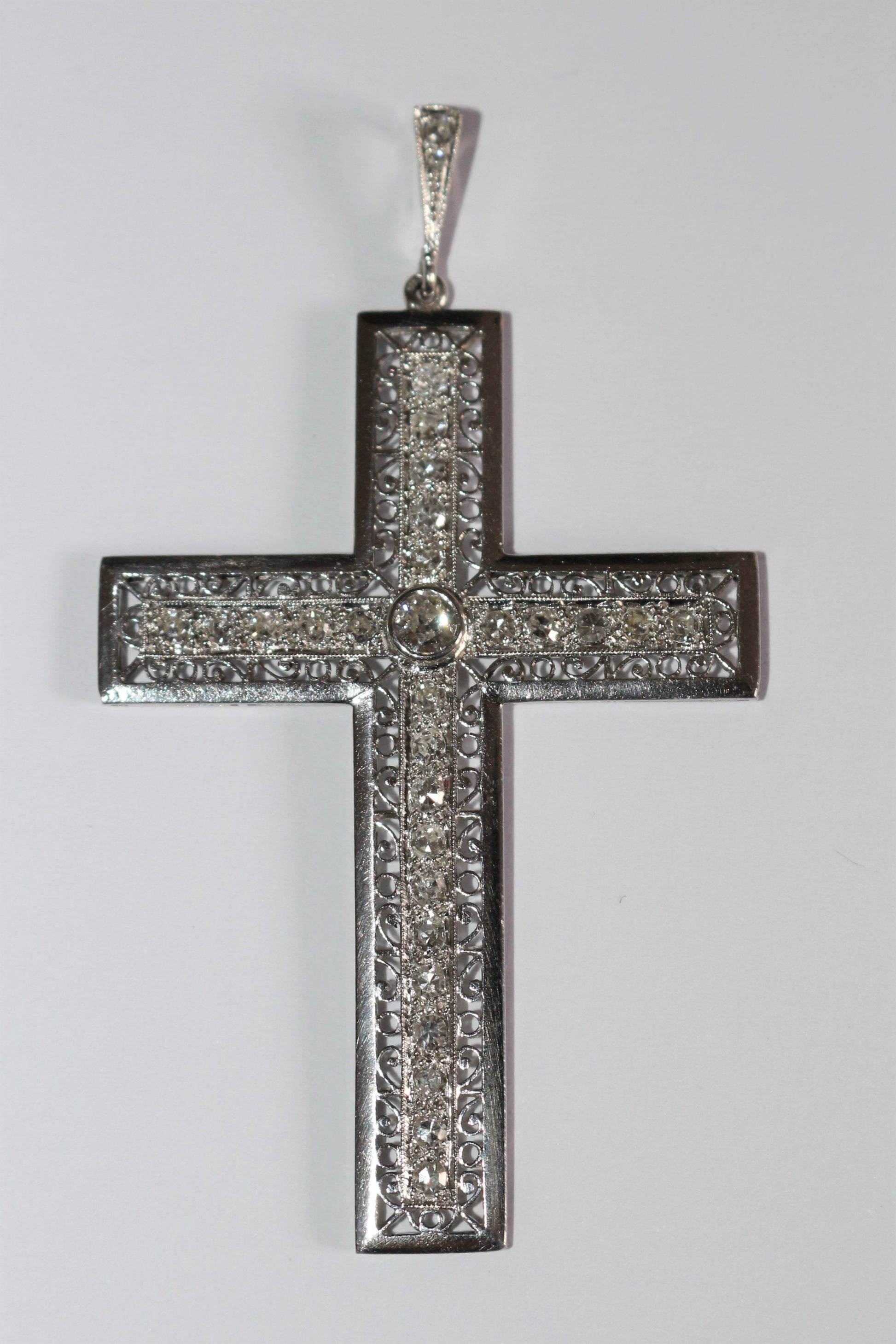 Pendentif Croix en platine (850/1000e) ajouré, à motifs de volutes, serti d'un alignement de diamants taille 8/8 et ancienne, Art Déco. Bélière en diamants.